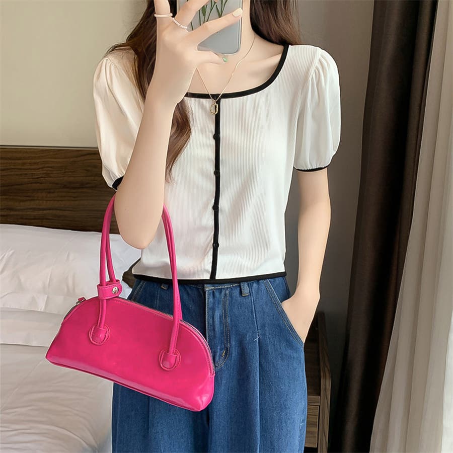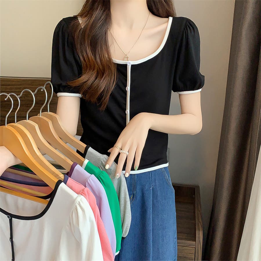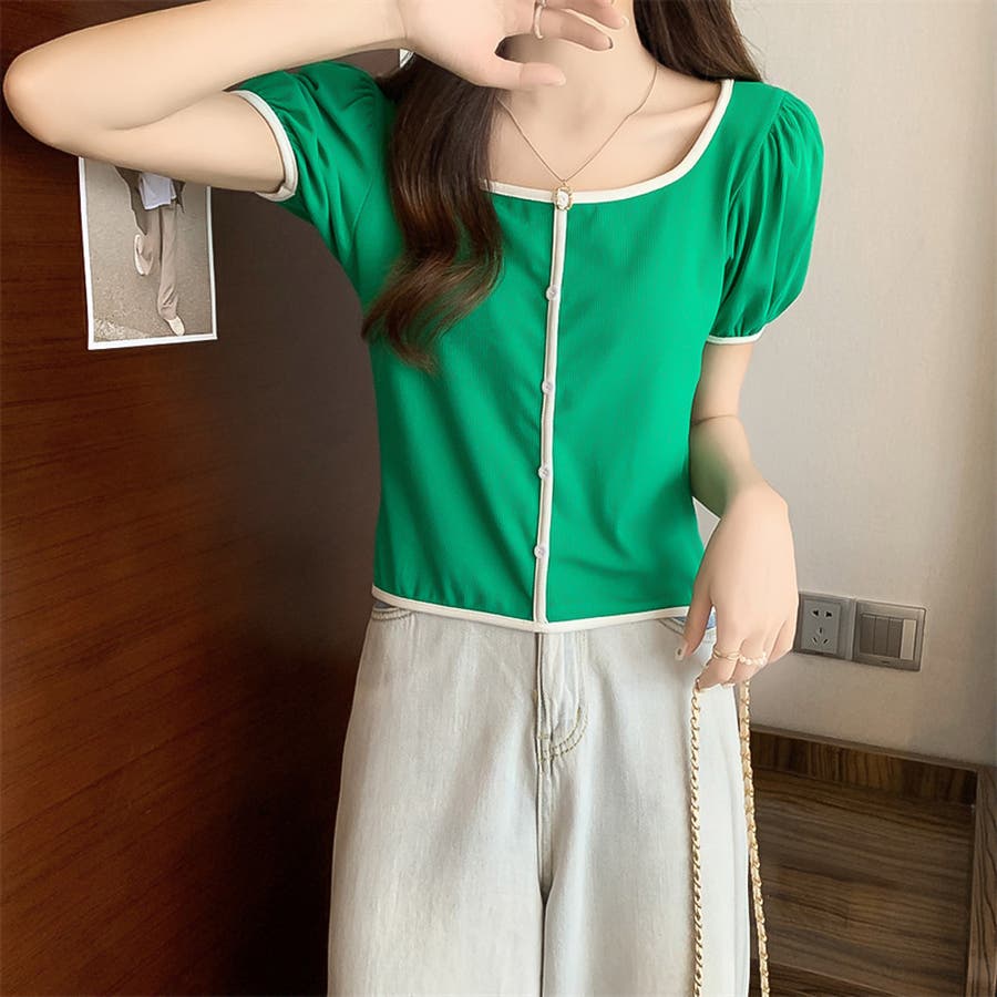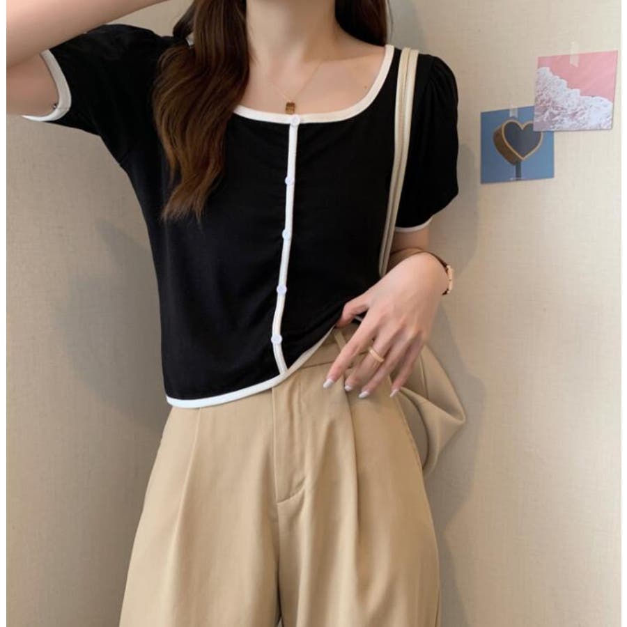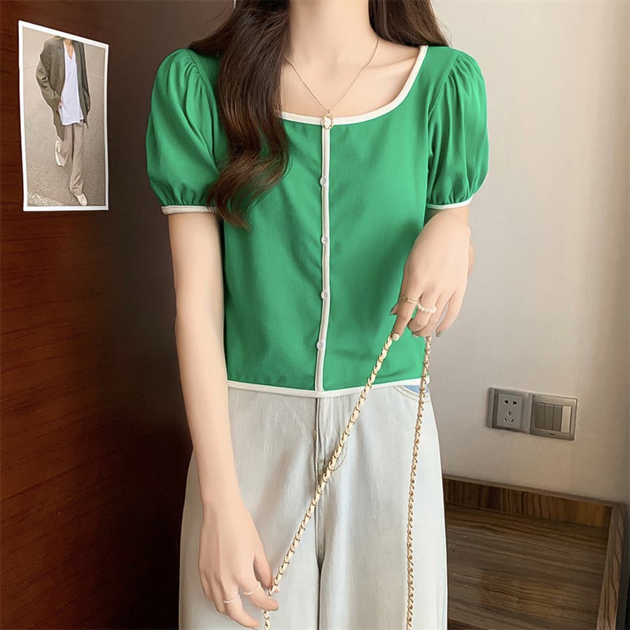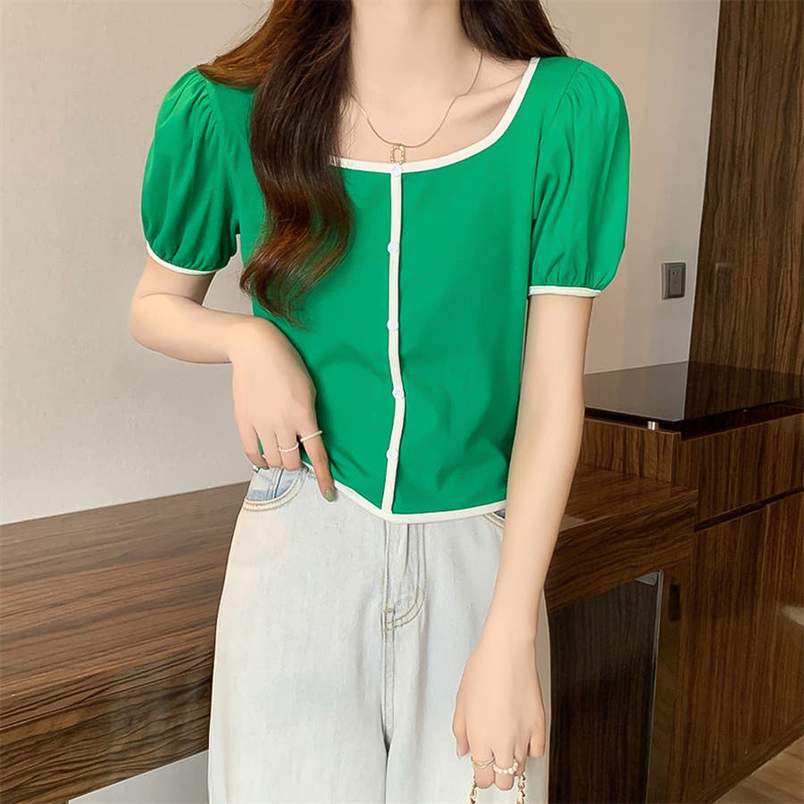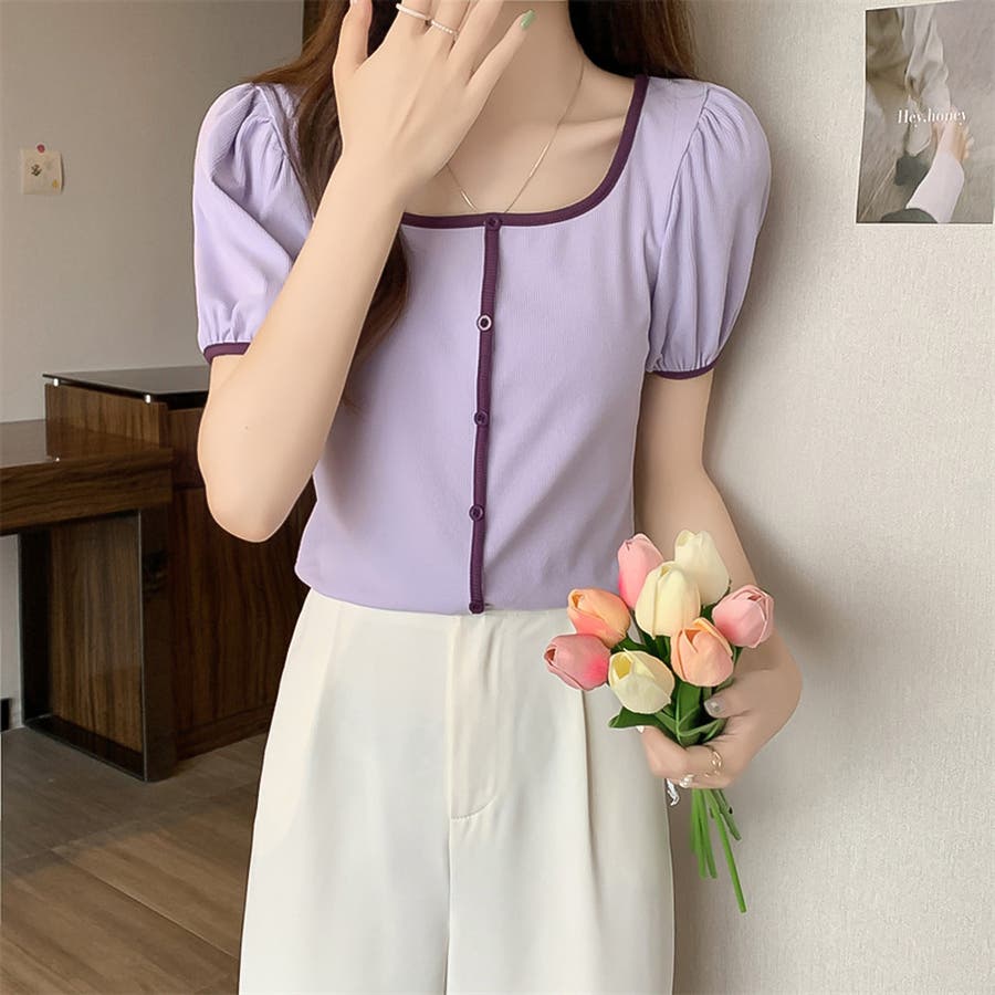 スクエアネックパイピングカラーパフスリーブ半袖カーディガン【韓国ファッション】