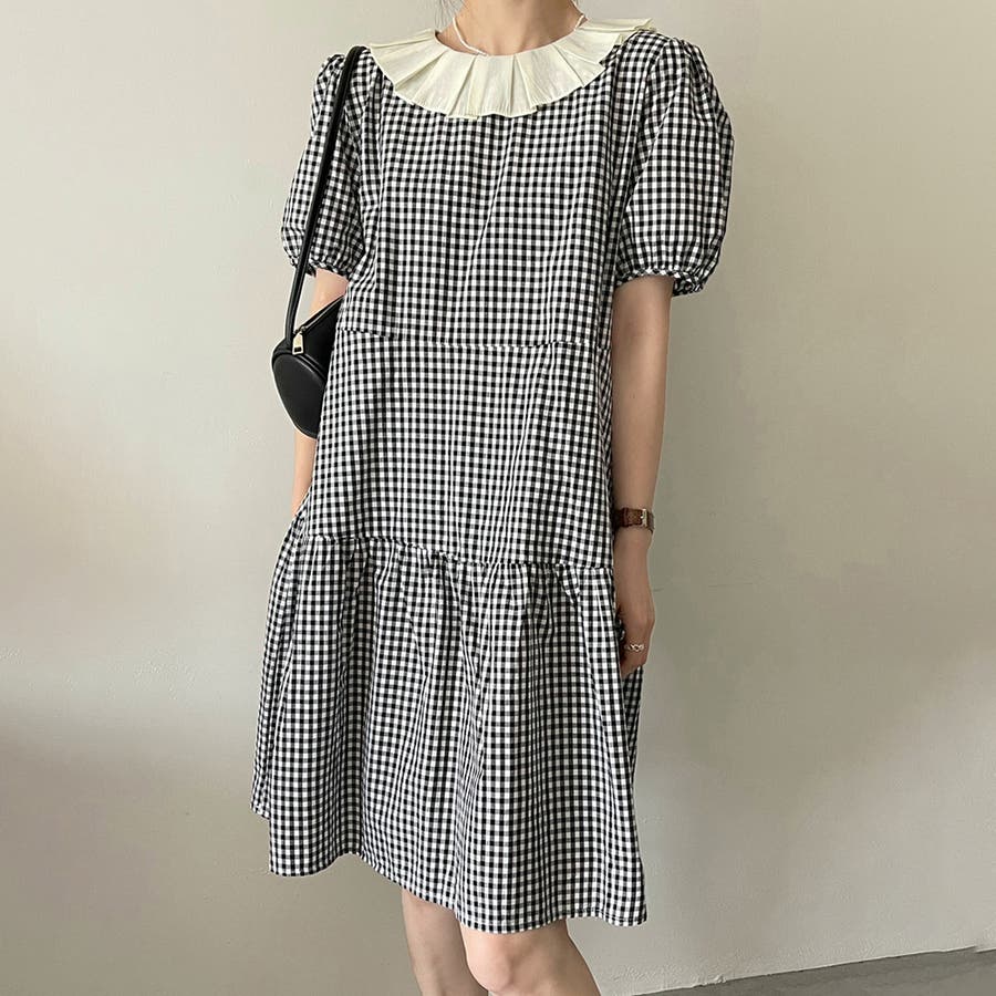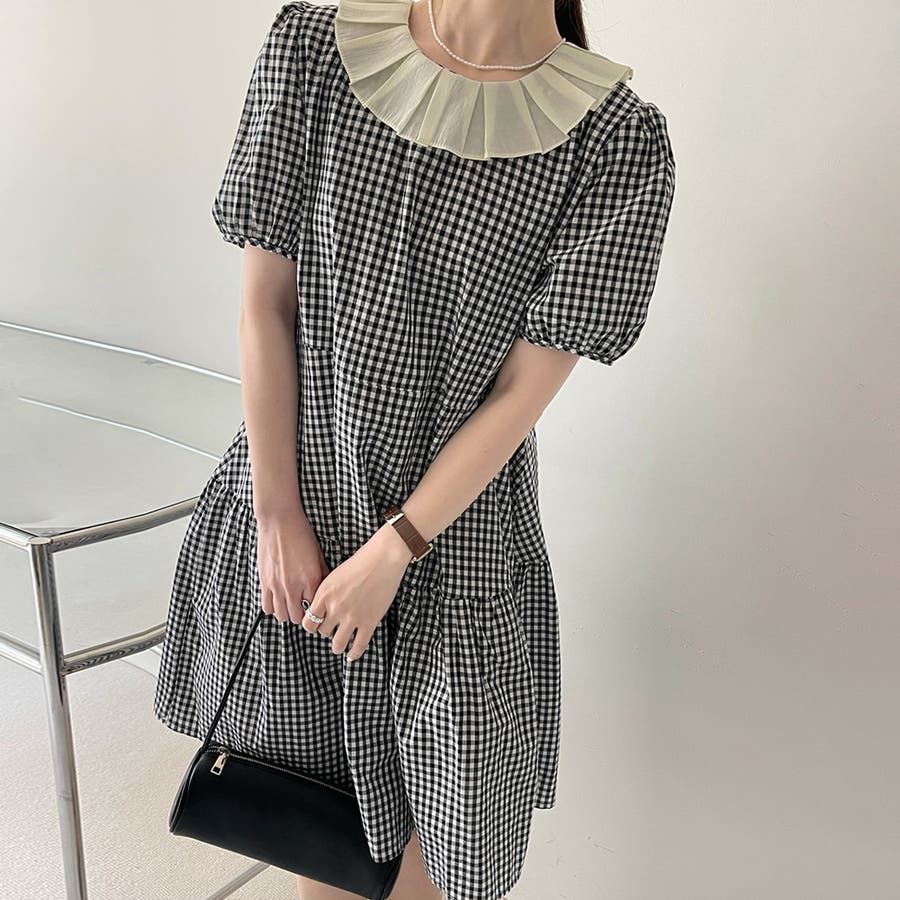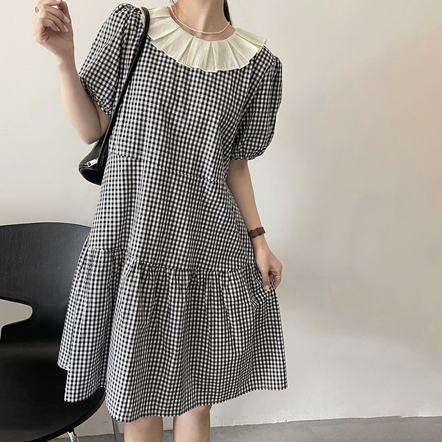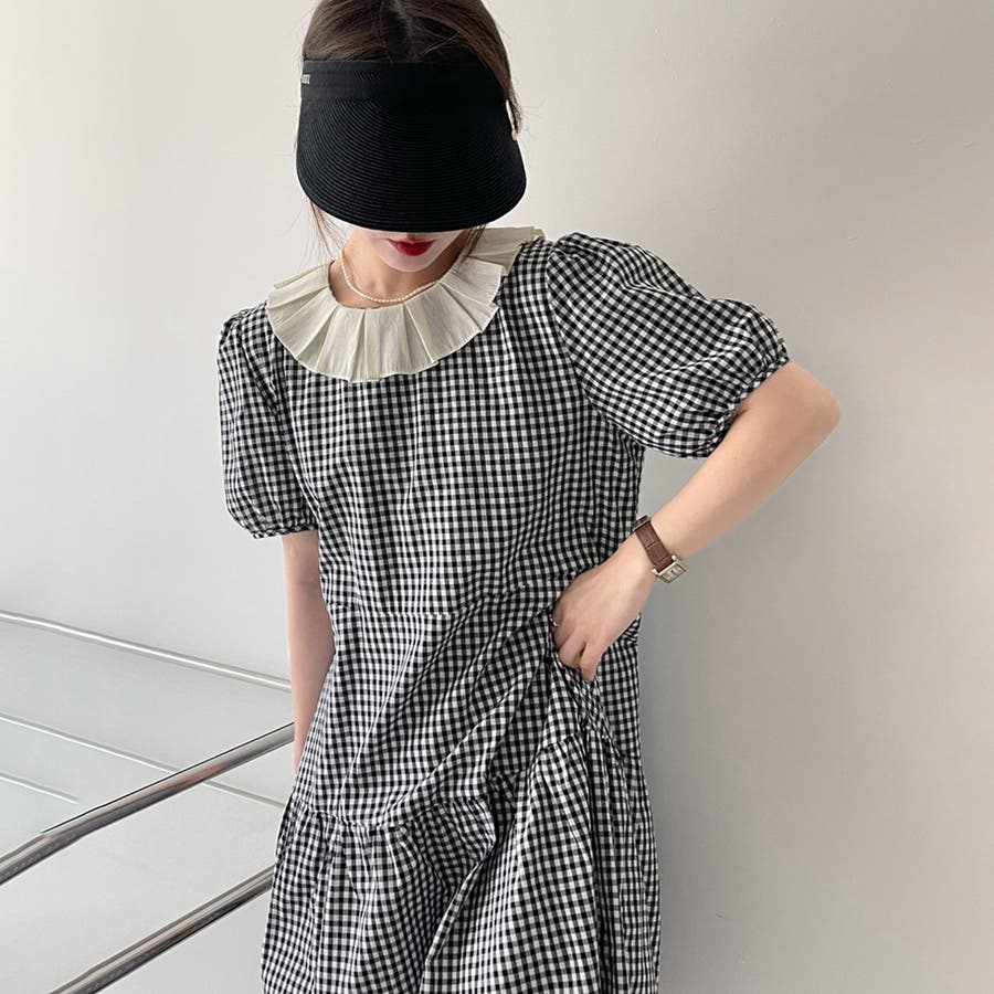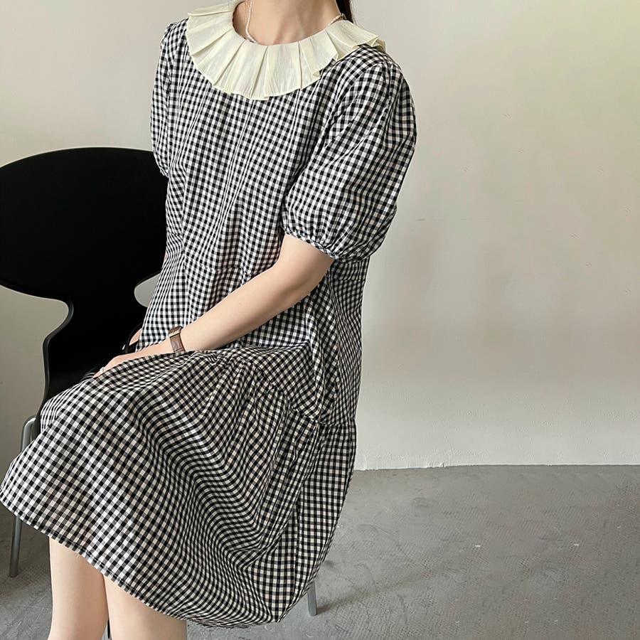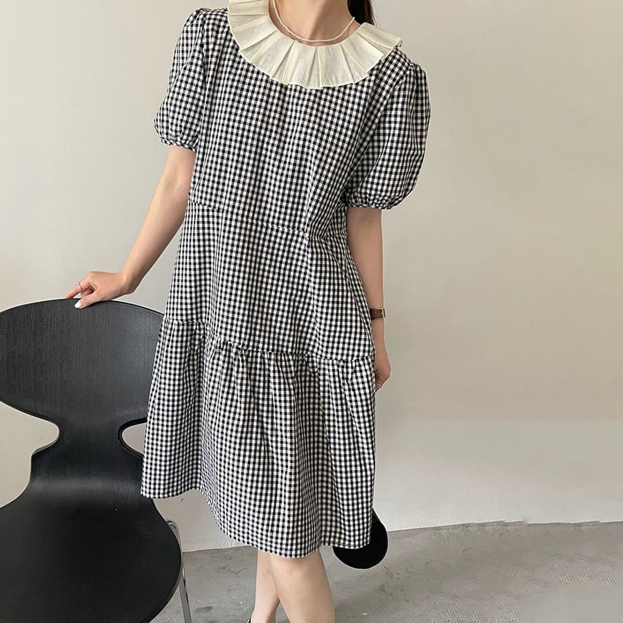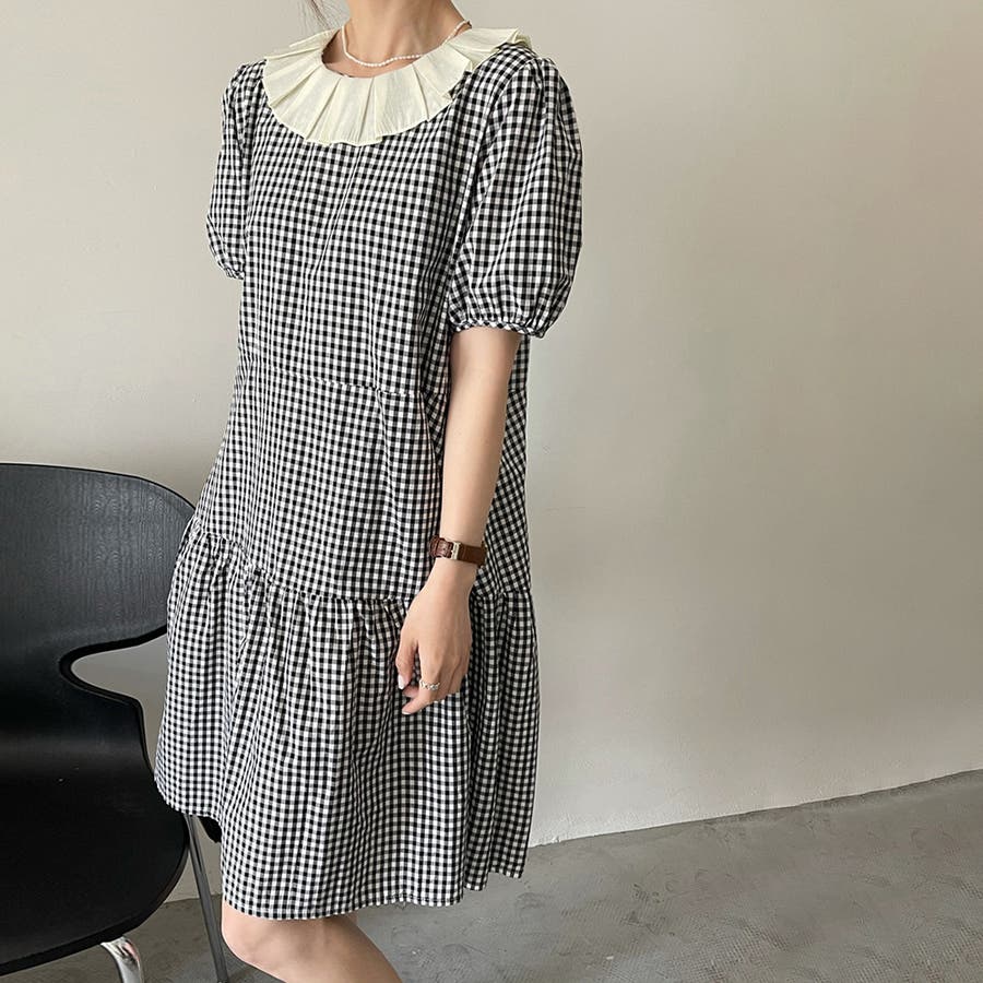 フリル衿背中あきリボンワンピース【韓国ファッション】