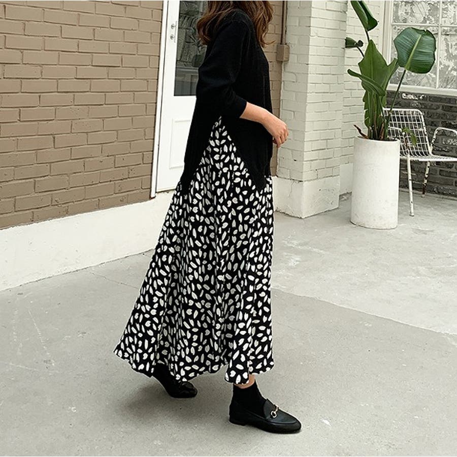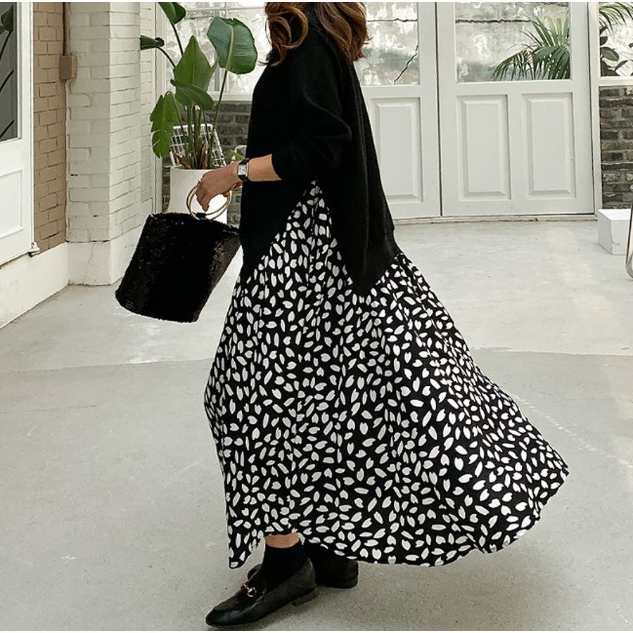 ニットにレオパードスカートをレイヤードしたように切り替えています。