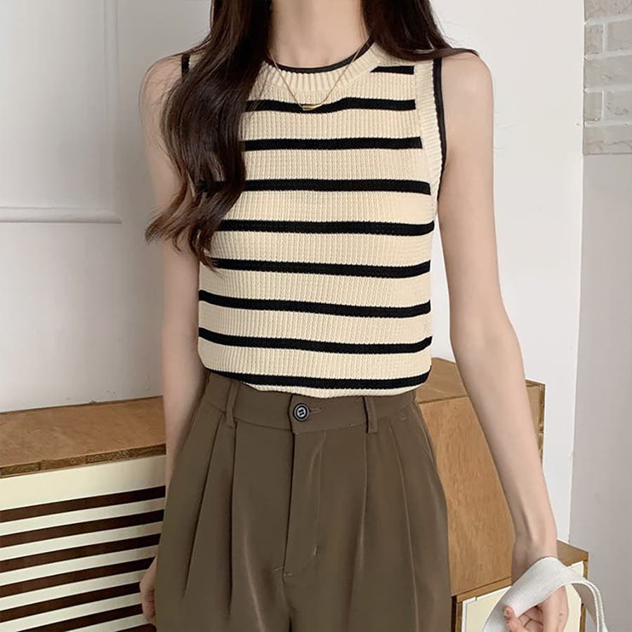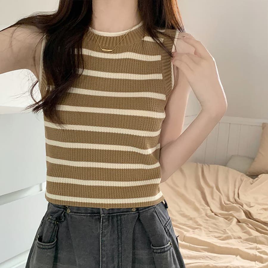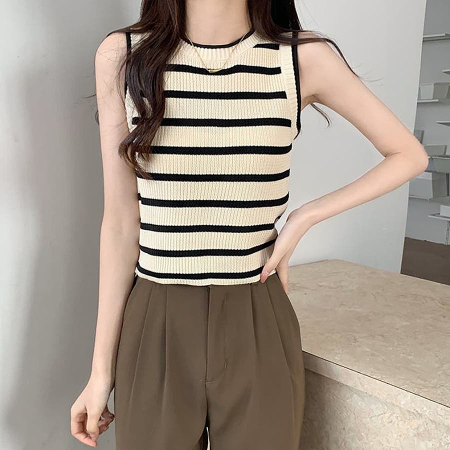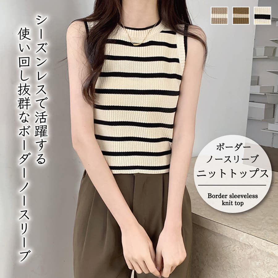 ボーダーノースリーブ ニットトップス【韓国ファッション】【春夏新商品】