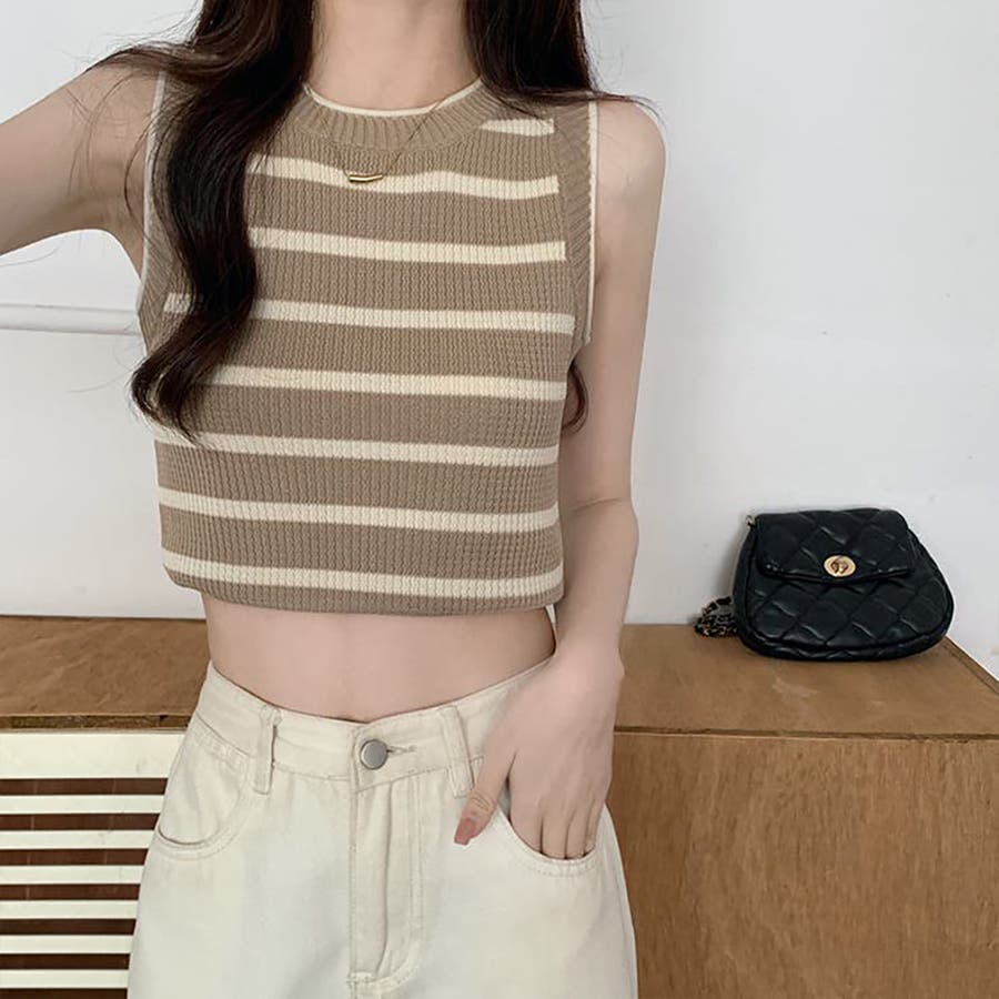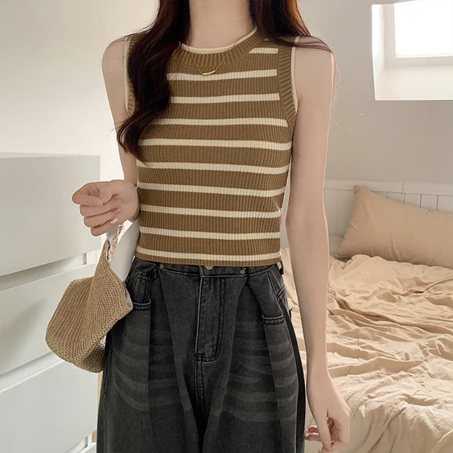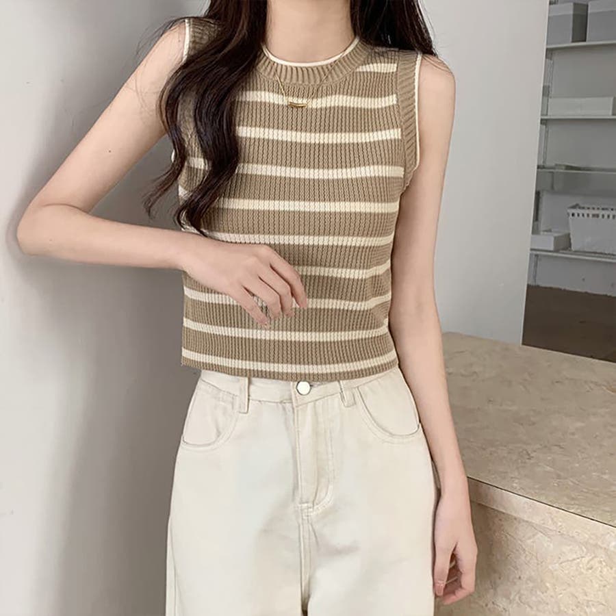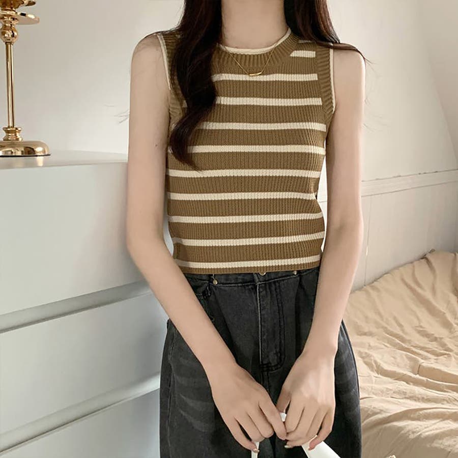 ボーダーノースリーブ ニットトップス【韓国ファッション】【春夏新商品】
