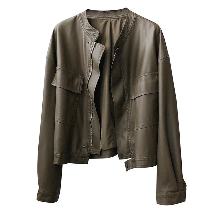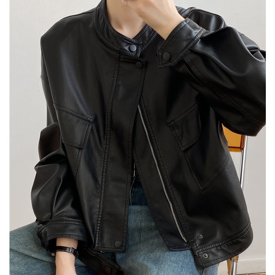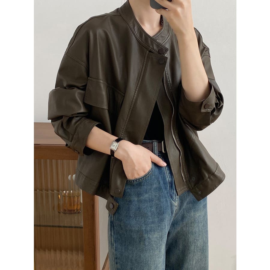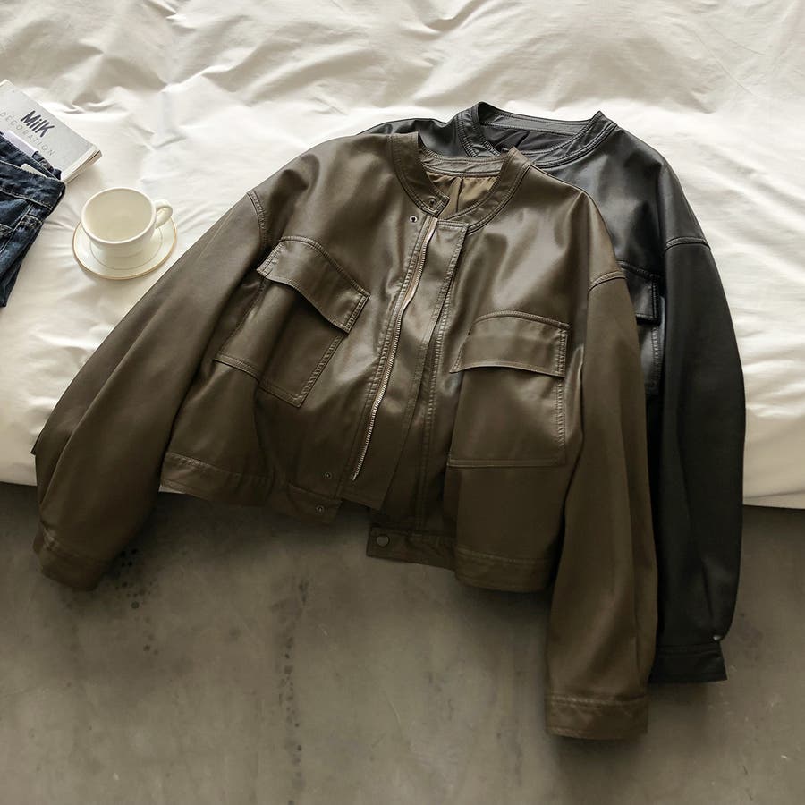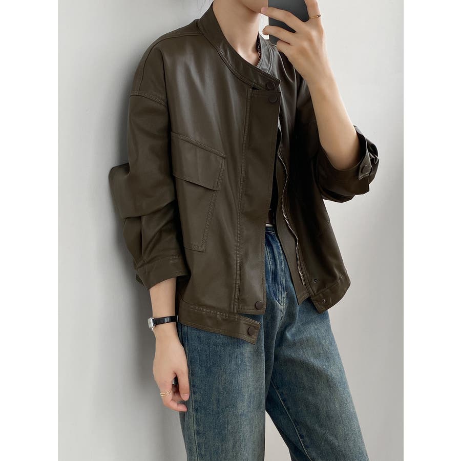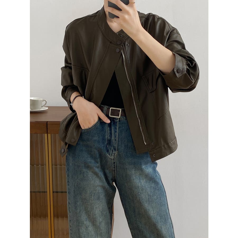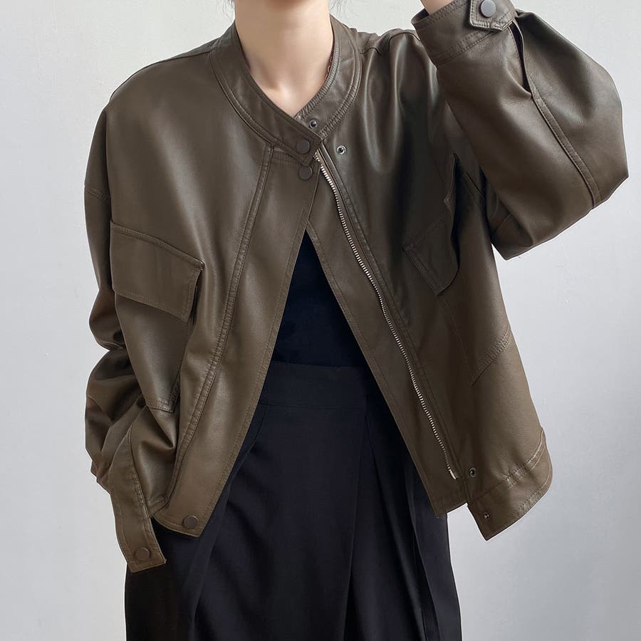 韓国ファッション 大人 春 夏 秋 冬 オフィスカジュアル 春服 夏服 秋服 冬服 事務服 通勤 上品 アウター フェイクレザー ブルゾン 韓国コーデ