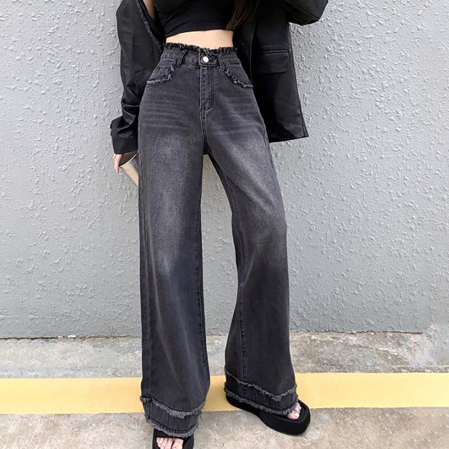 《ウエストと裾にあしらったフリンジがポイントのワイドデニムパンツ》