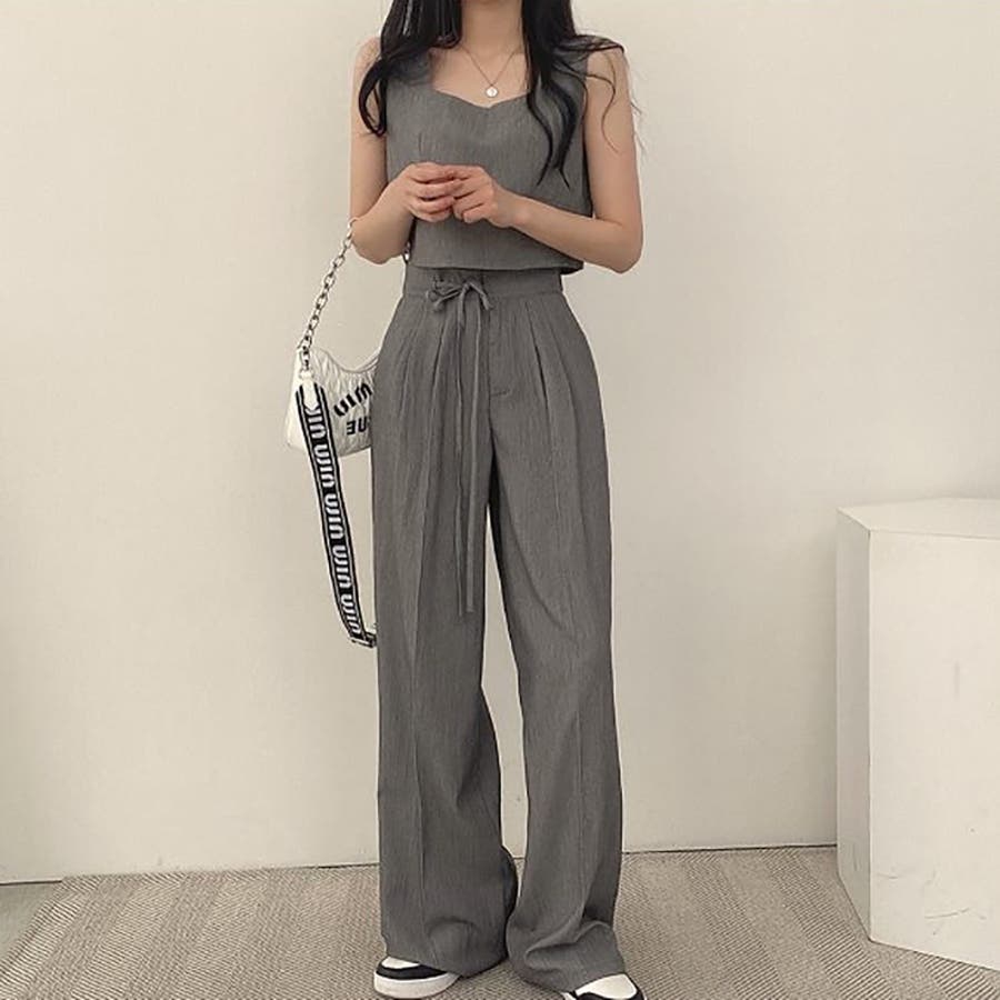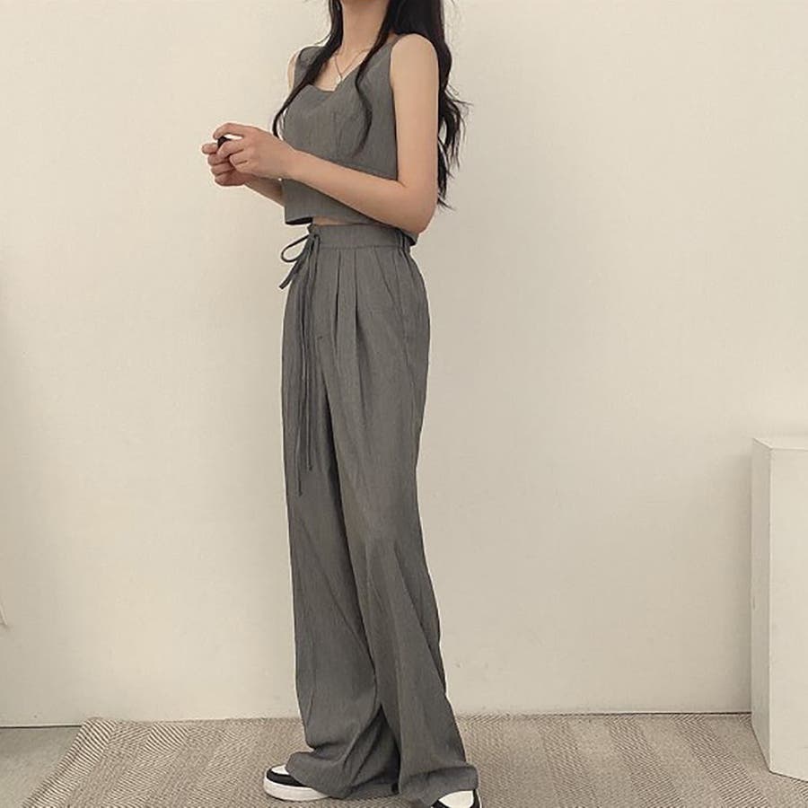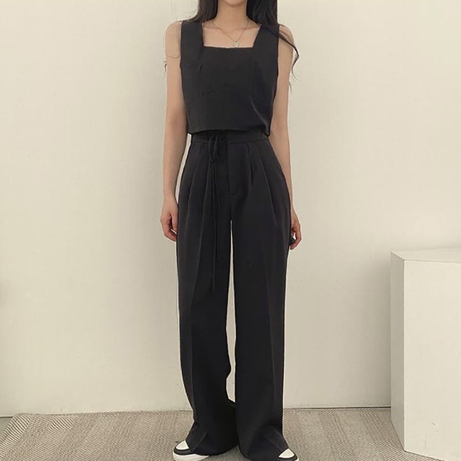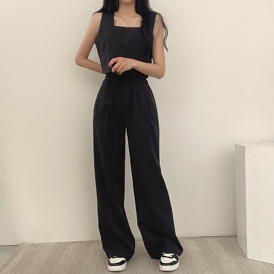 スタイルアップに見えるワイドパンツとノースリーブのセット。
