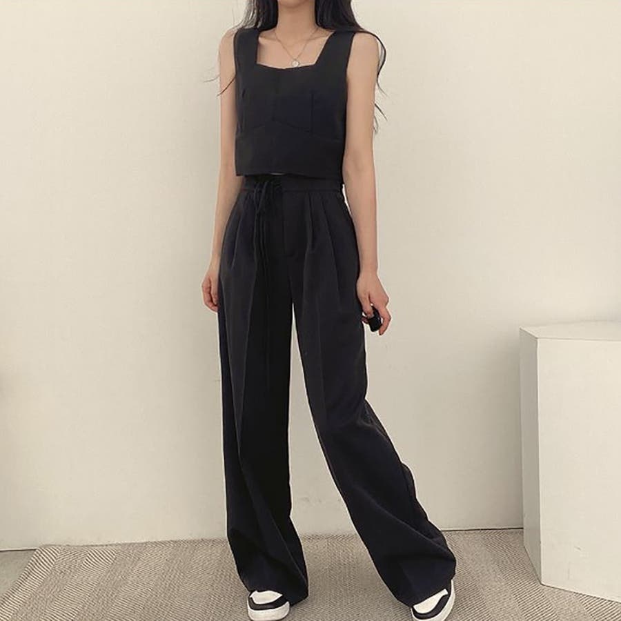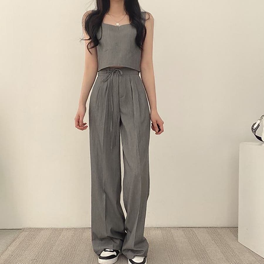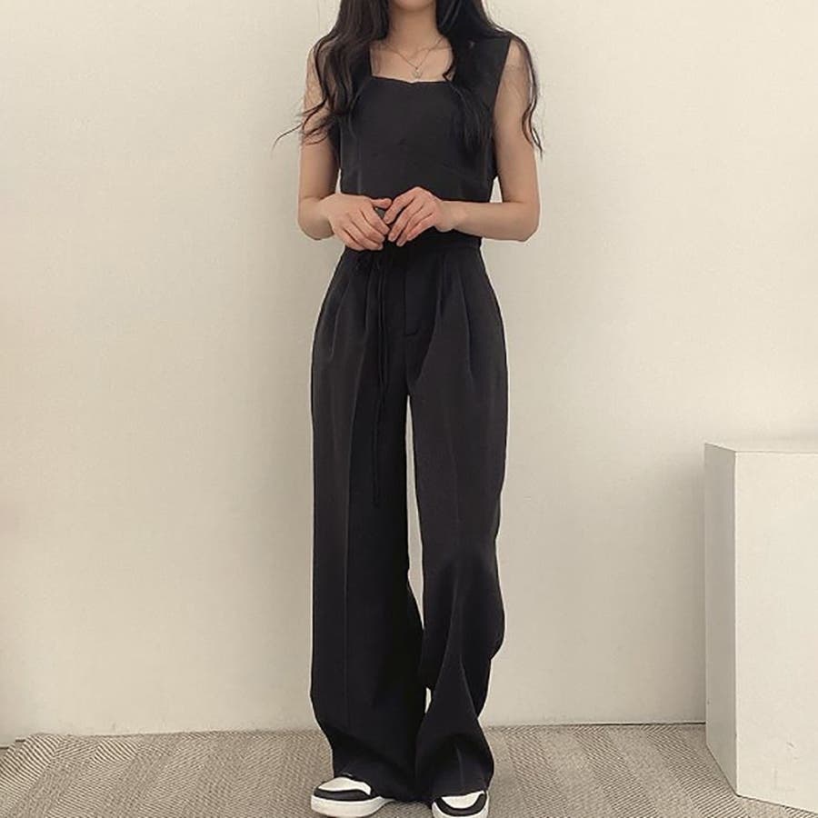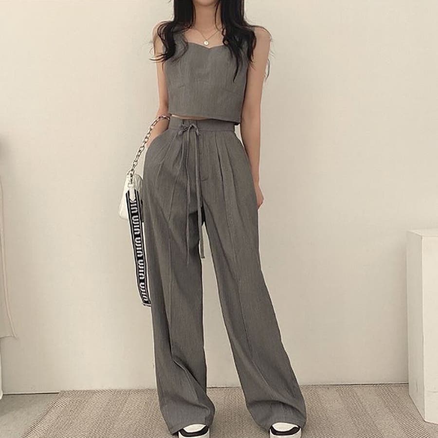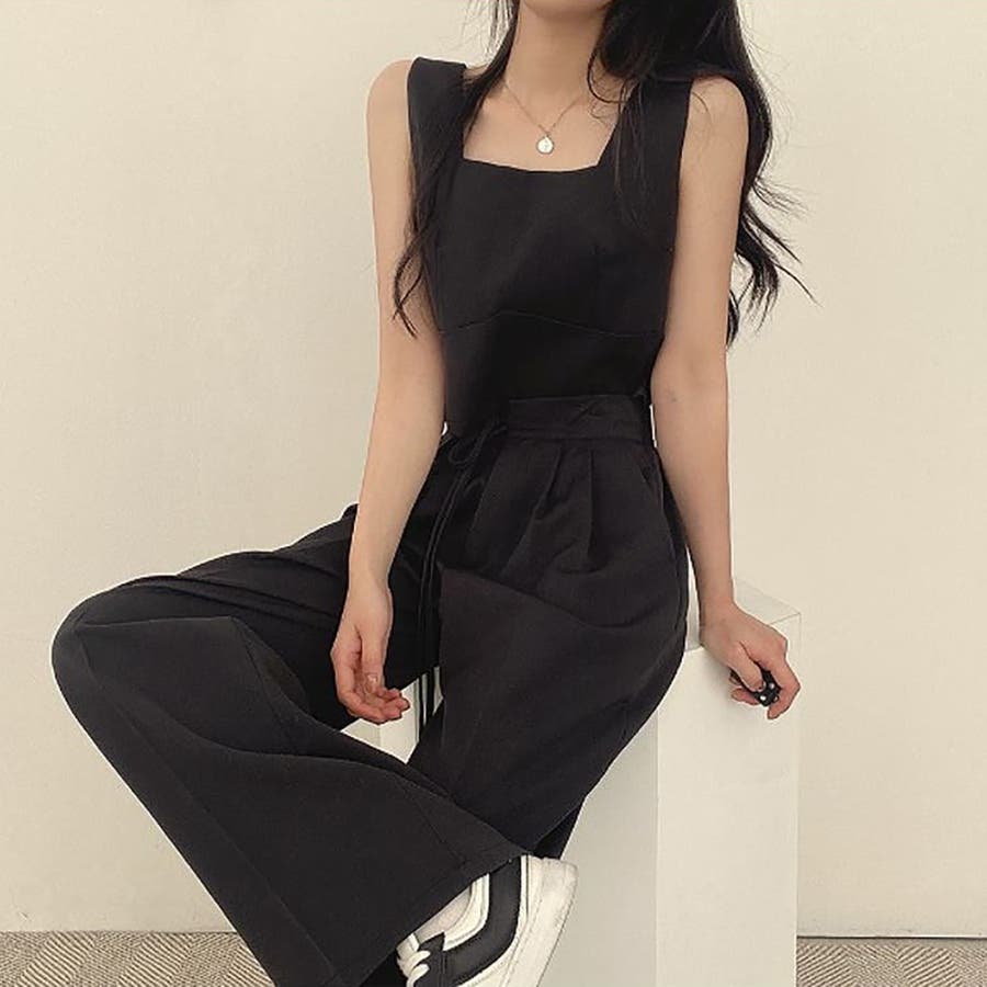 スタイルアップに見えるワイドパンツとノースリーブのセット。