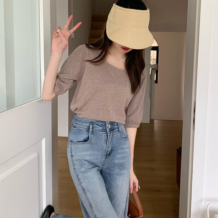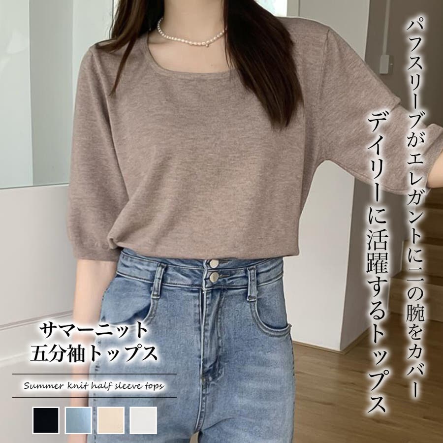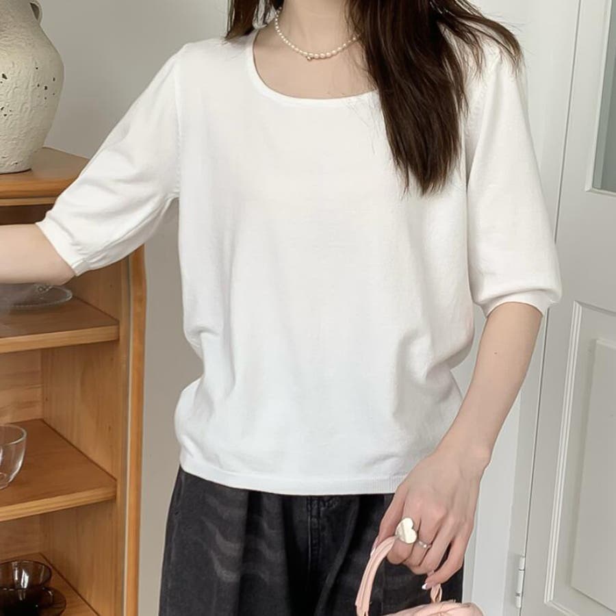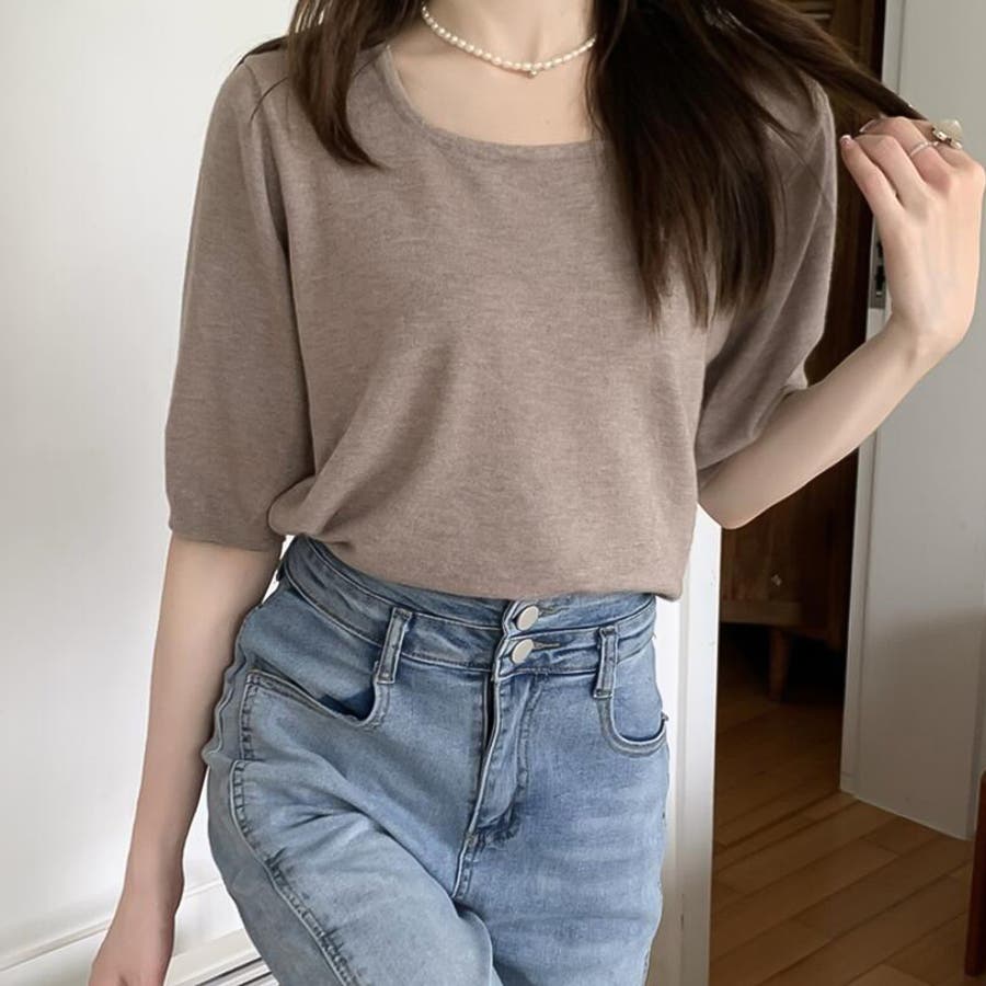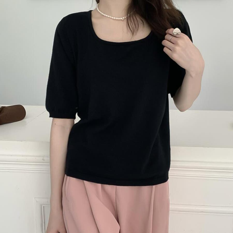 クルーネックで一枚着でも着易く、パフスリーブの5分袖で初夏に向けて1枚着でも活躍できるデザインです。