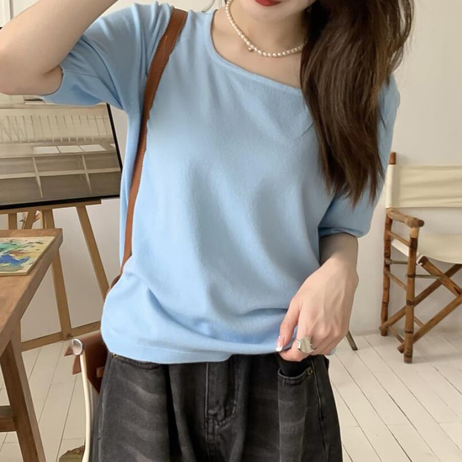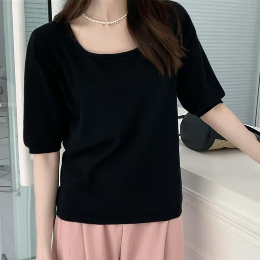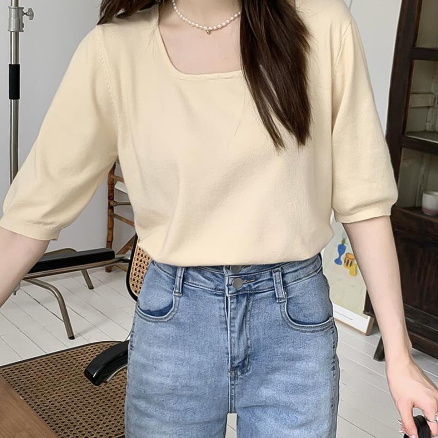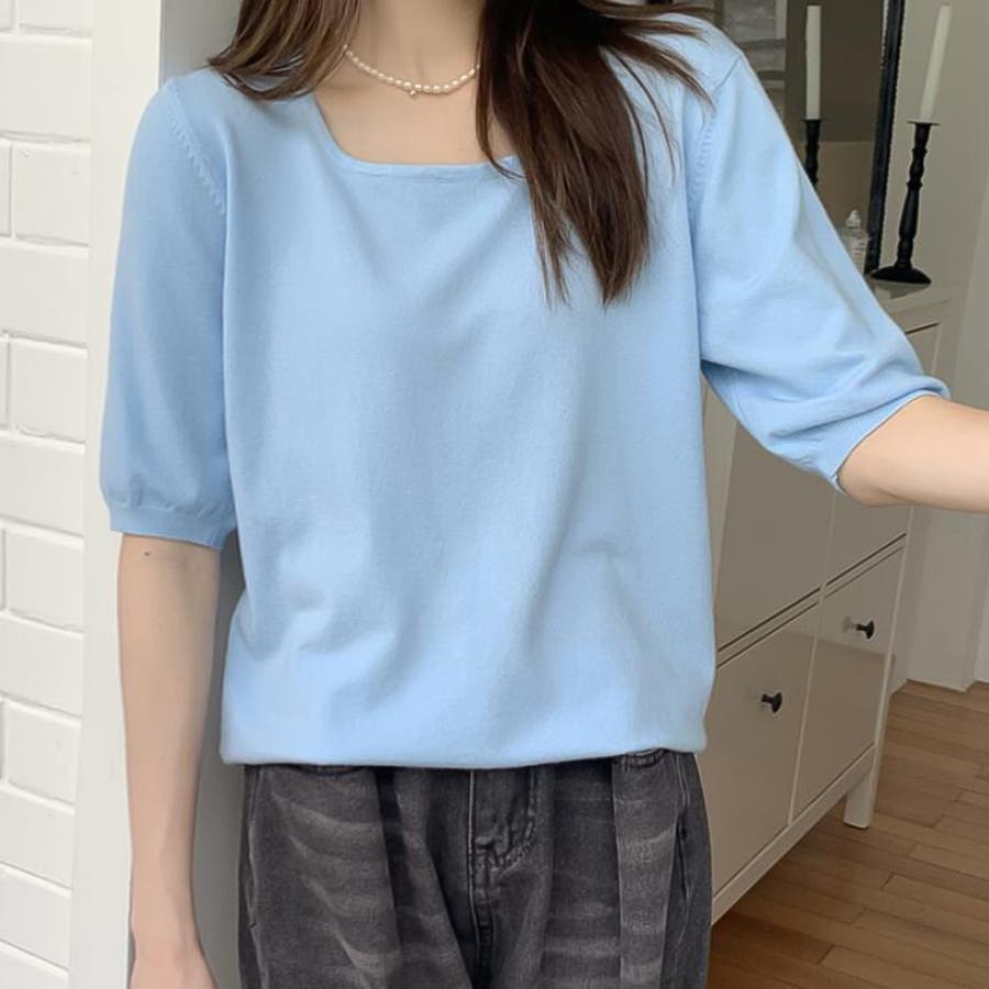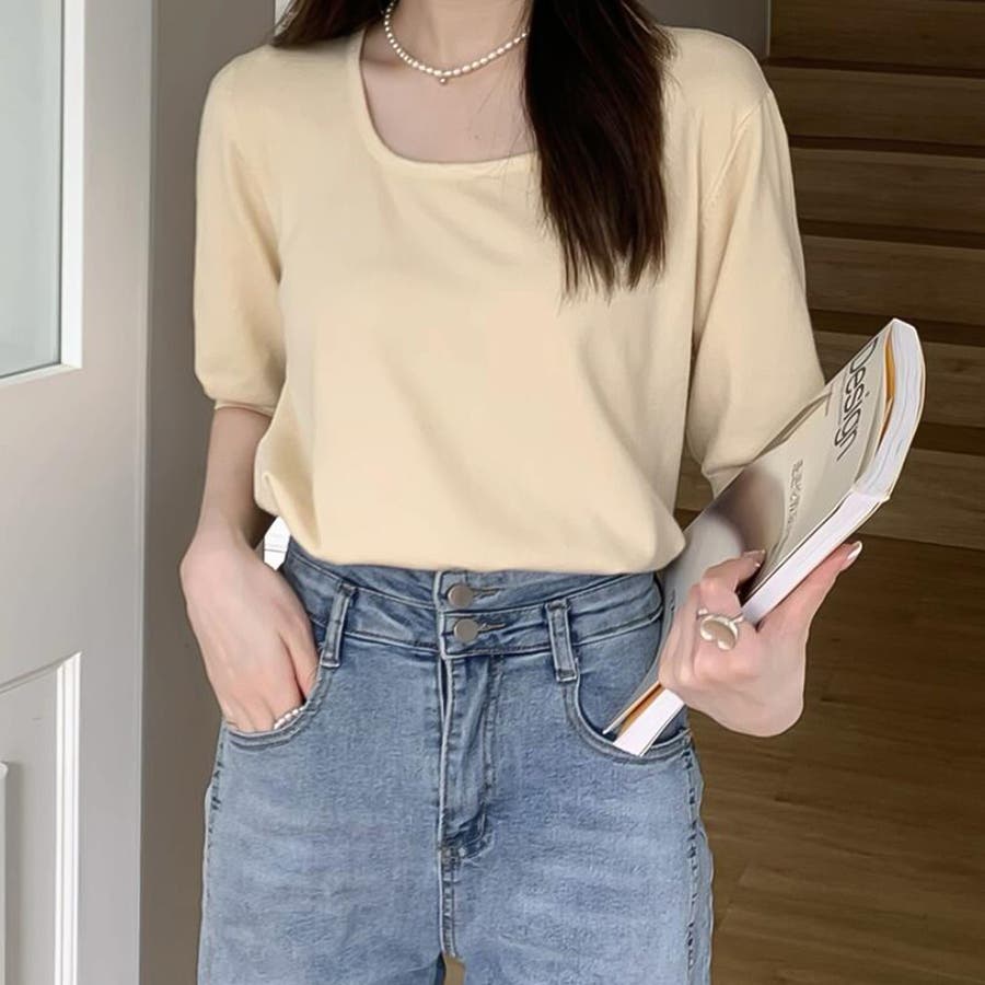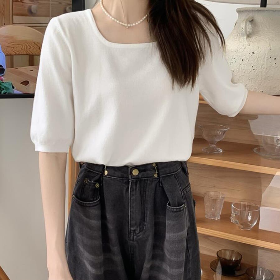 クルーネックで一枚着でも着易く、パフスリーブの5分袖で初夏に向けて1枚着でも活躍できるデザインです。