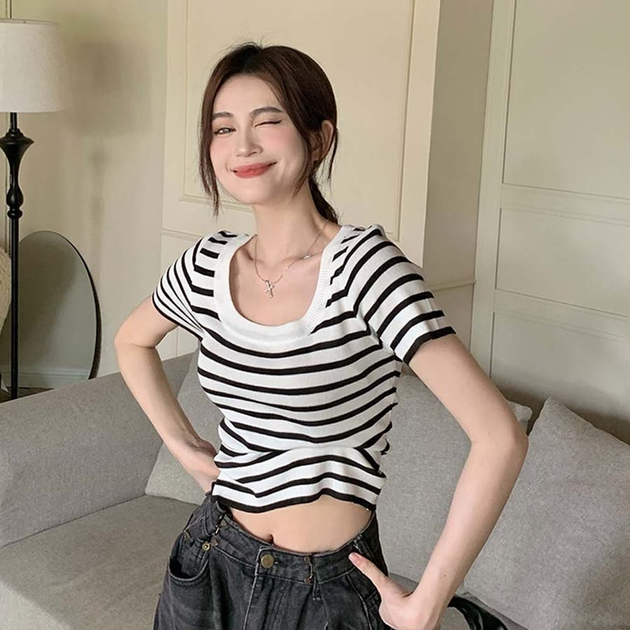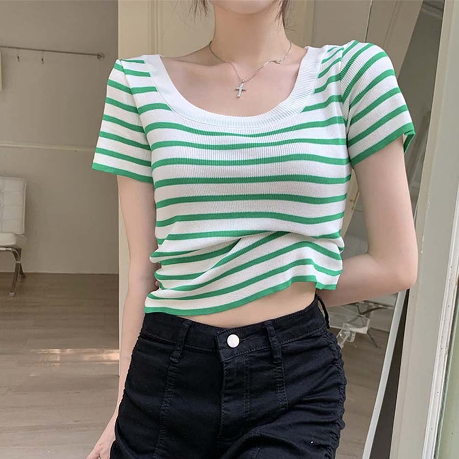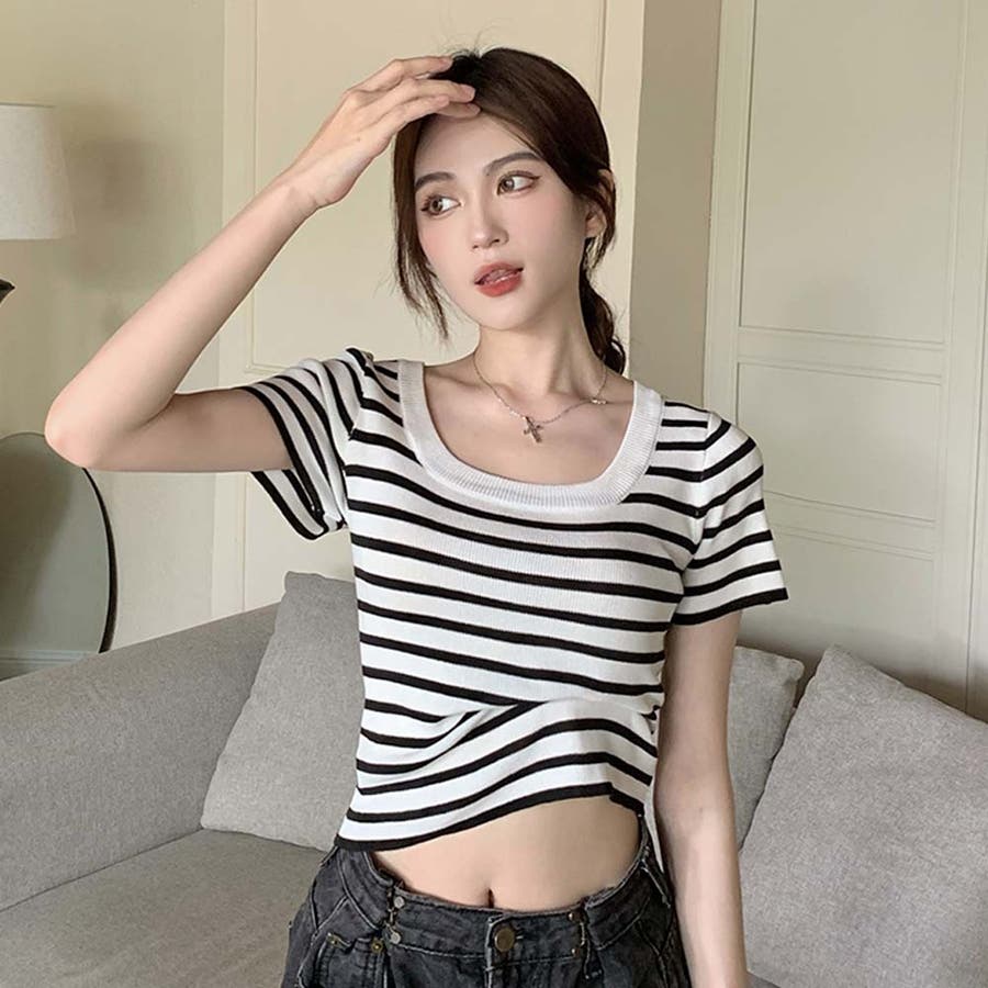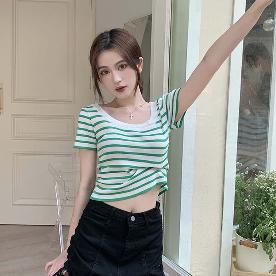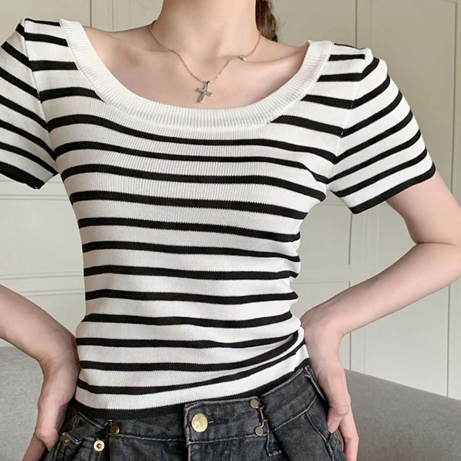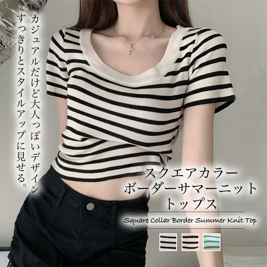 スクエアカラーボーダーサマーニットトップス【韓国ファッション】