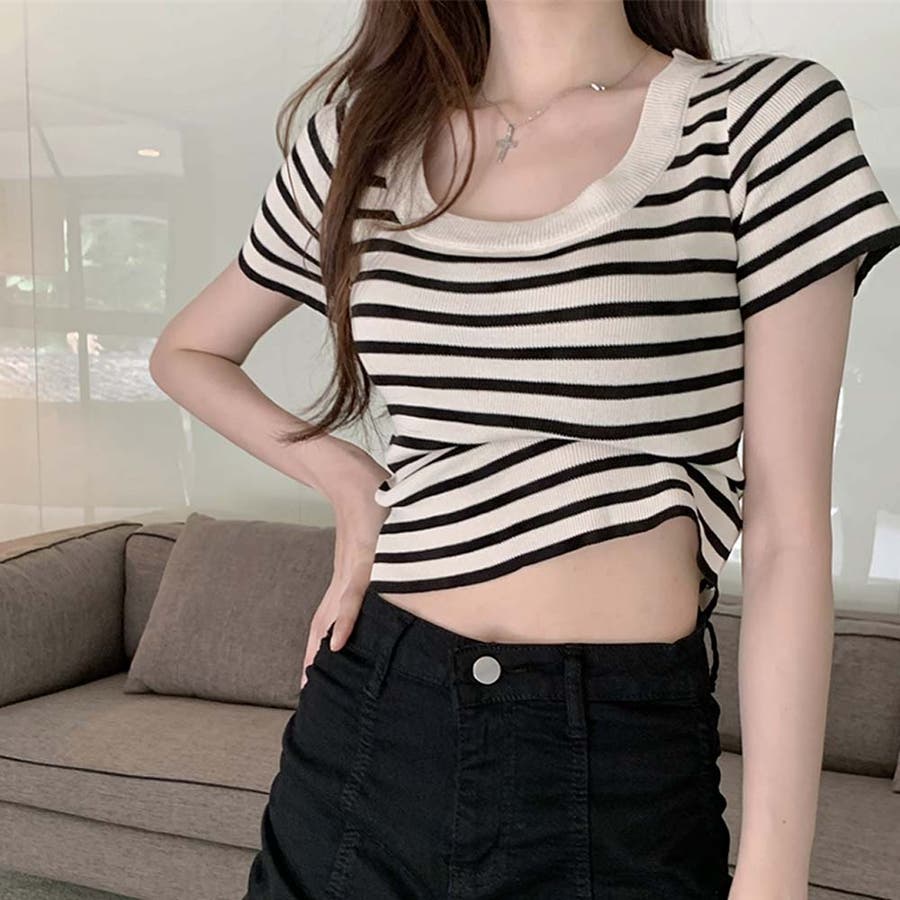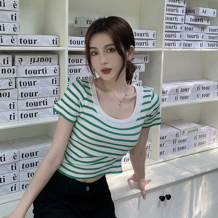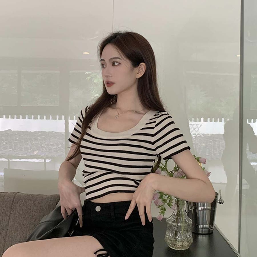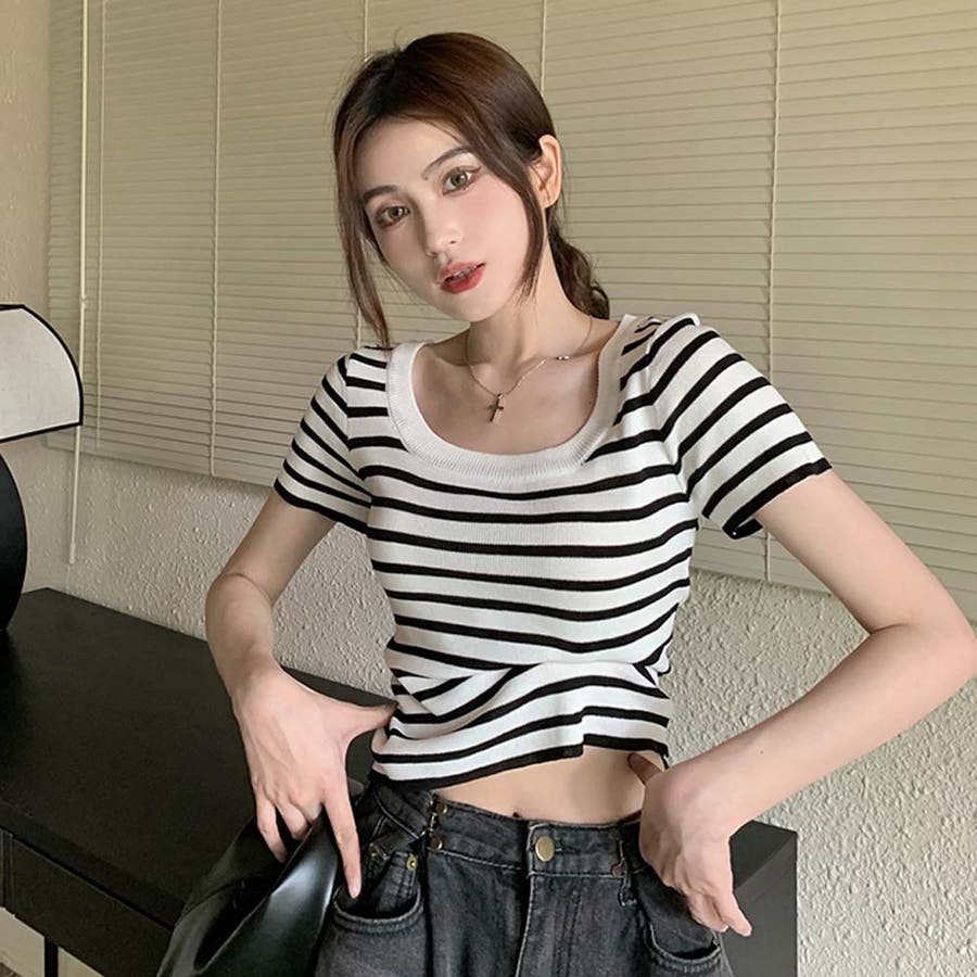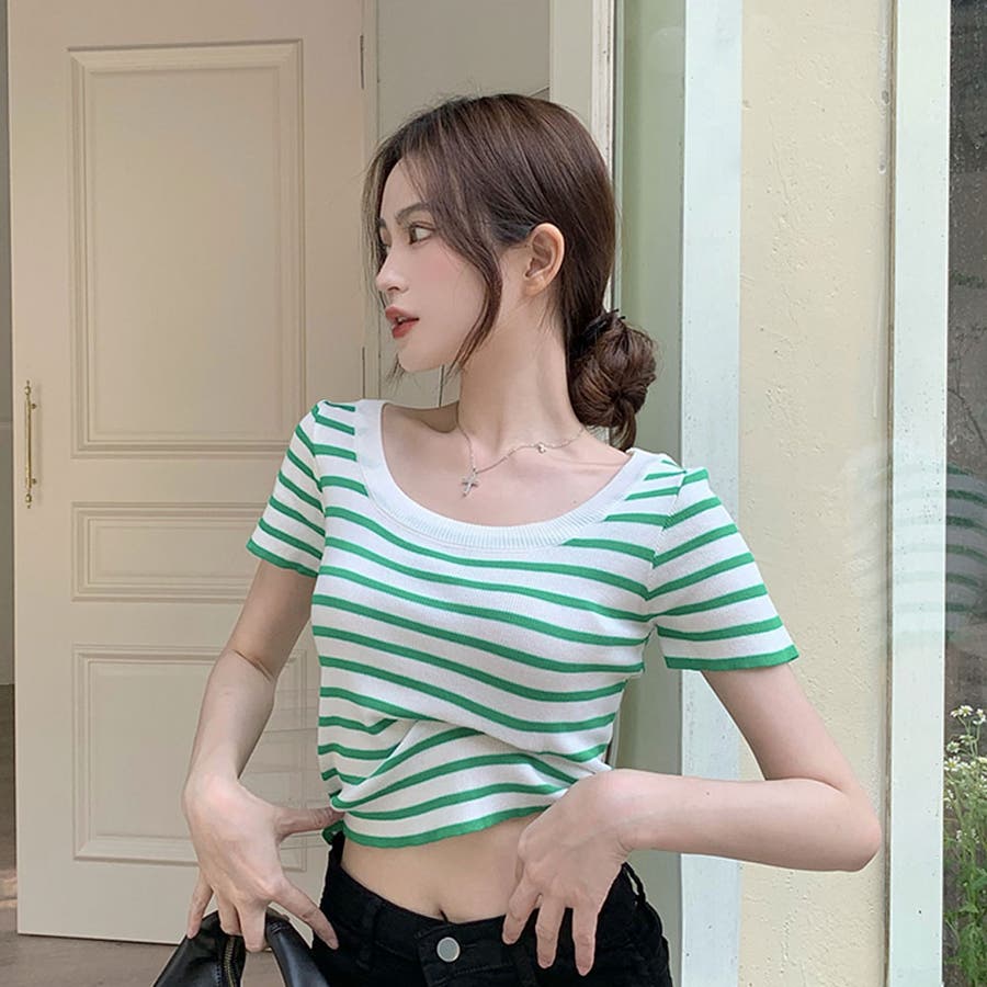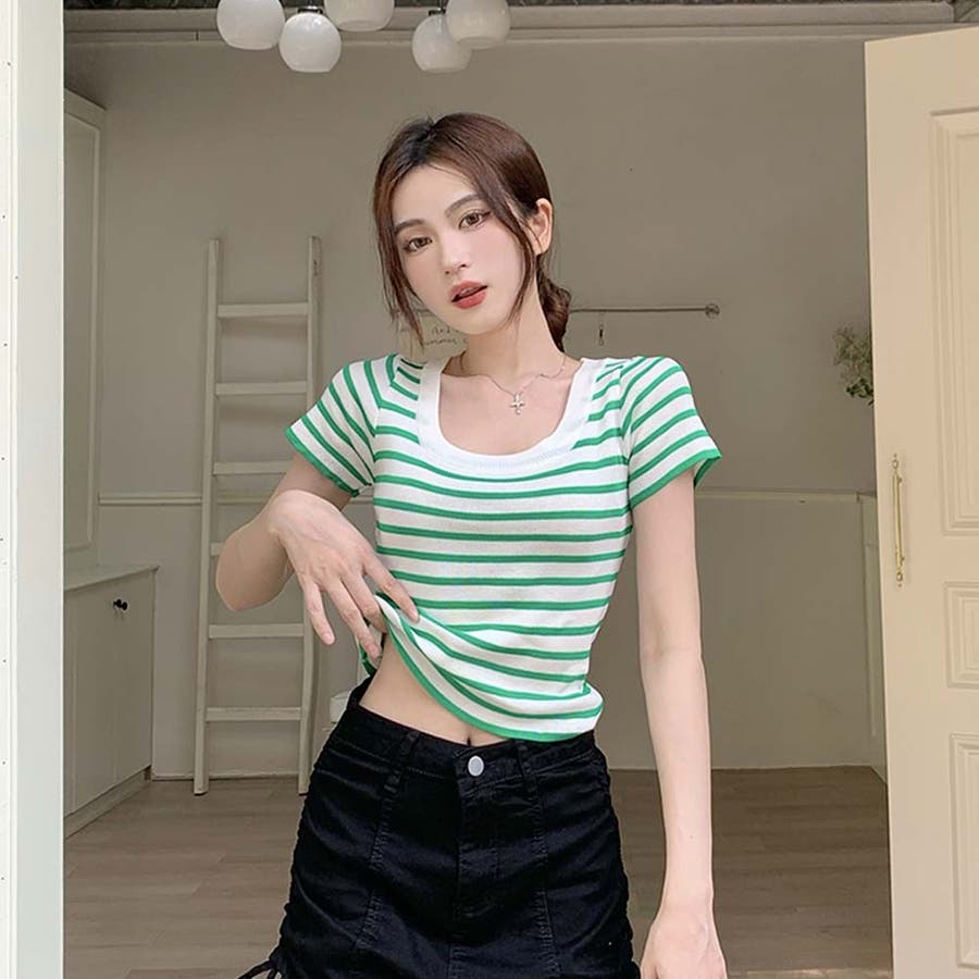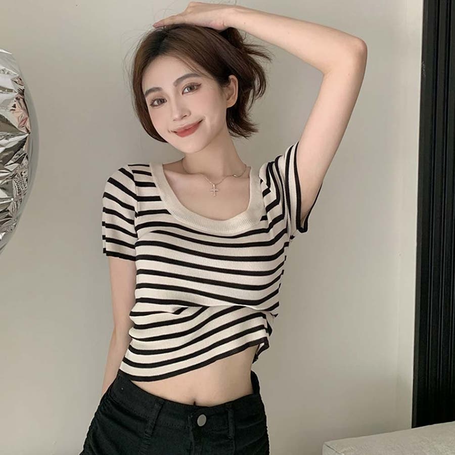 スクエアカラーボーダーサマーニットトップス【韓国ファッション】