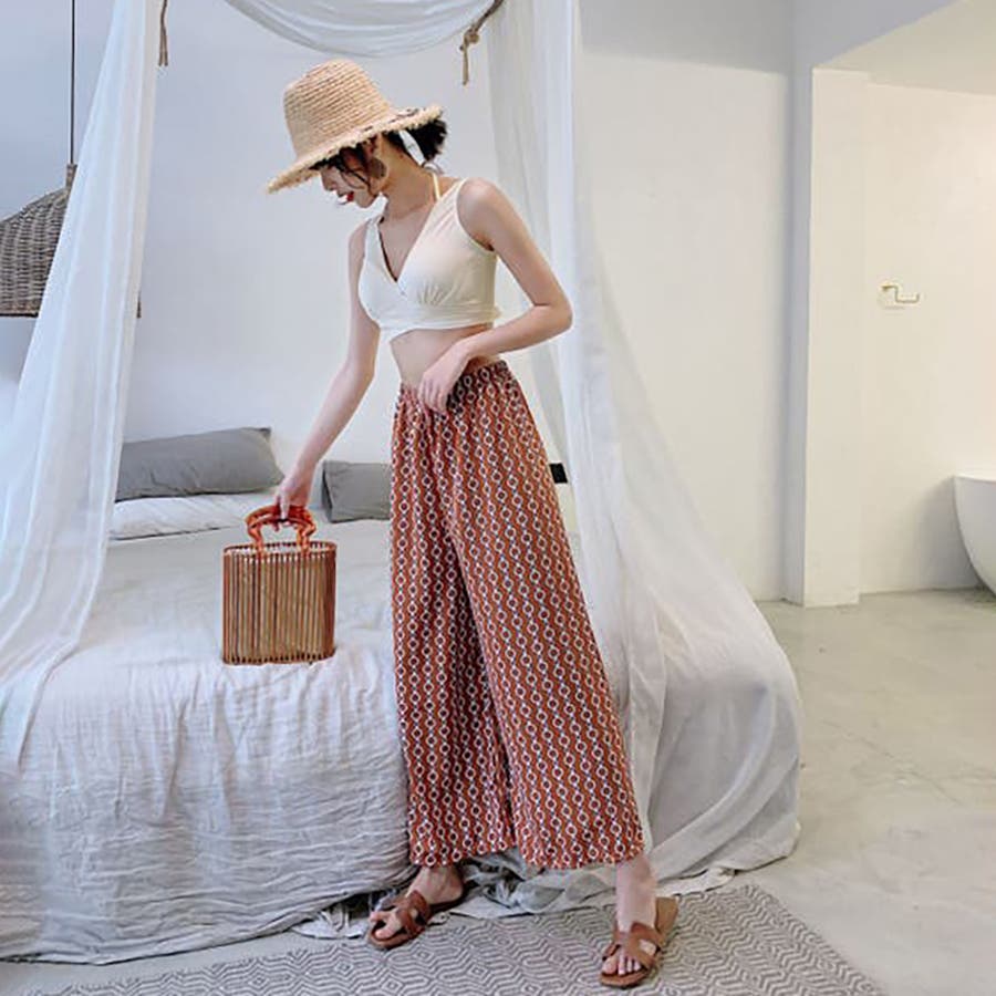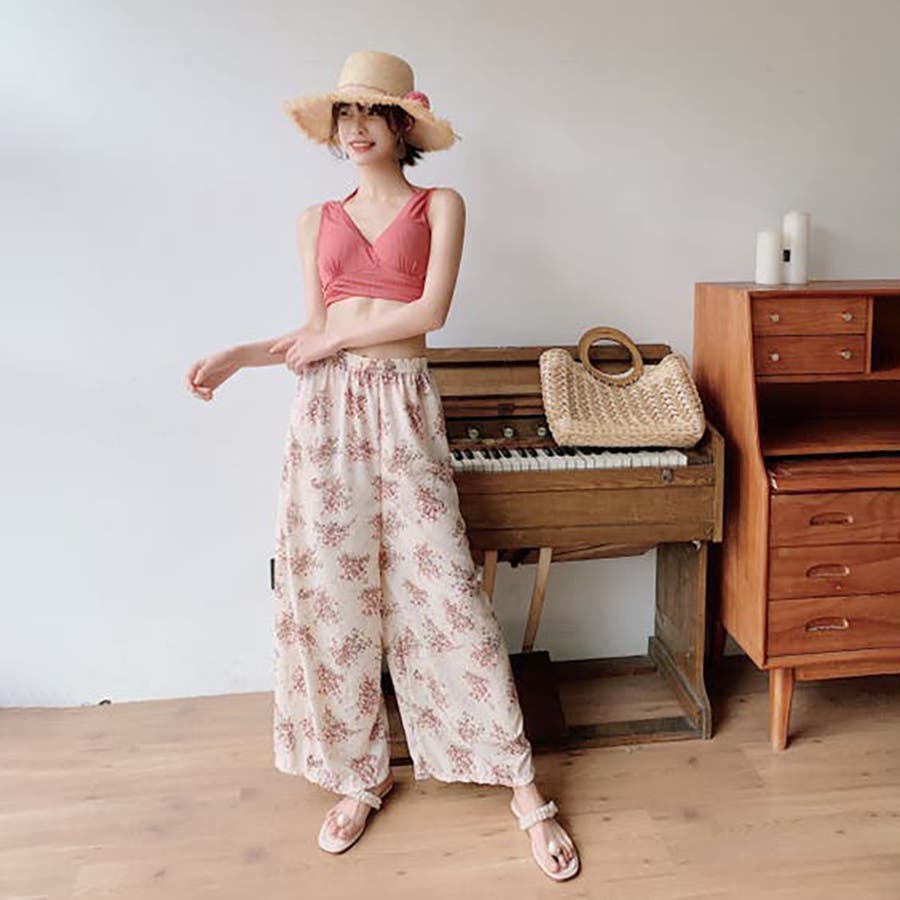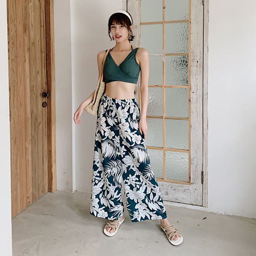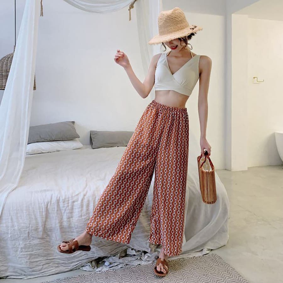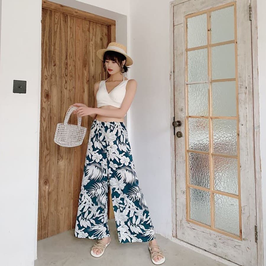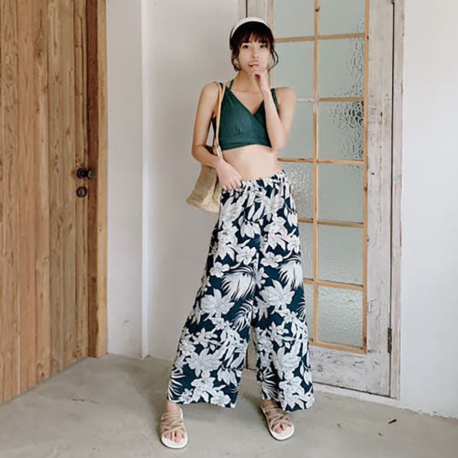 ・ロング丈のワイドパンツは下半身をしっかりカバーできリゾート感のある雰囲気に。