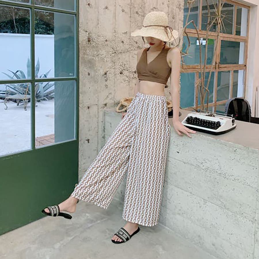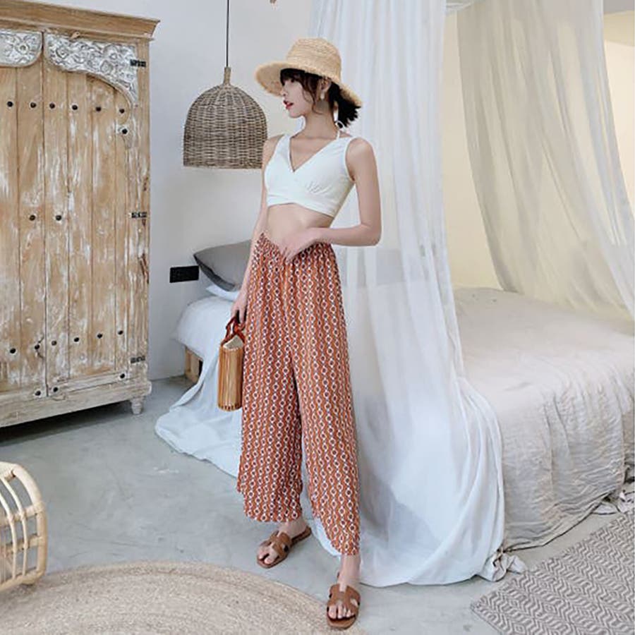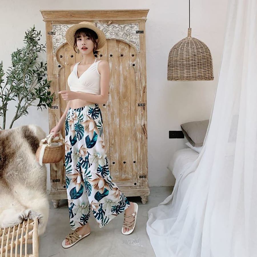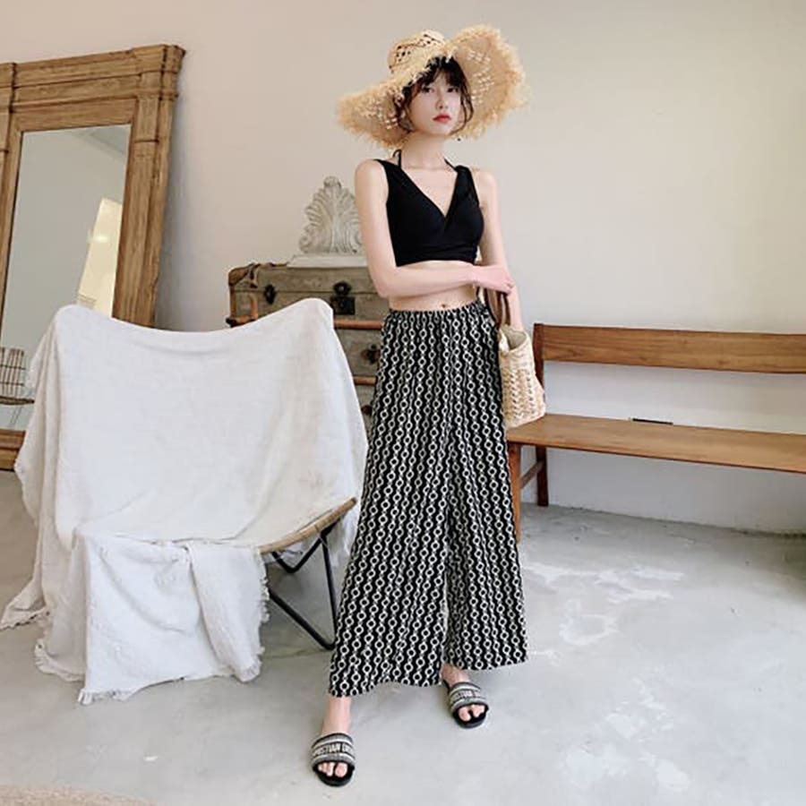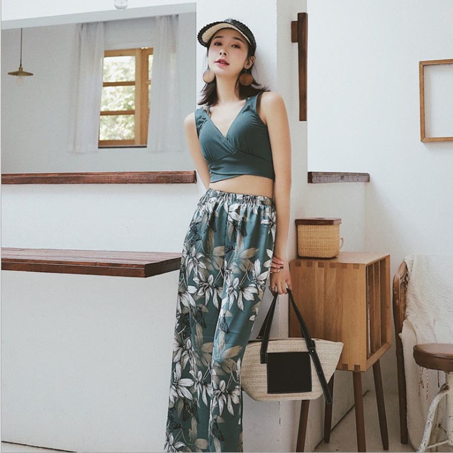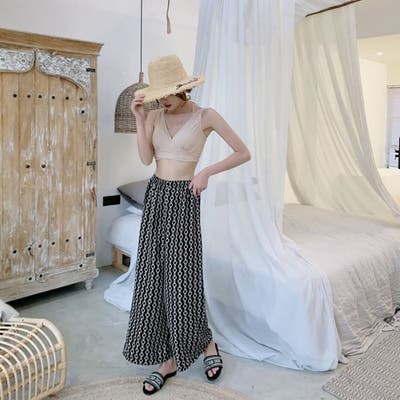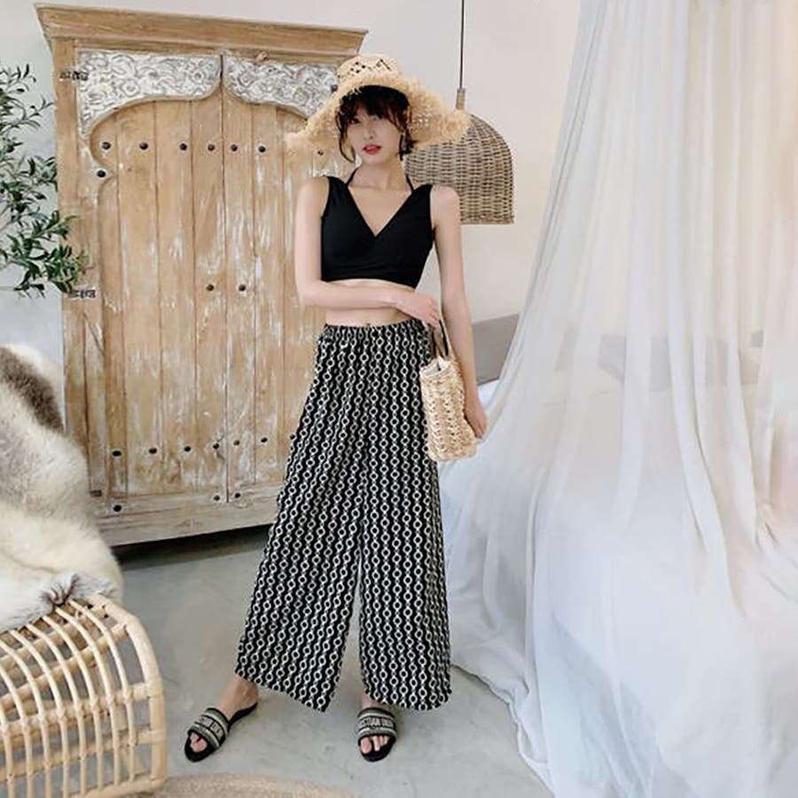 ・ロング丈のワイドパンツは下半身をしっかりカバーできリゾート感のある雰囲気に。