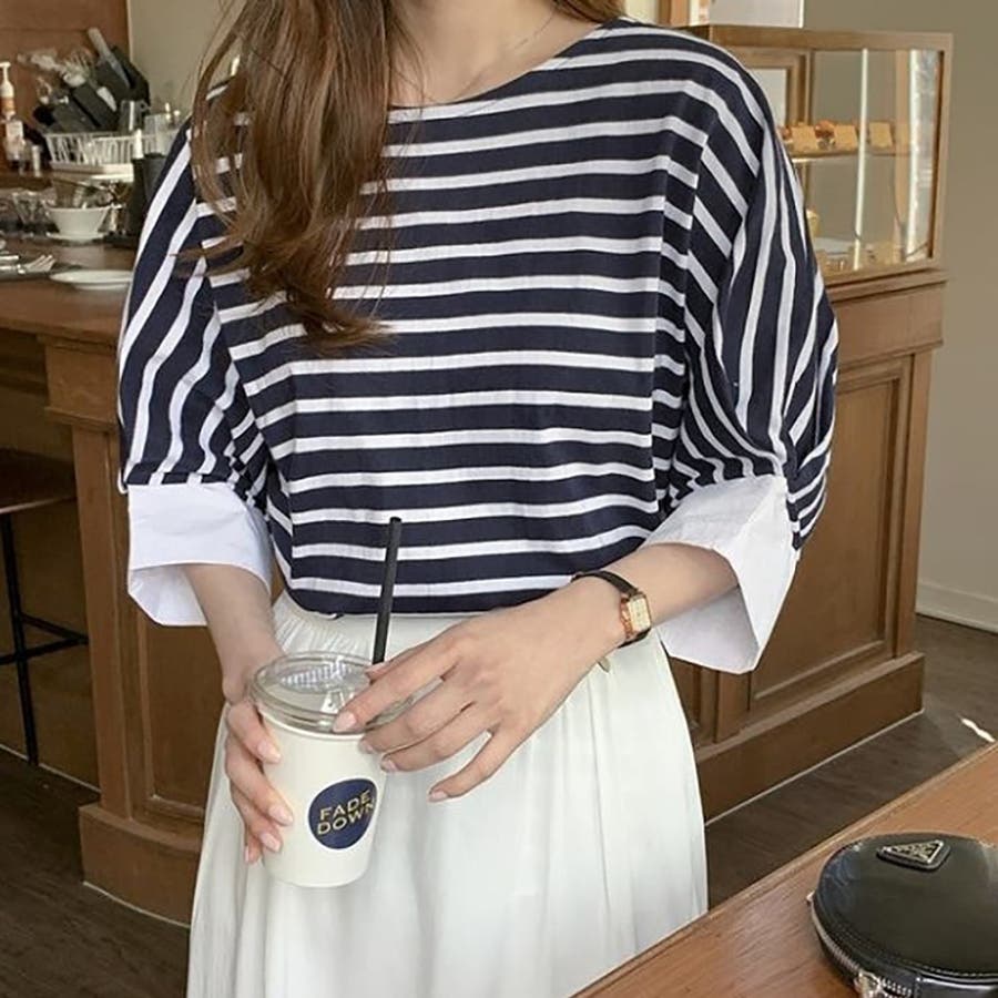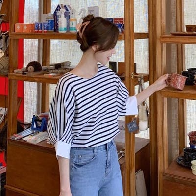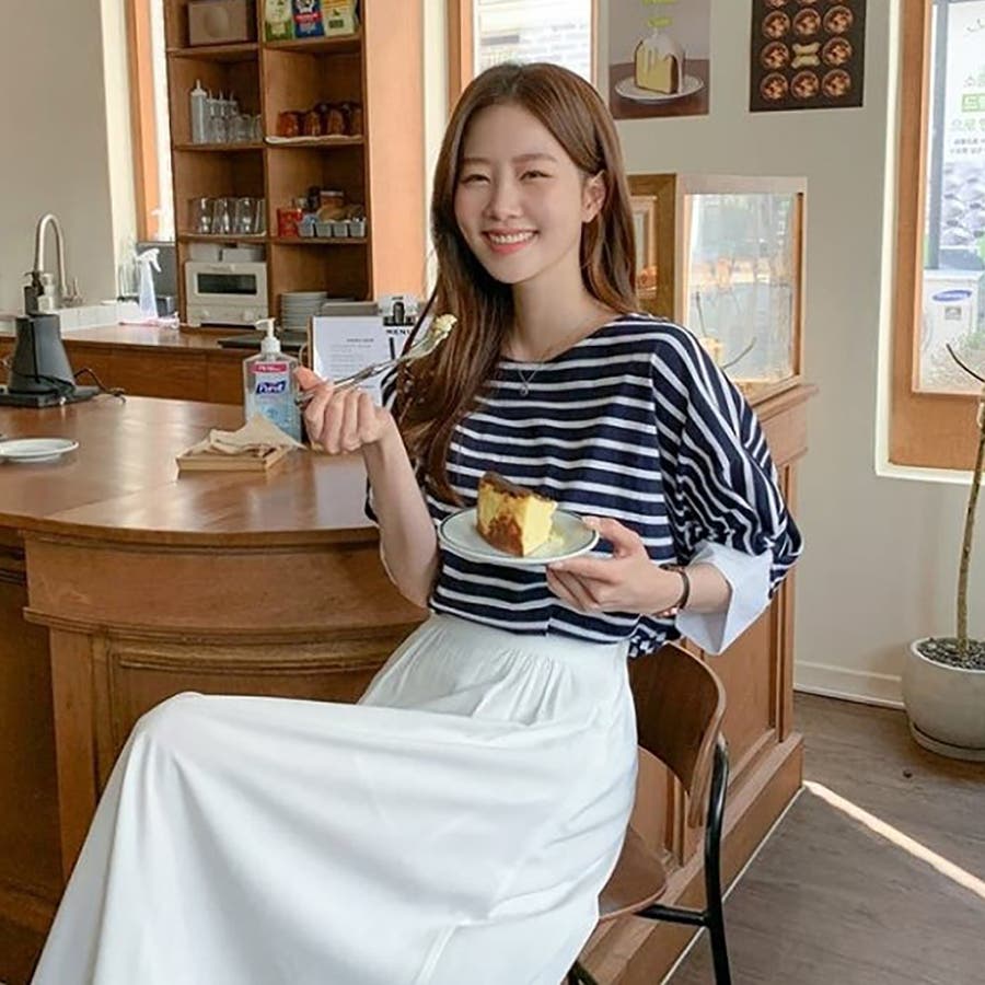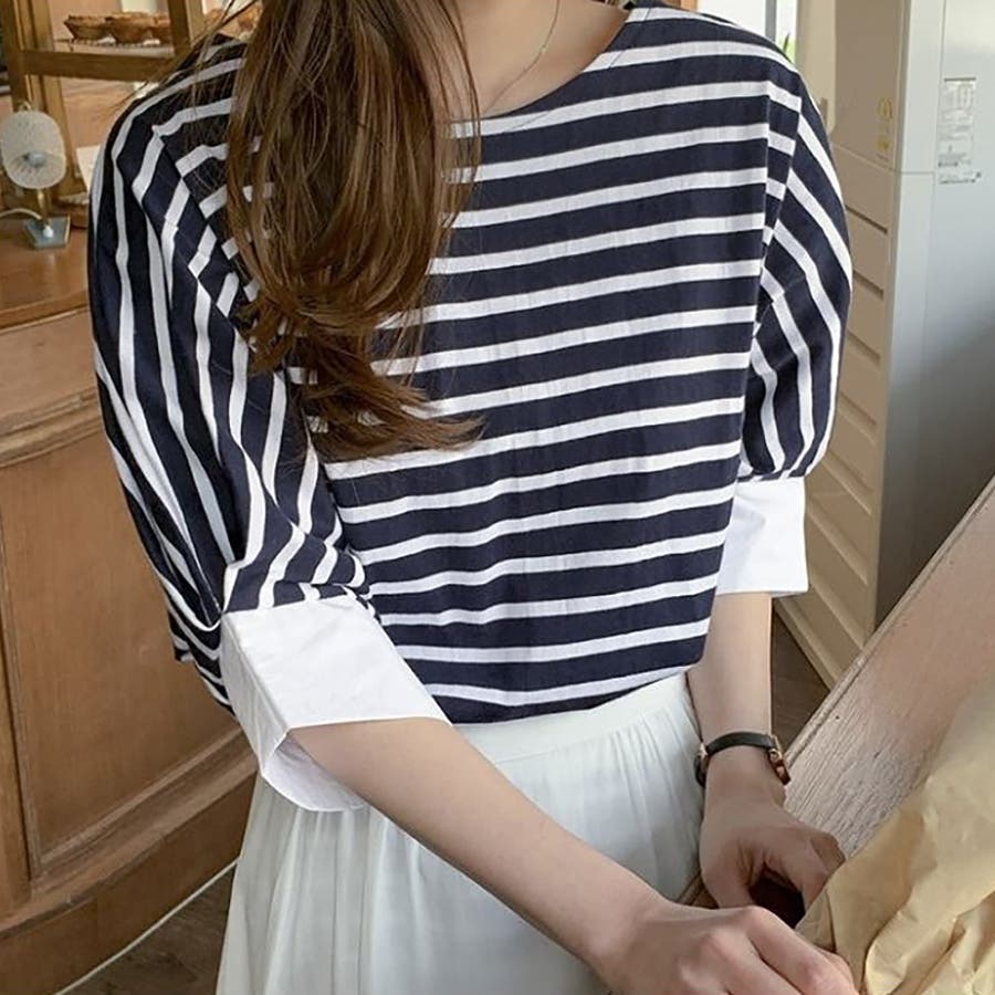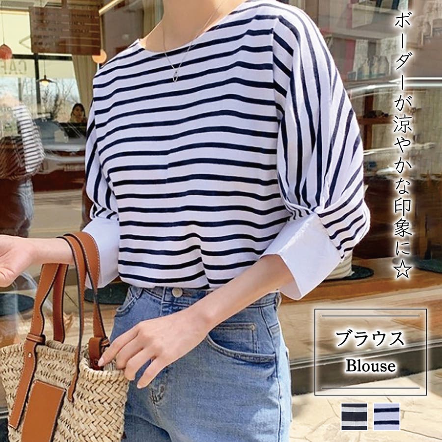バルーンスリーブボートネックボーダートップス【韓国ファッション】
