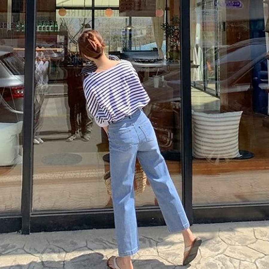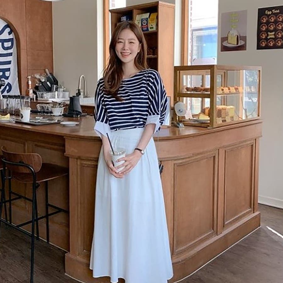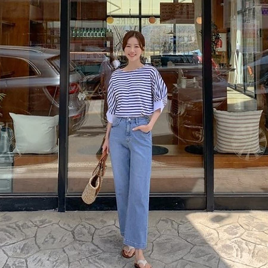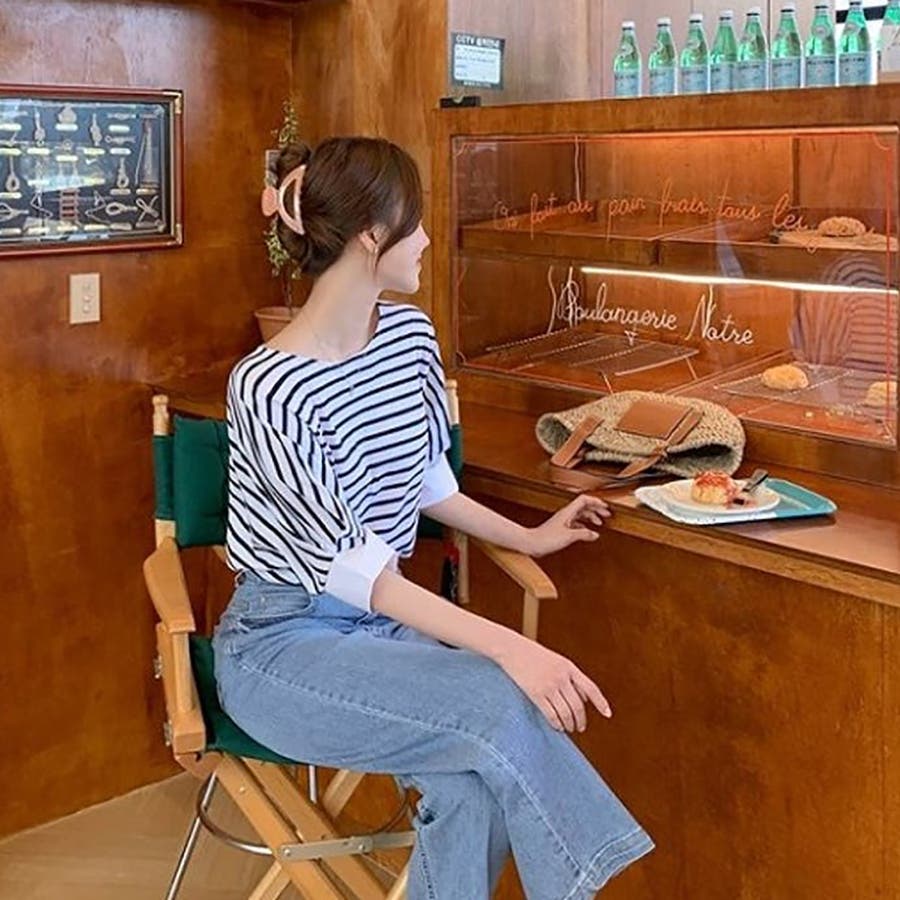 バルーンスリーブボートネックボーダートップス【韓国ファッション】
