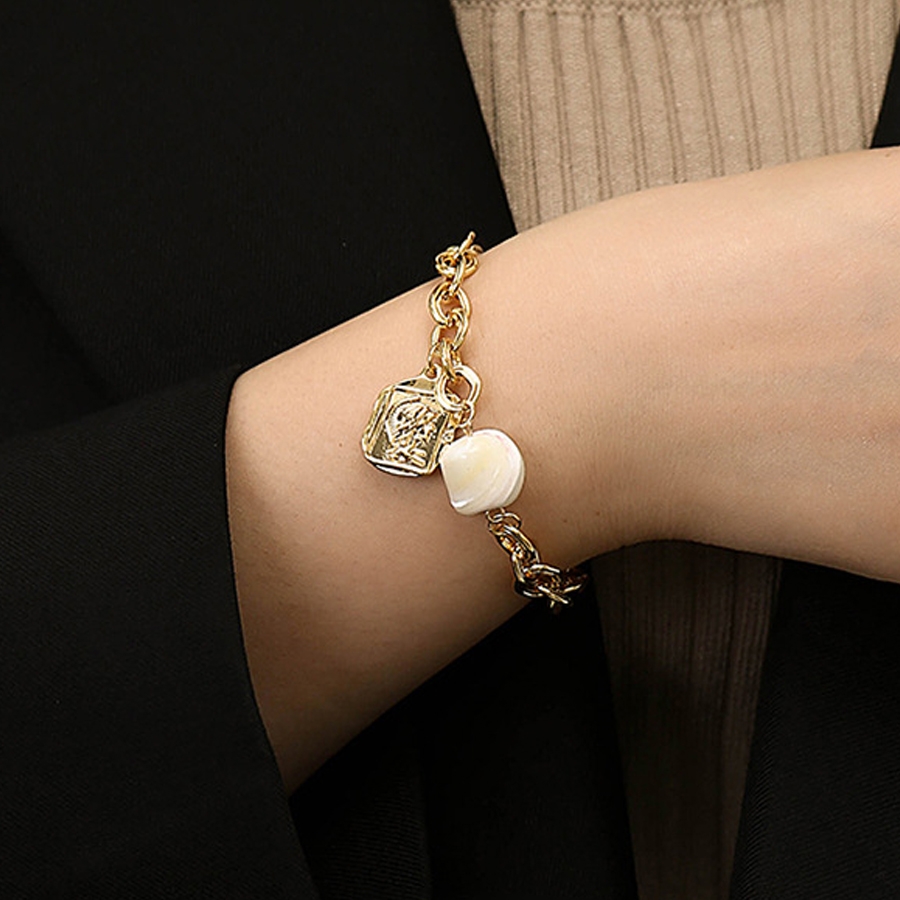 スクエアモチーフ×ストーン×金属チェーンの組み合わせで、洒落感満載のブレスレットです。