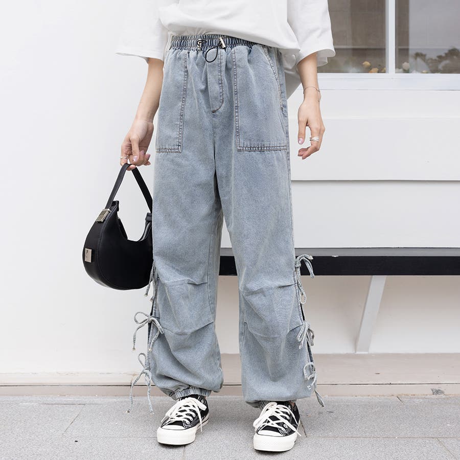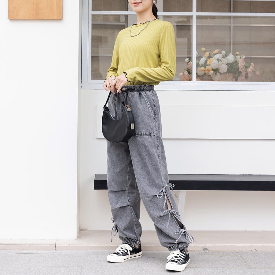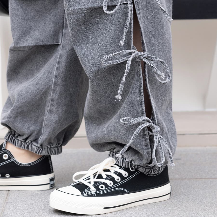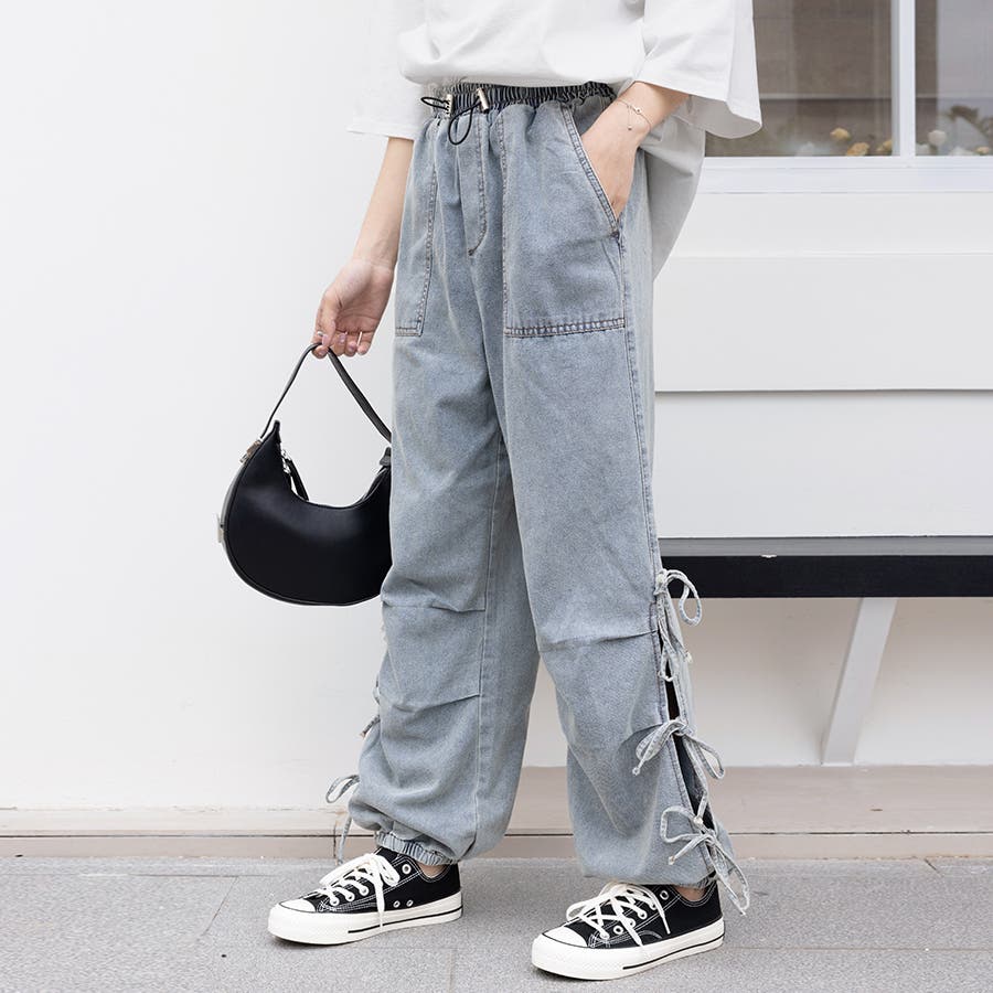 裾にあるリボンのデザインがカジュアルなデニムパンツにガーリーさをプラス。