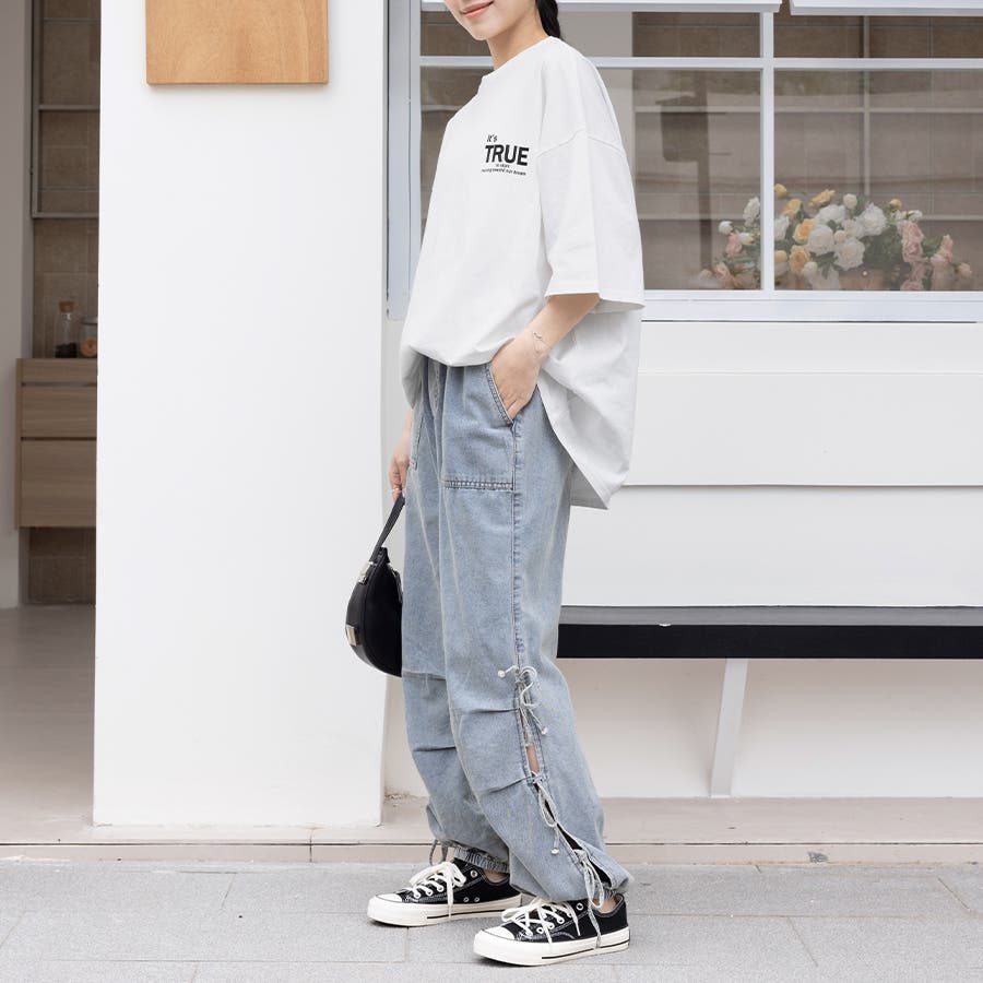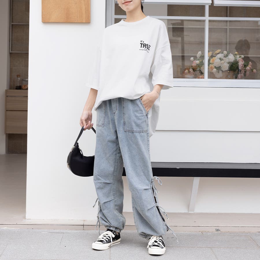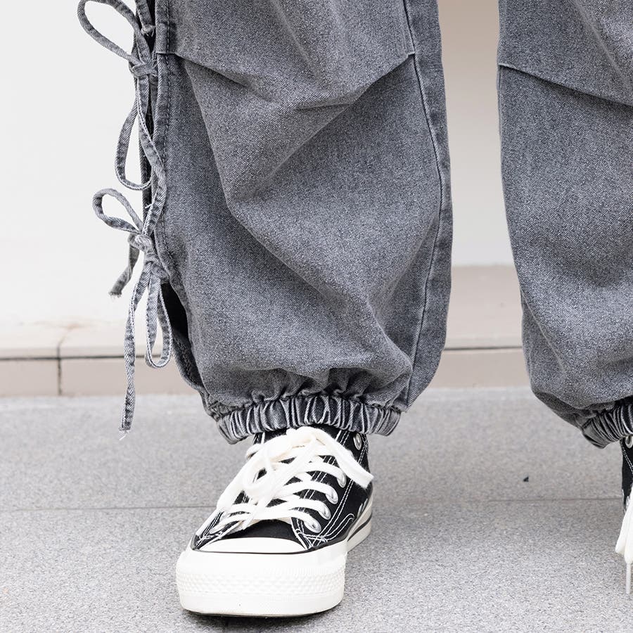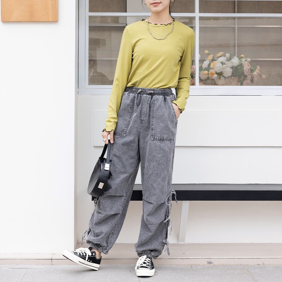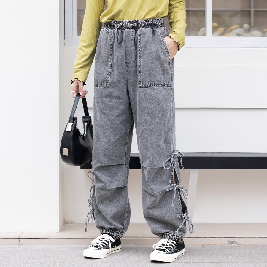 裾にあるリボンのデザインがカジュアルなデニムパンツにガーリーさをプラス。