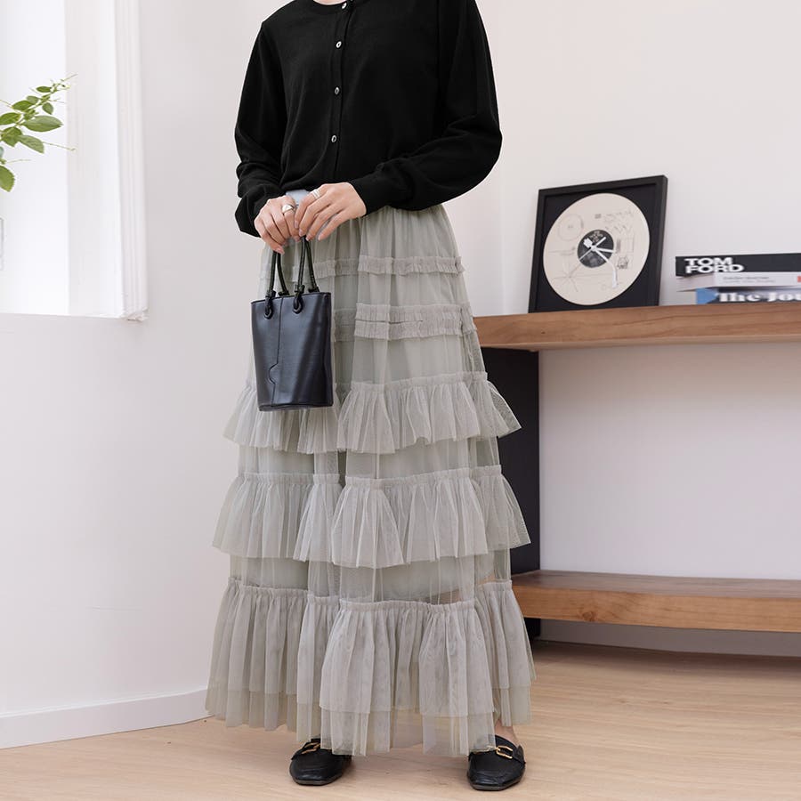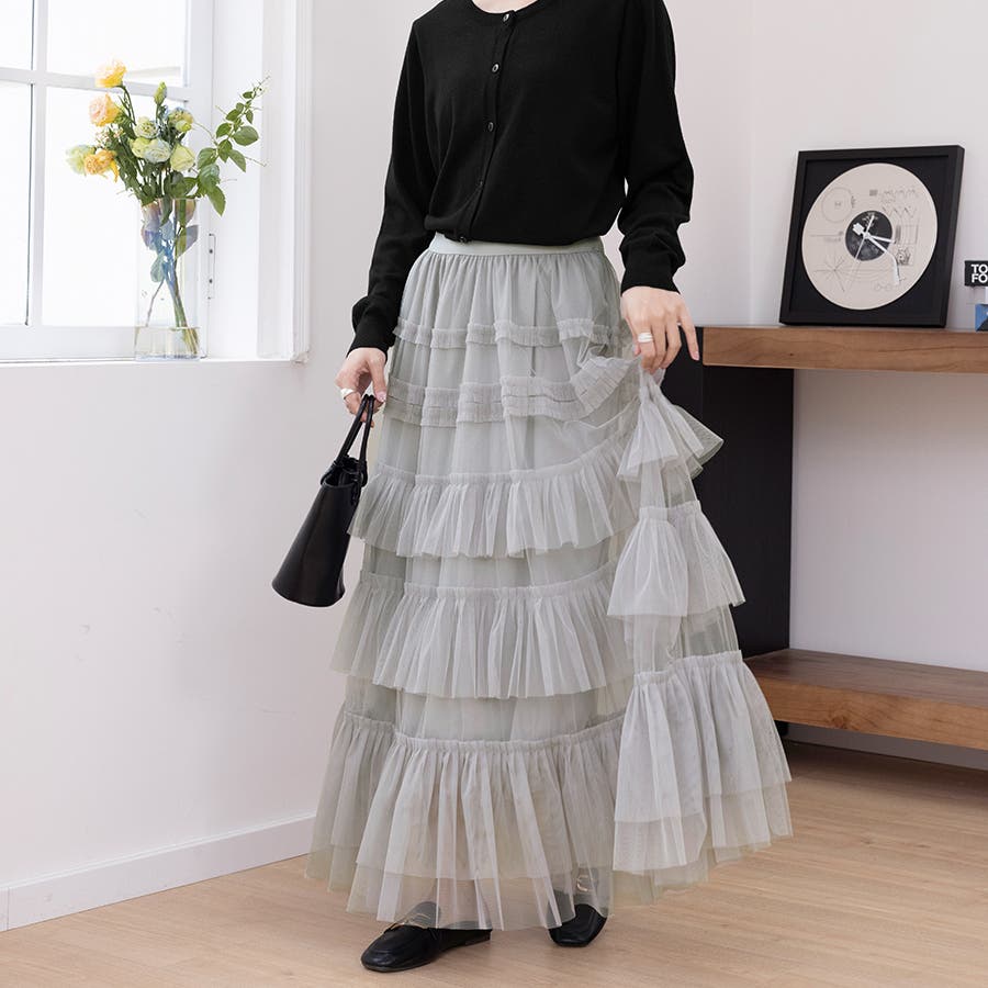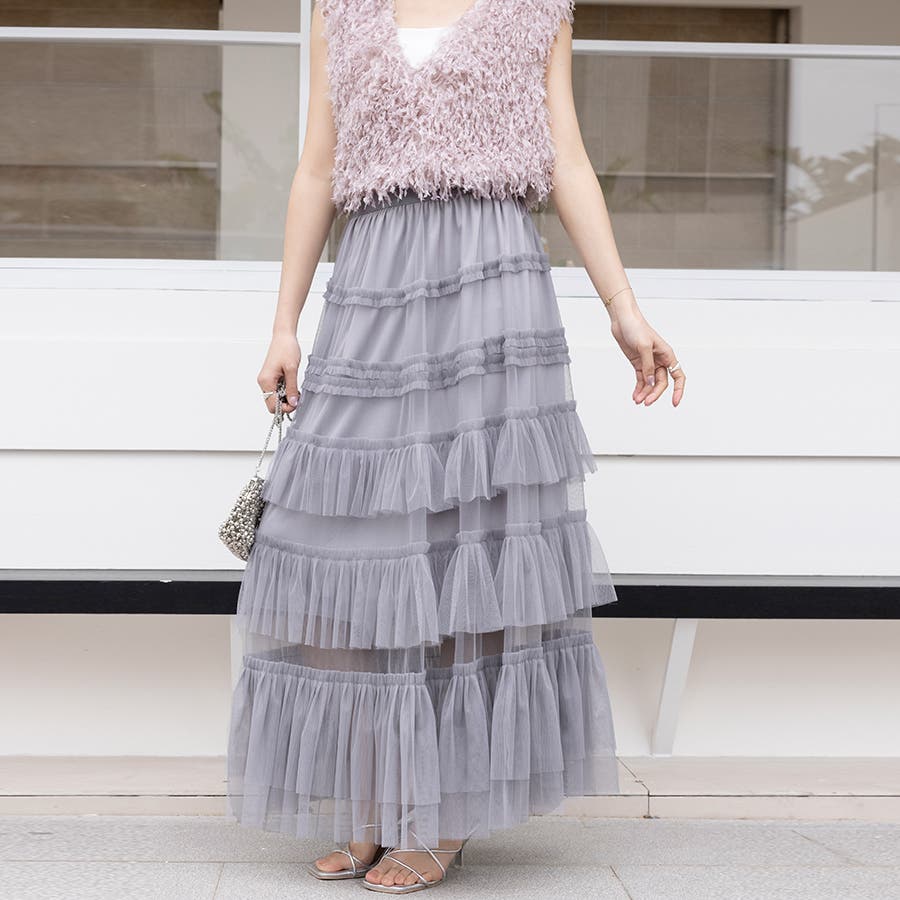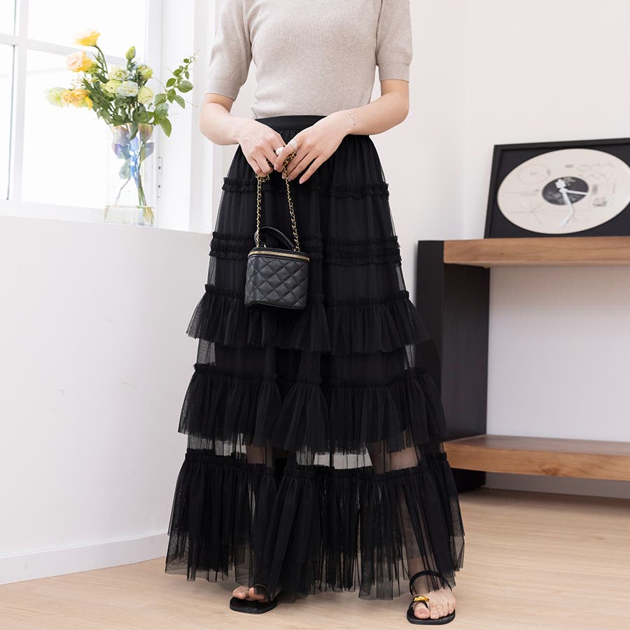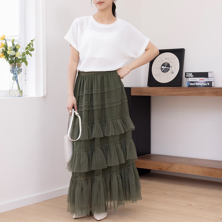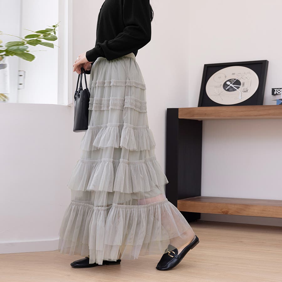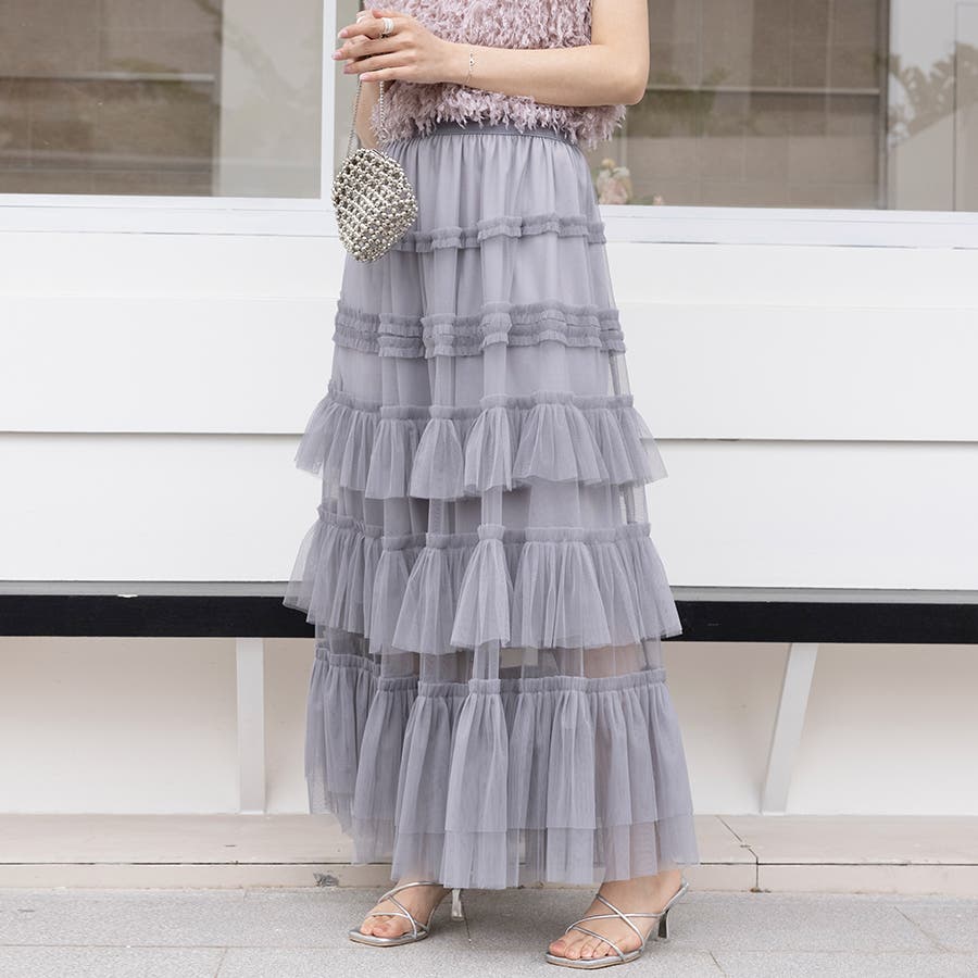 シアー素材を使用したティアードデザインがチャームポイントのAラインロングスカートが新登場!