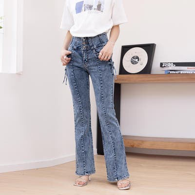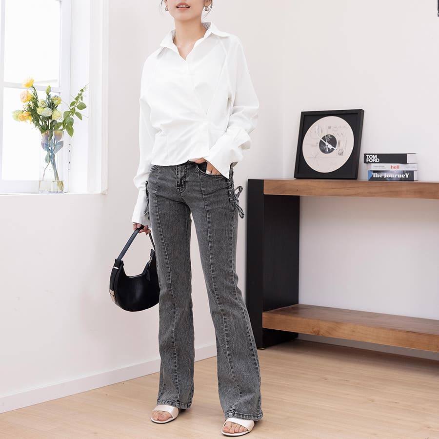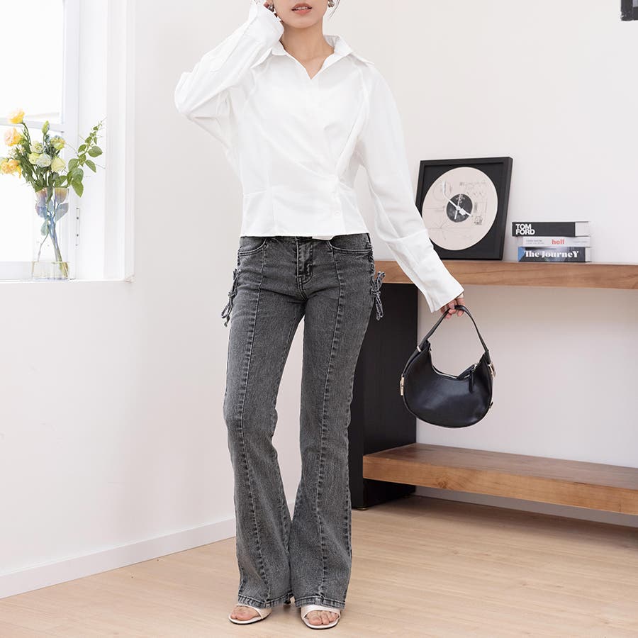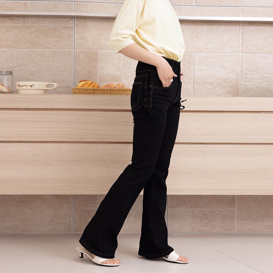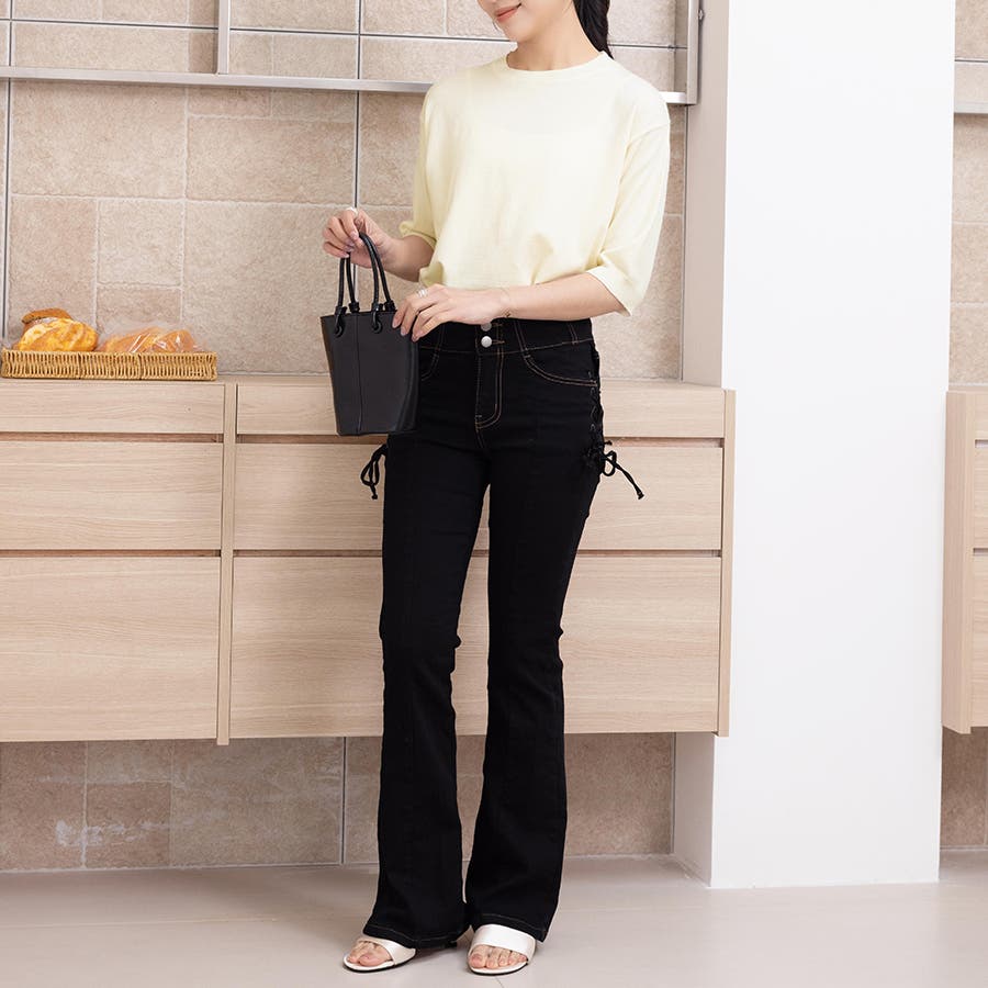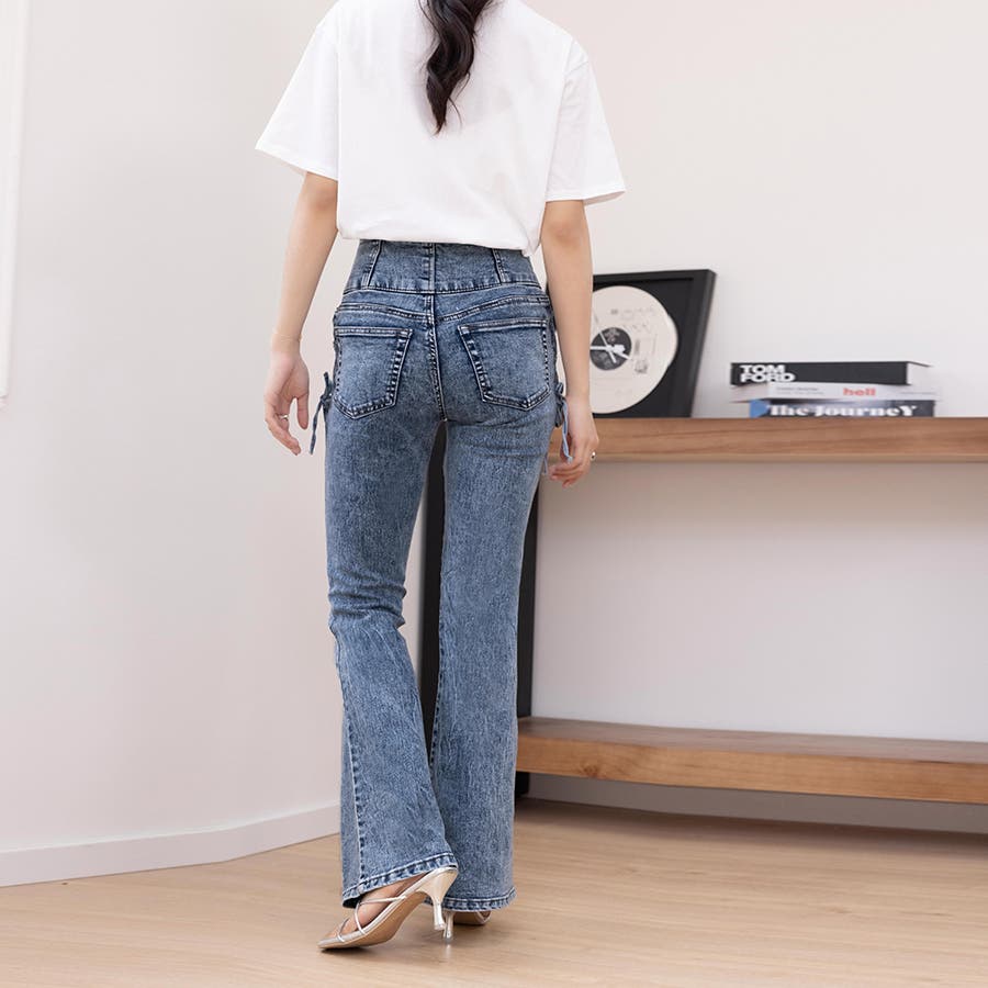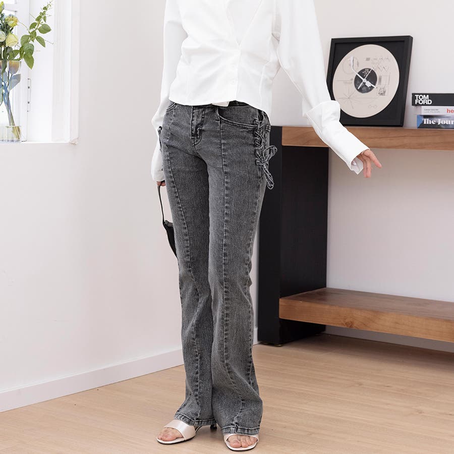 左右の腰元にあるリボンのデザインがカジュアルなデニムパンツにガーリーさをプラス。