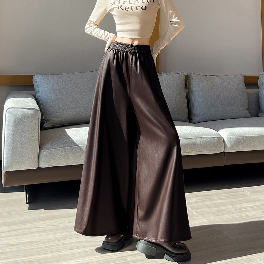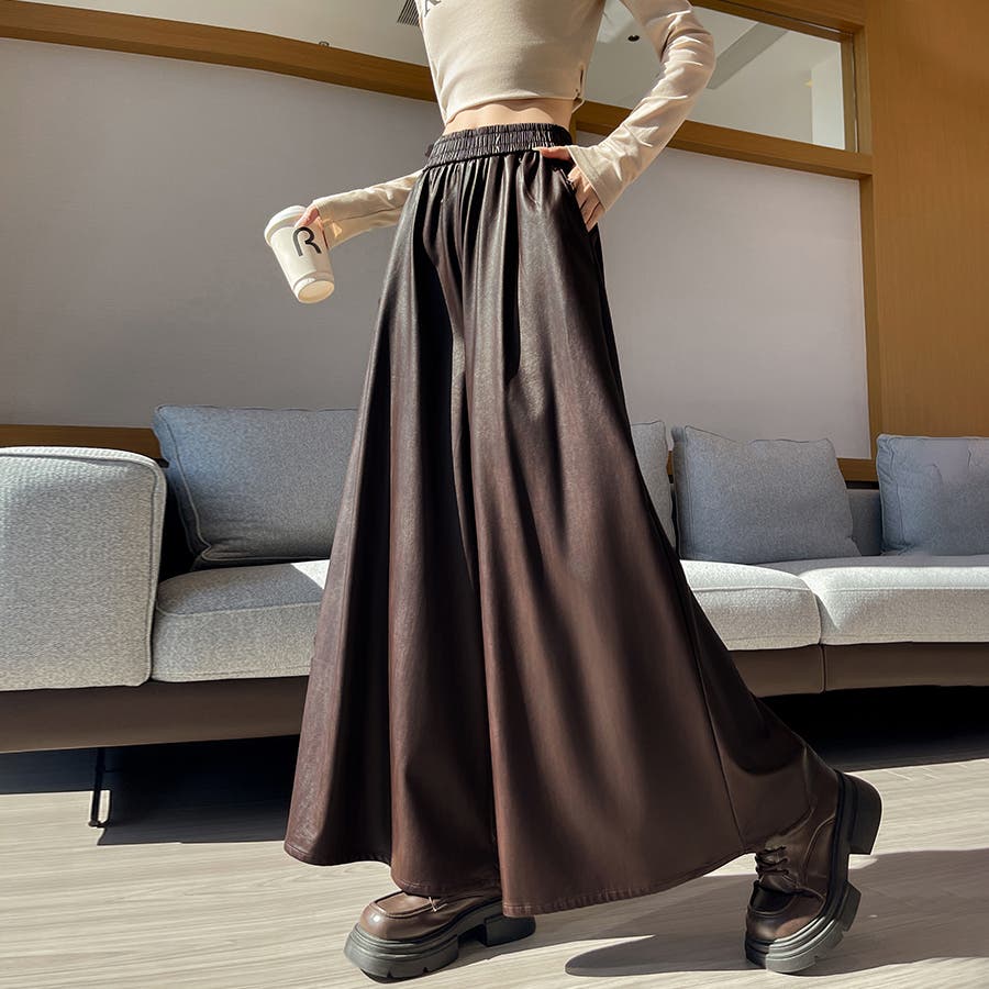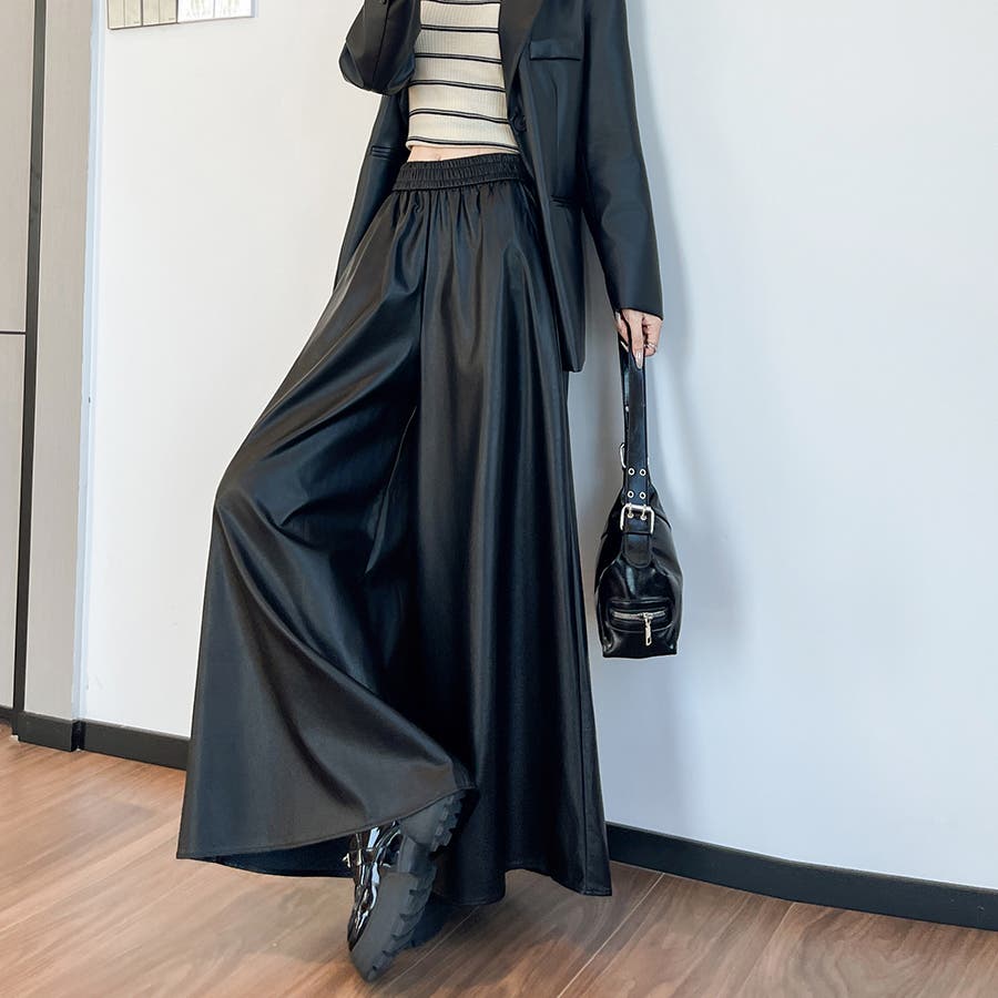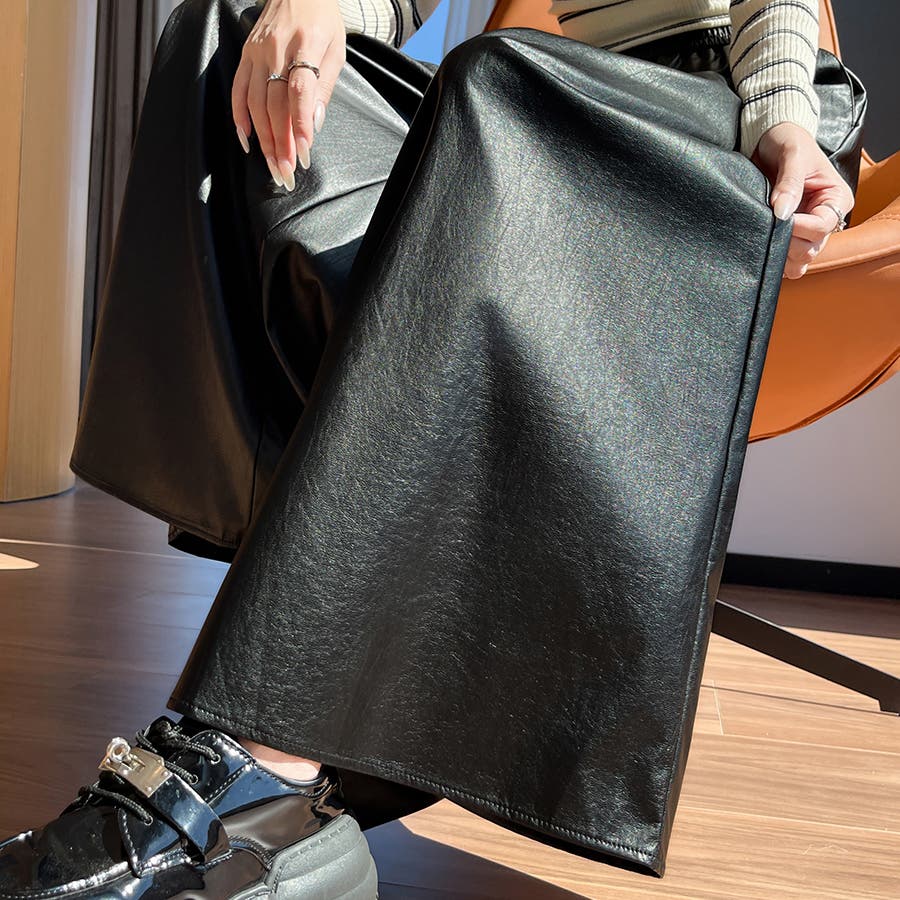 フェイクレザー素材を使用したワイドシルエットのロングパンツです。