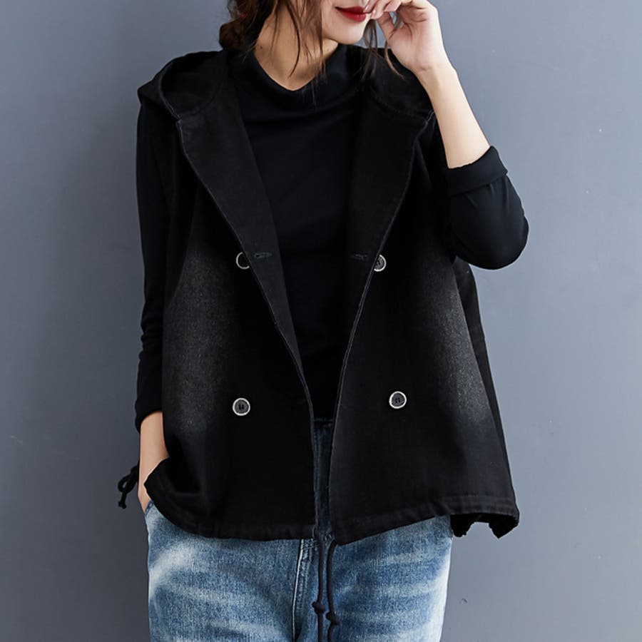 モードな雰囲気漂う、フード付きダブルボタンベスト。