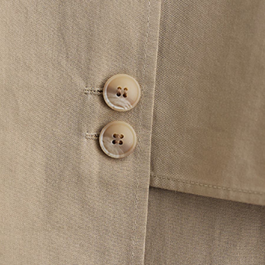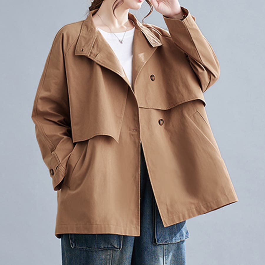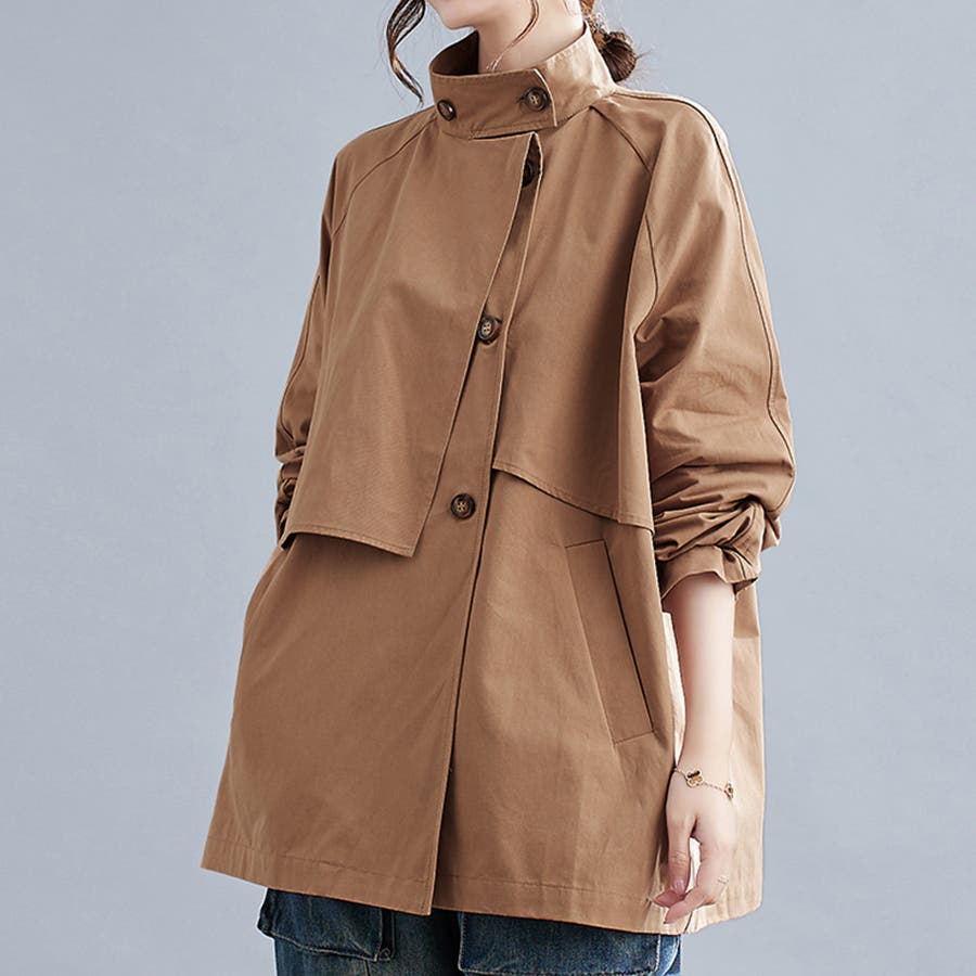 ケープ風の切り替えが印象的な、クラシカルなトレンチコート。