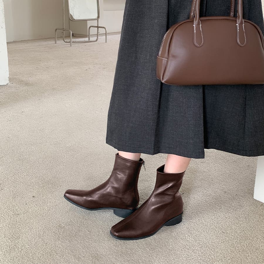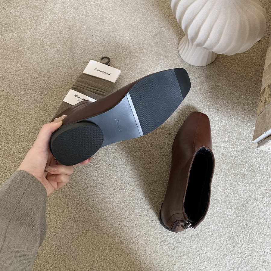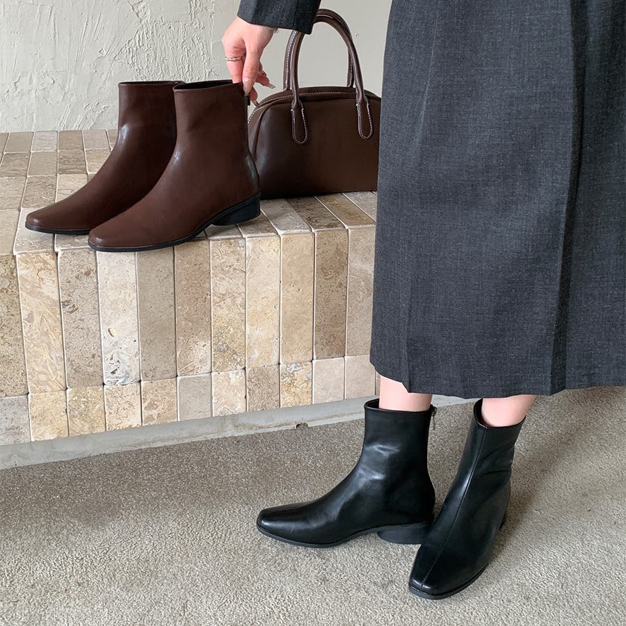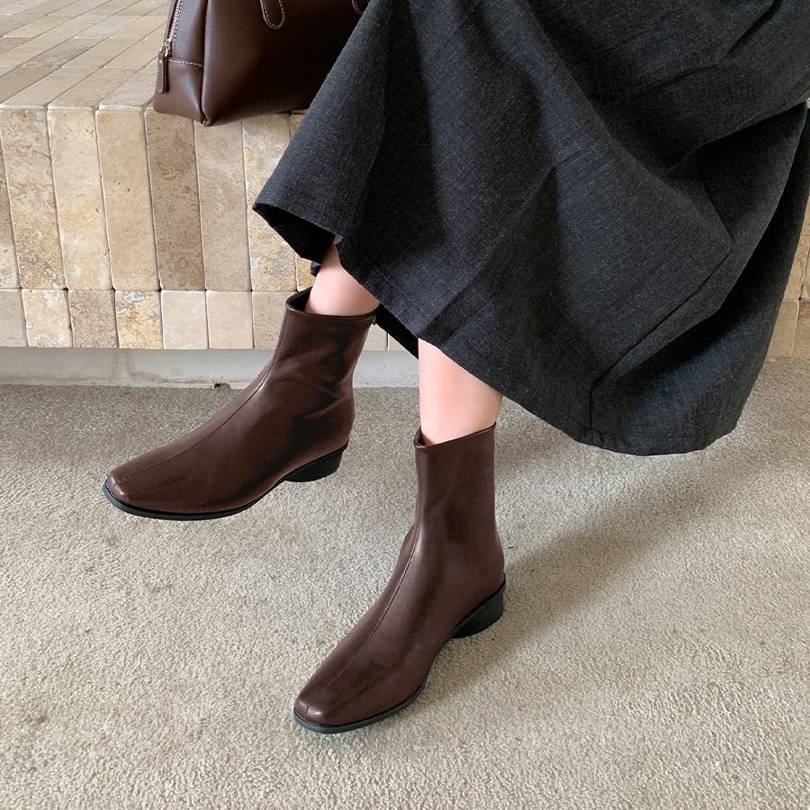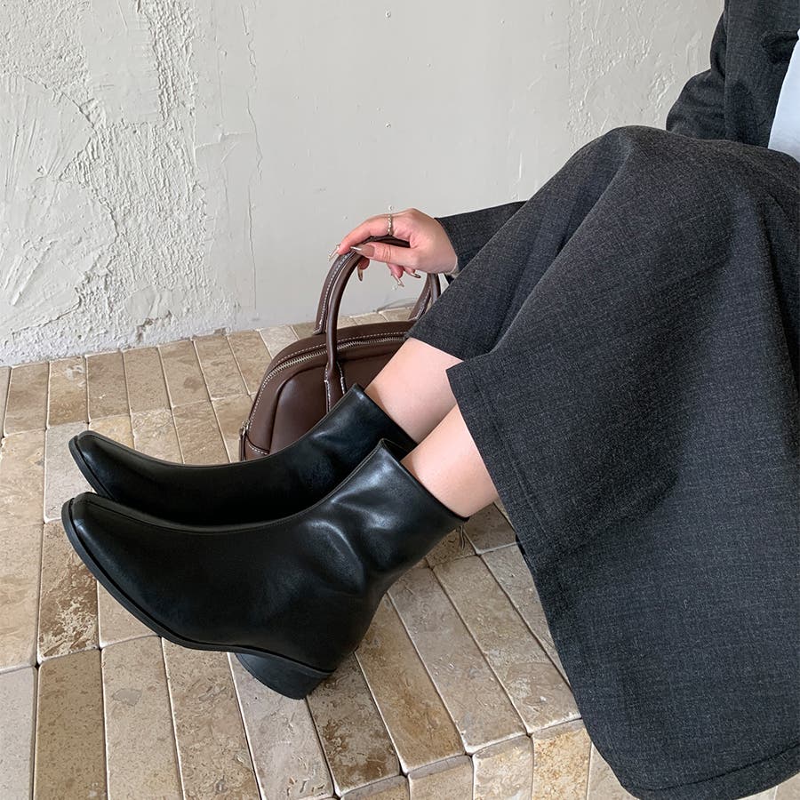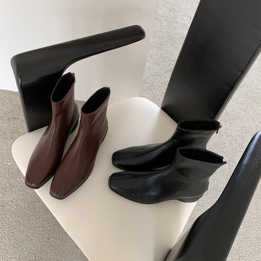 スクエアトゥと太ヒールが特徴のショートブーツです。
