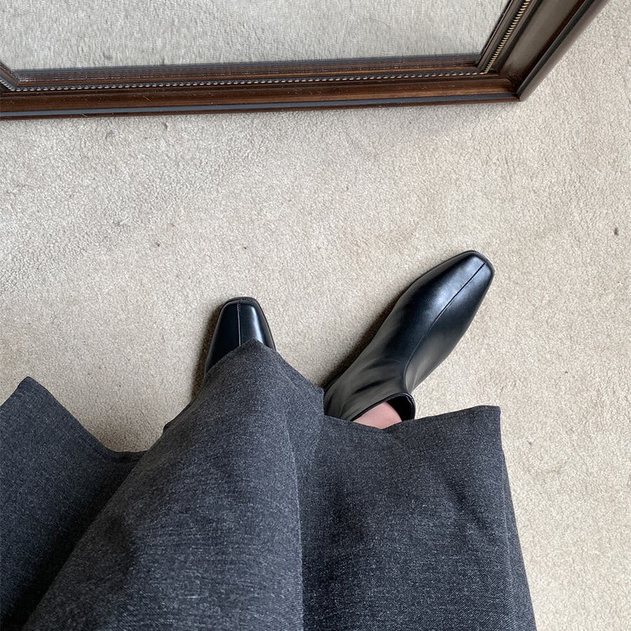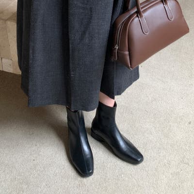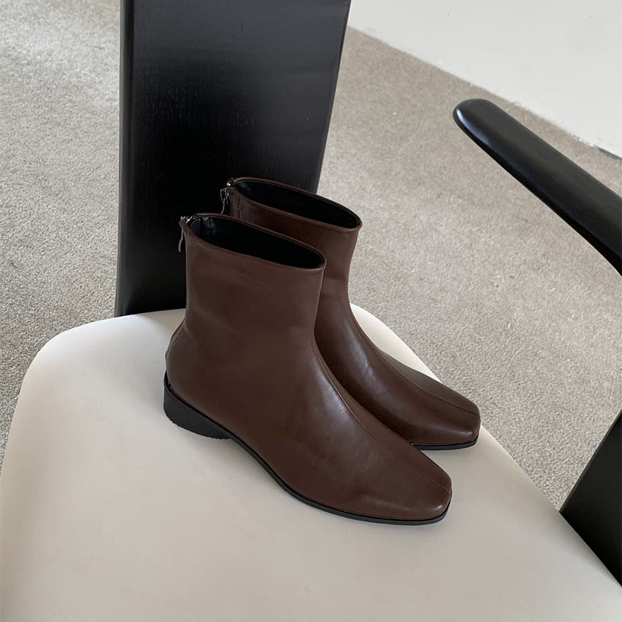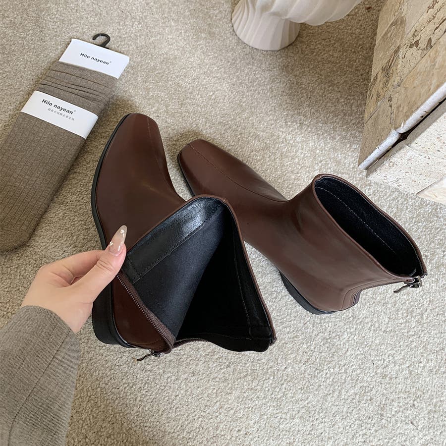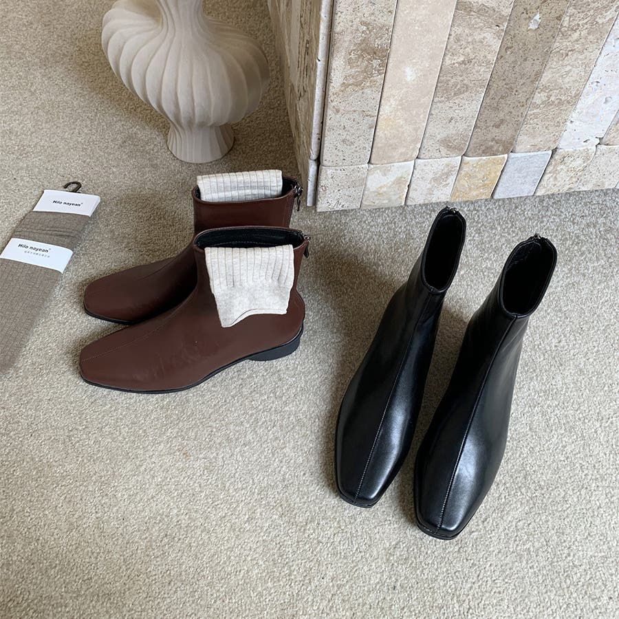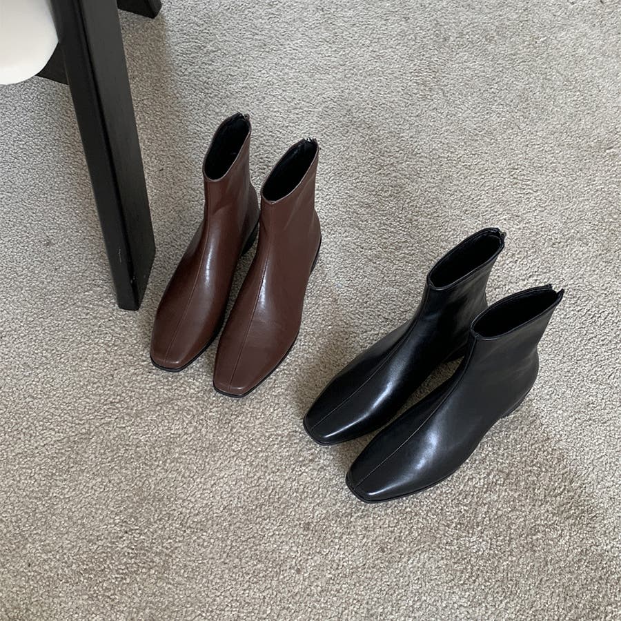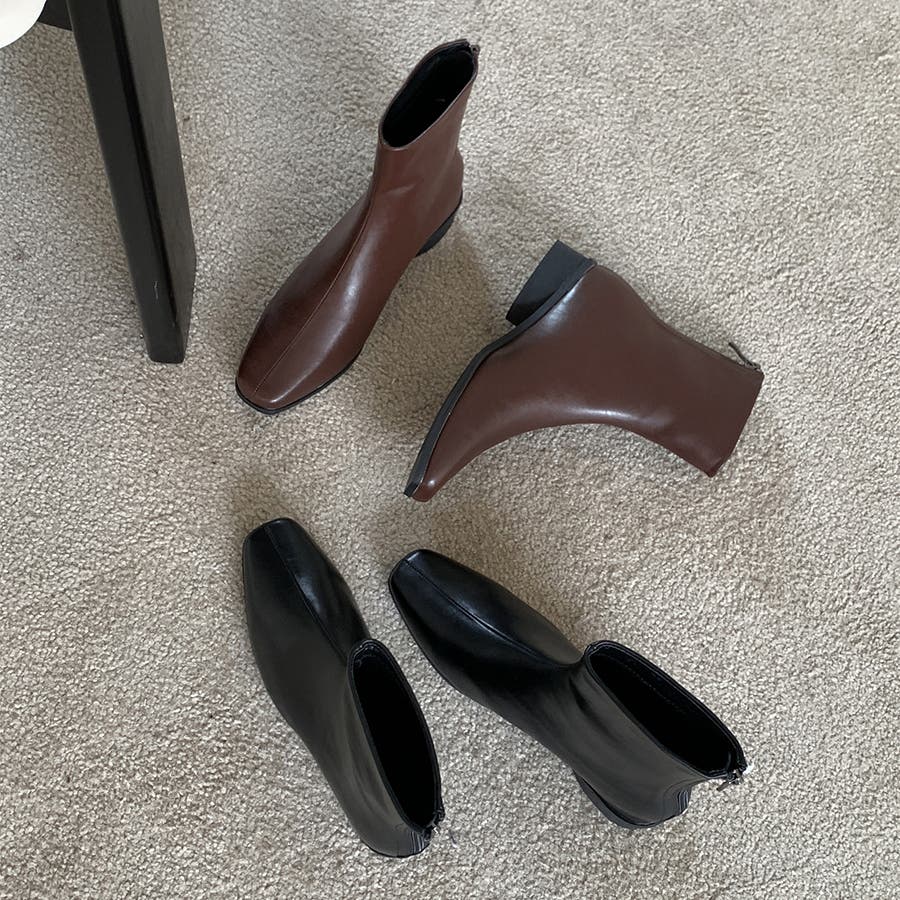 スクエアトゥと太ヒールが特徴のショートブーツです。