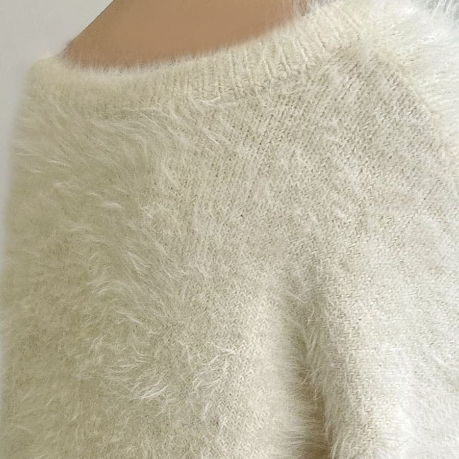 フワフワの肌触りの良いシャギーニット素材を使用し、暖かく柔らかい着心地。