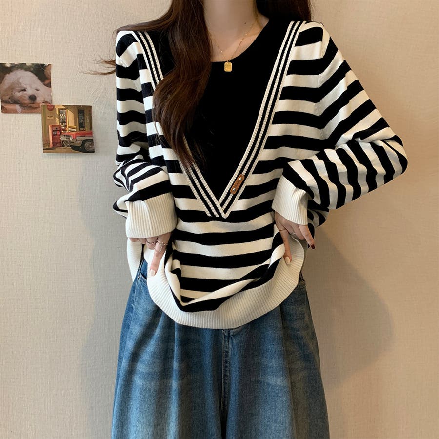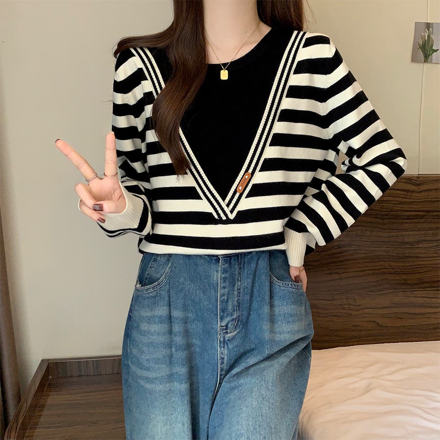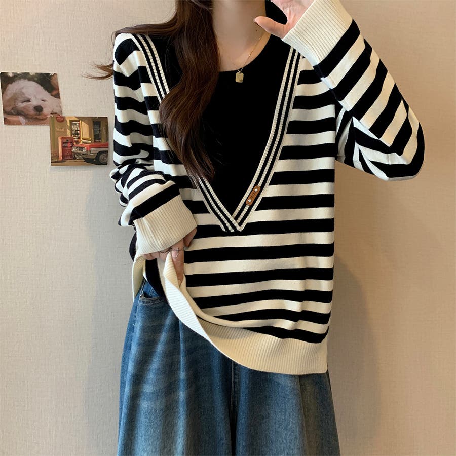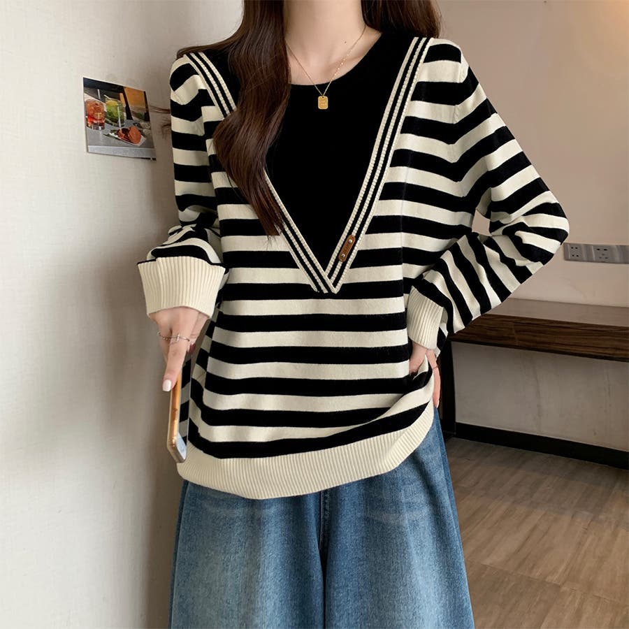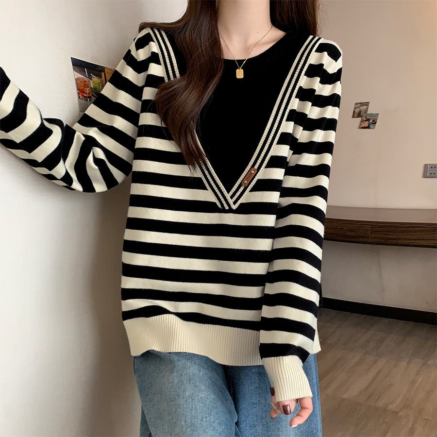 ゆるっと着られるボーダー柄ニットは、深めのVネックで顔まわりをすっきり見せてくれる優秀アイテム。