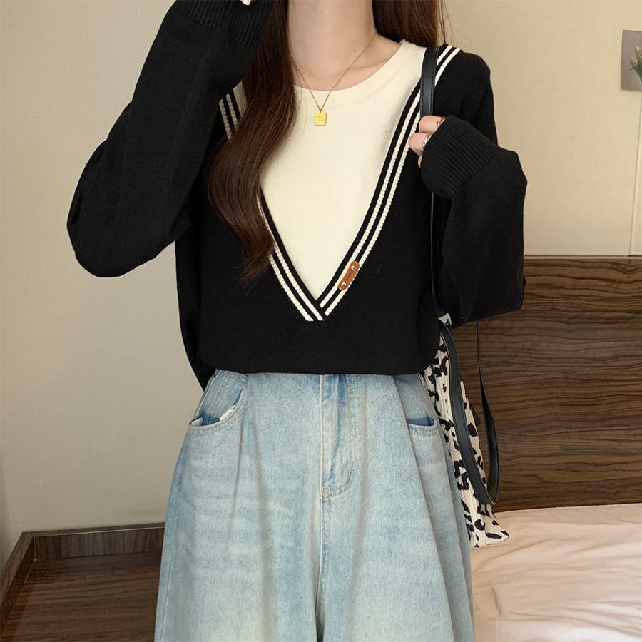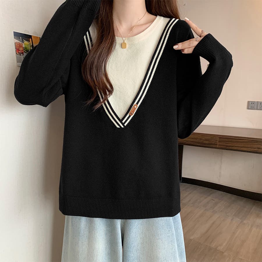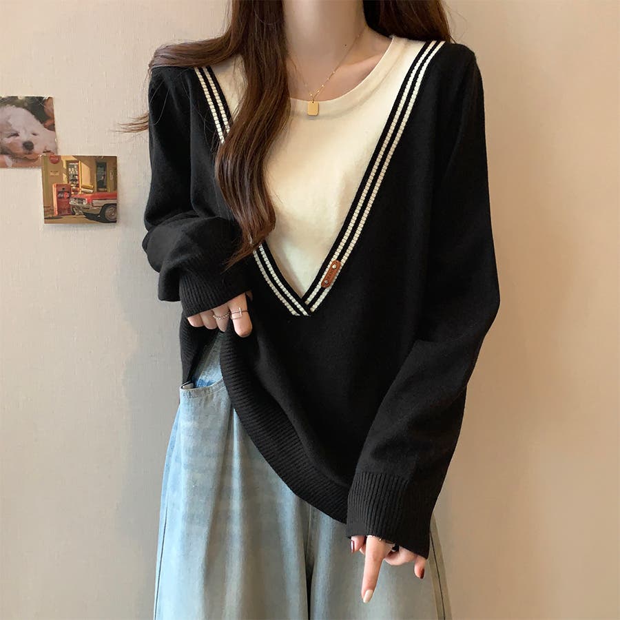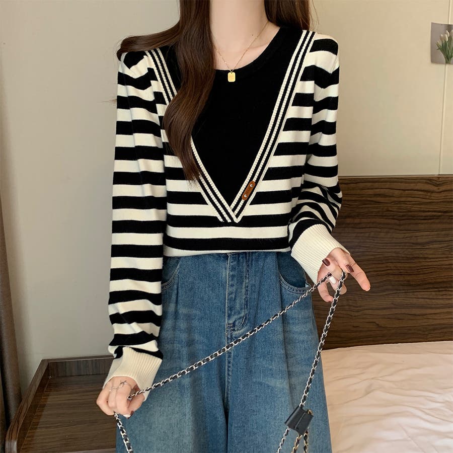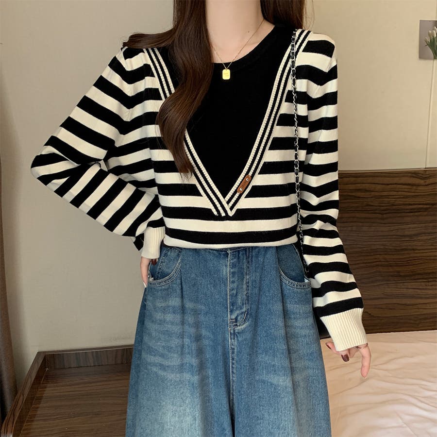 ゆるっと着られるボーダー柄ニットは、深めのVネックで顔まわりをすっきり見せてくれる優秀アイテム。