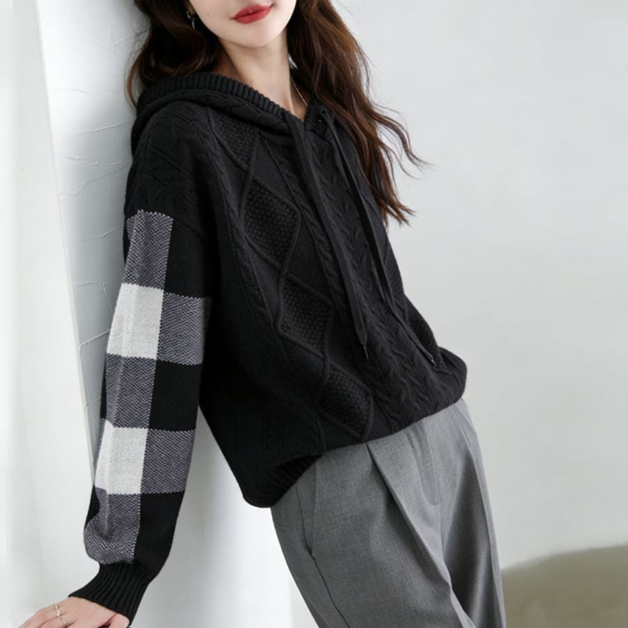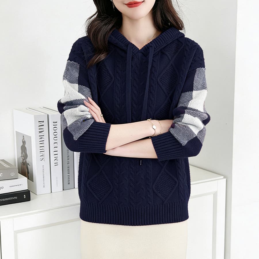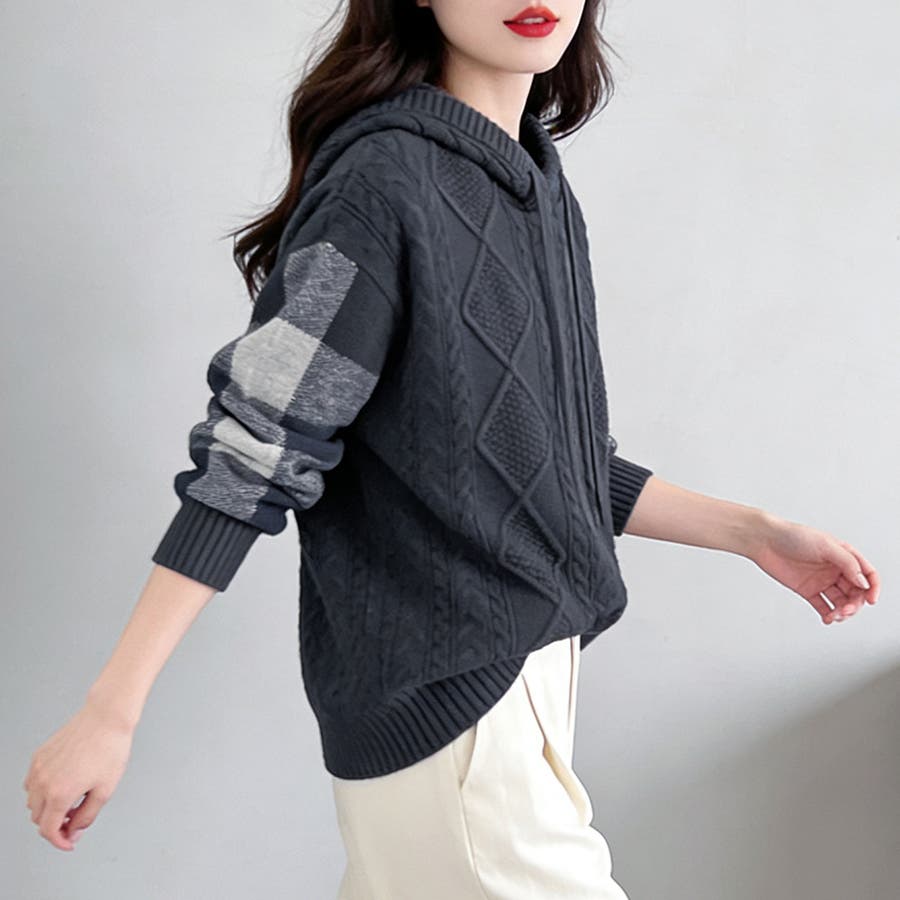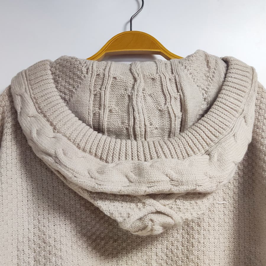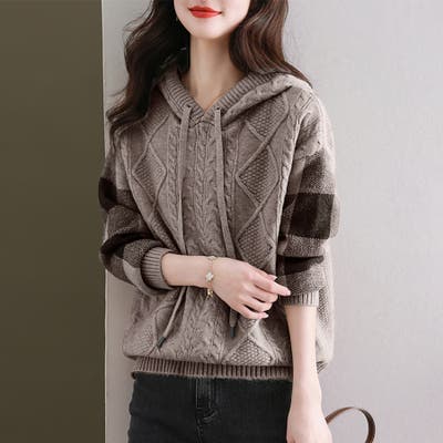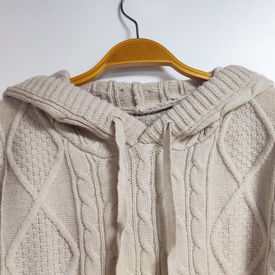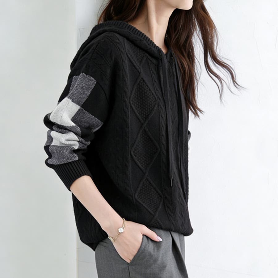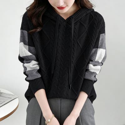 ケーブル編みの立体感とフード付きデザインが魅力の長袖ニット。