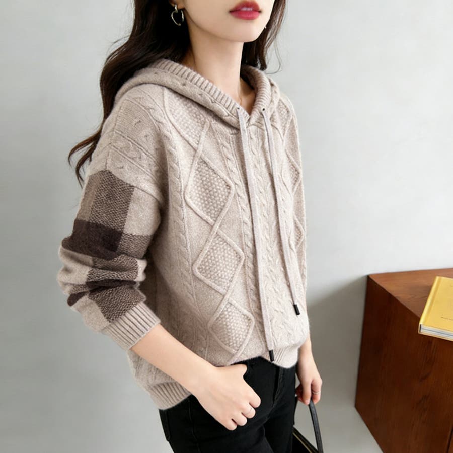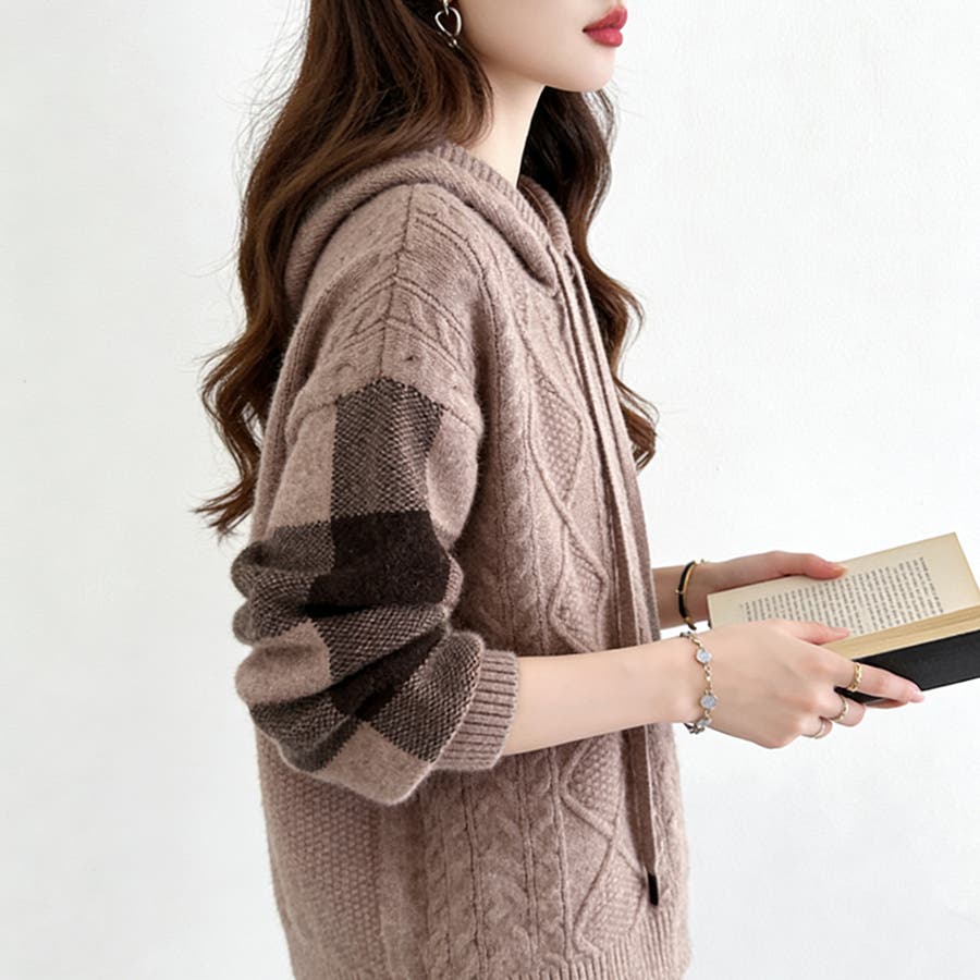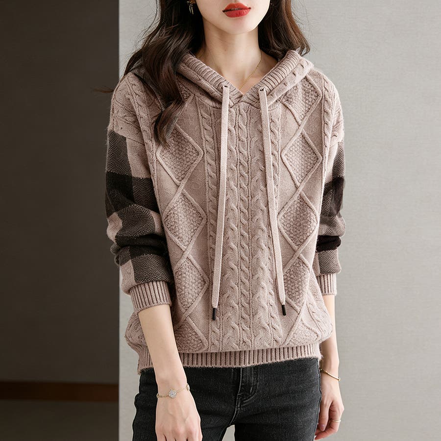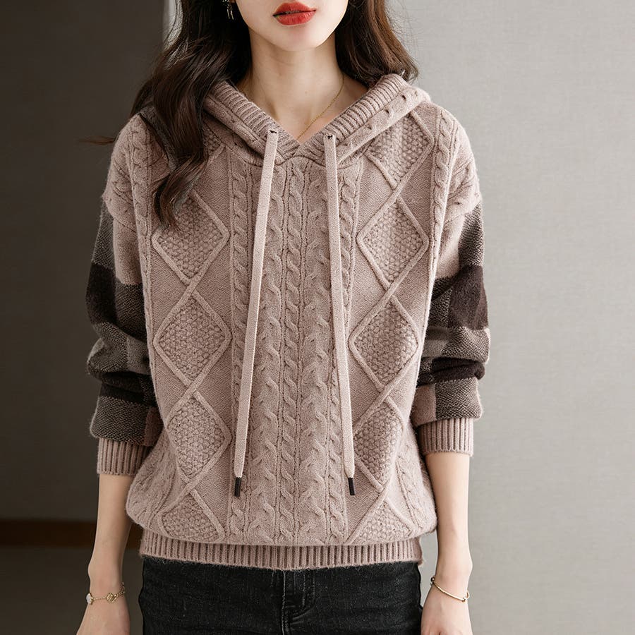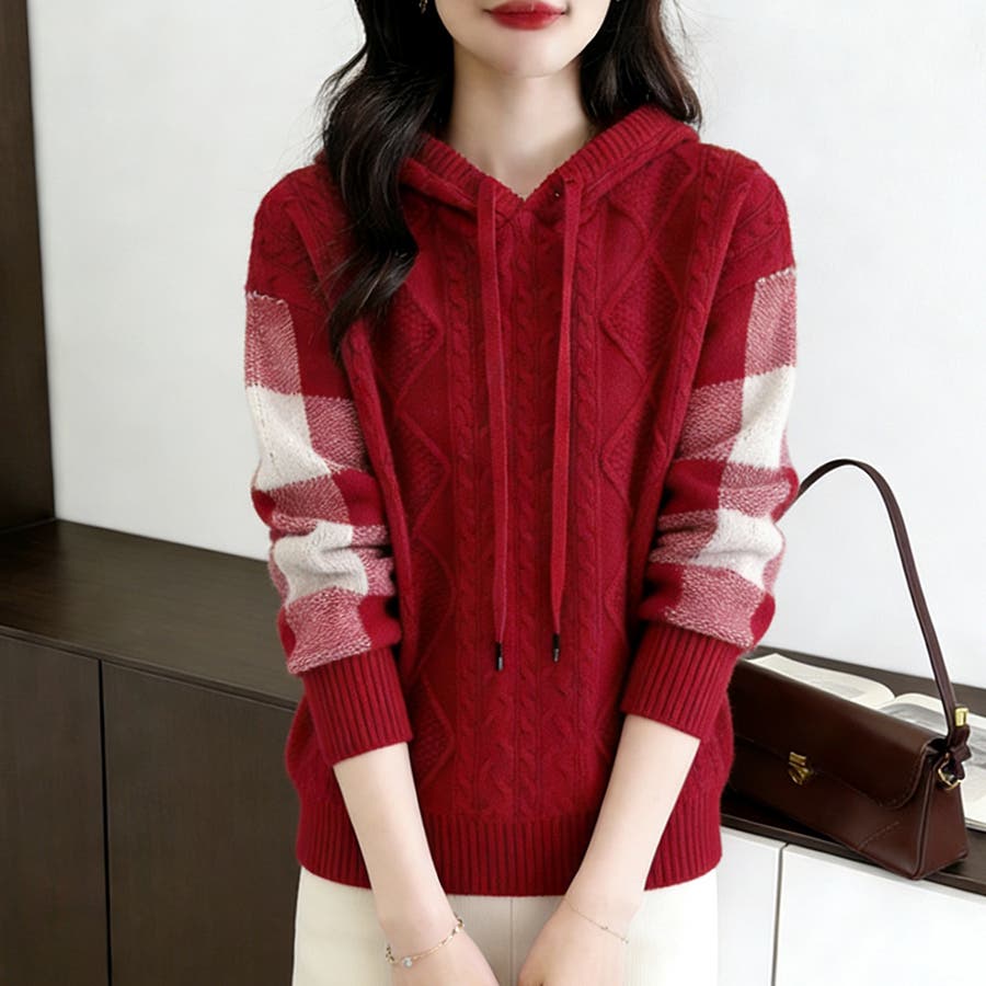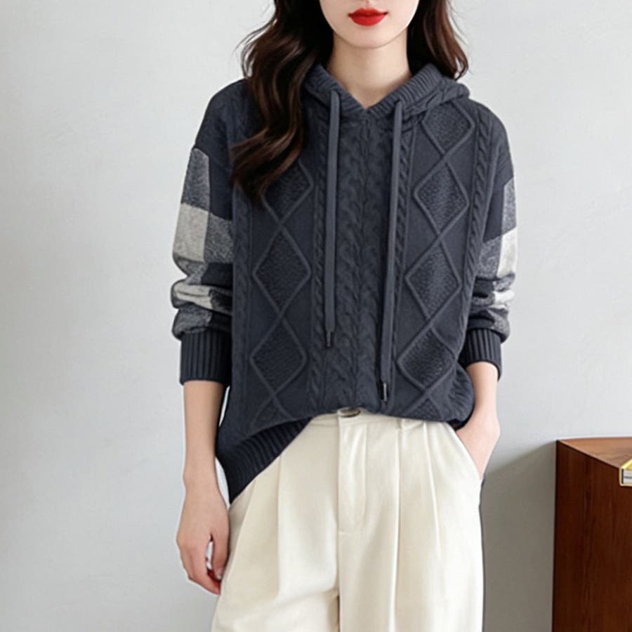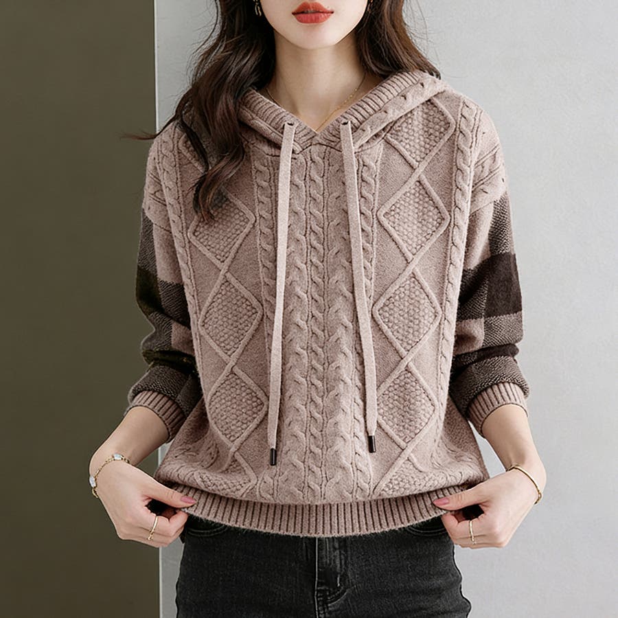 ケーブル編みの立体感とフード付きデザインが魅力の長袖ニット。