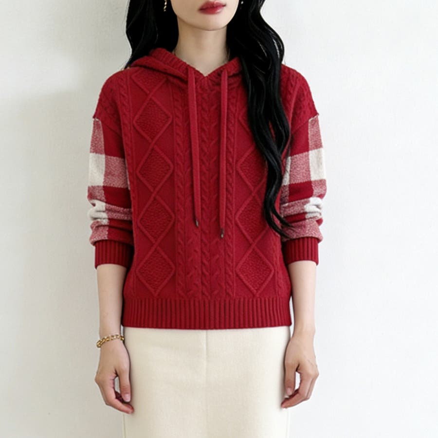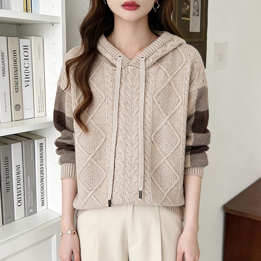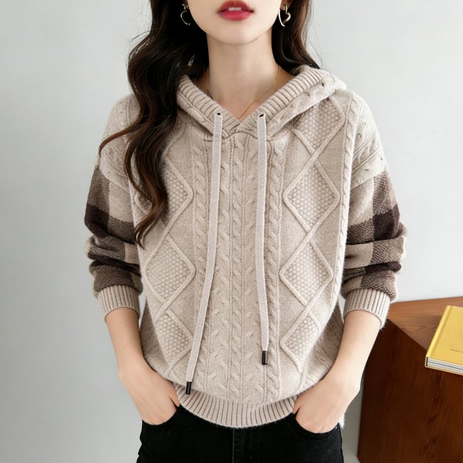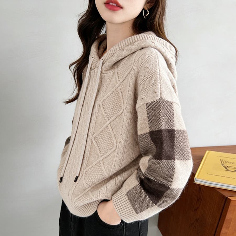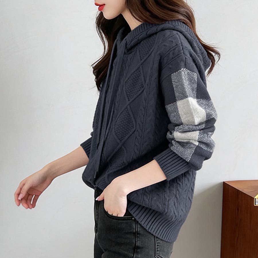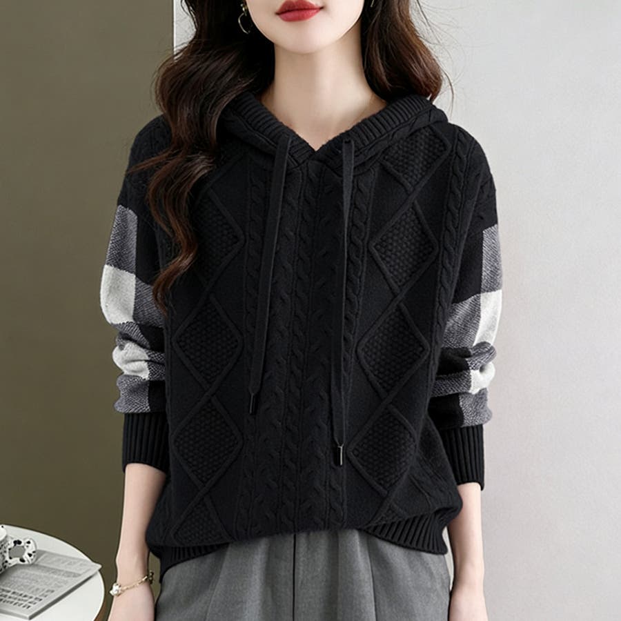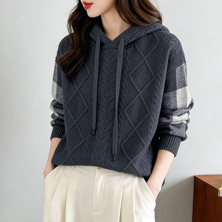 ケーブル編みの立体感とフード付きデザインが魅力の長袖ニット。