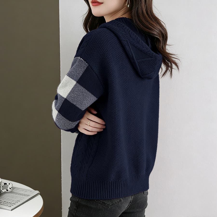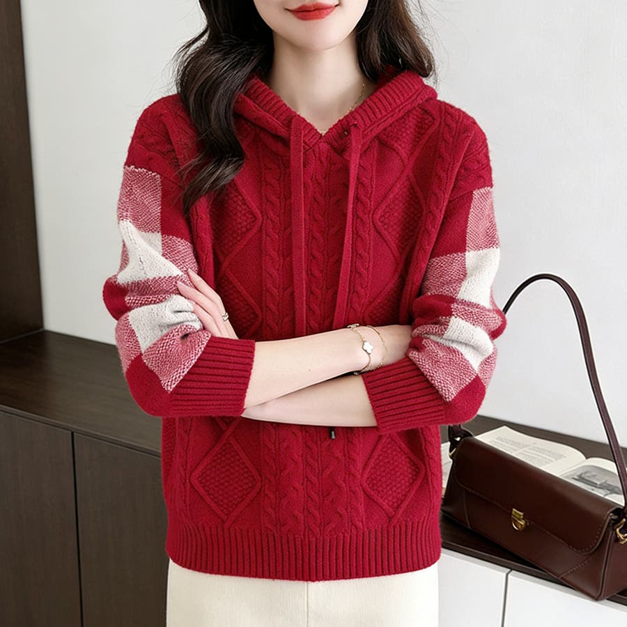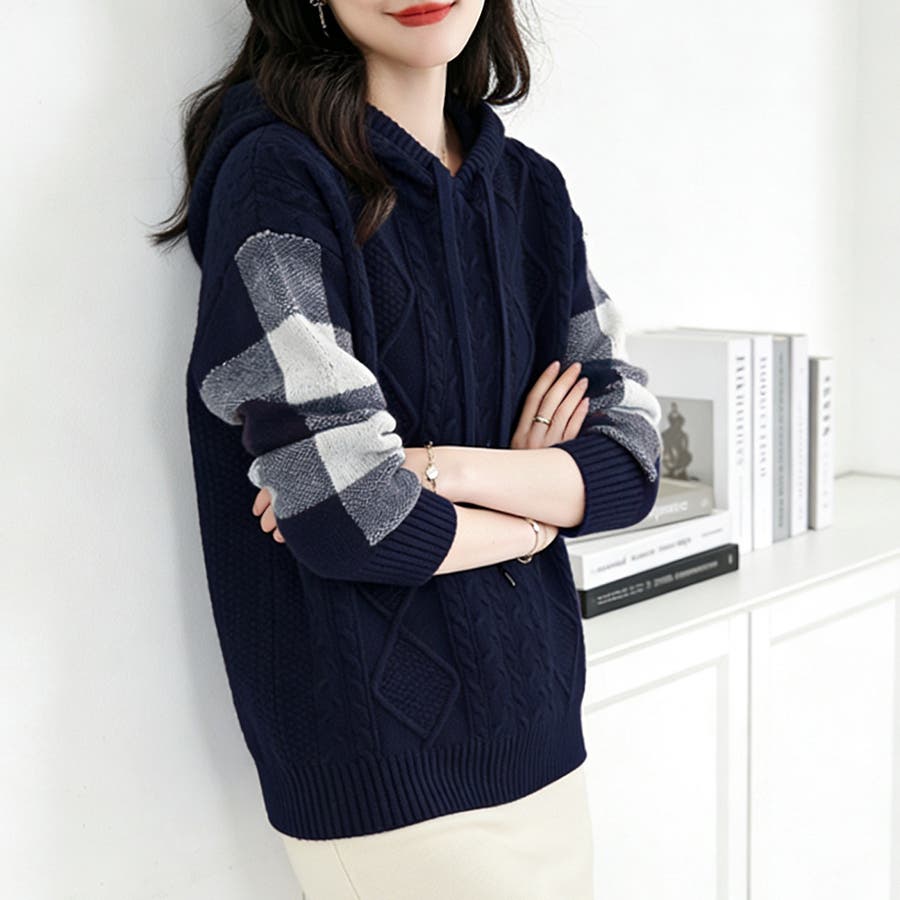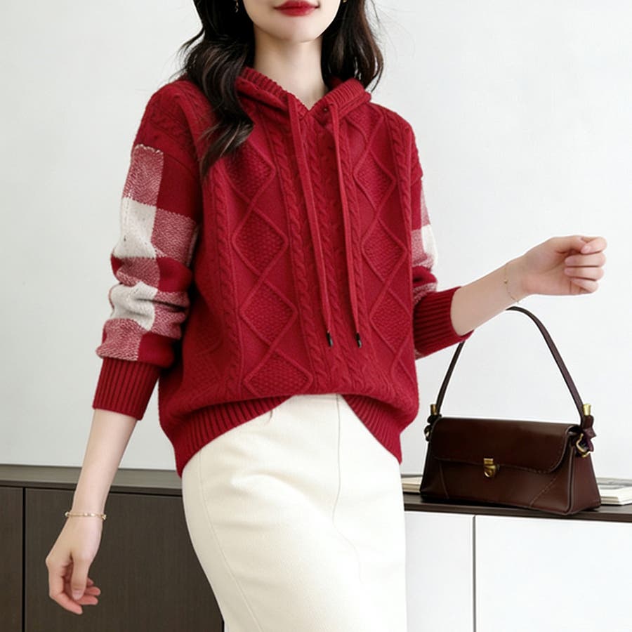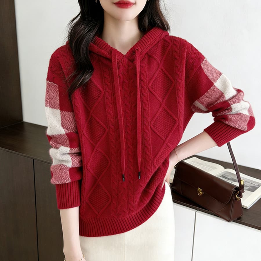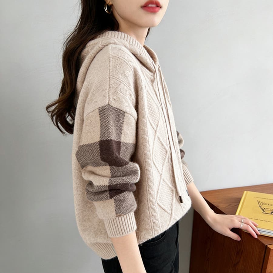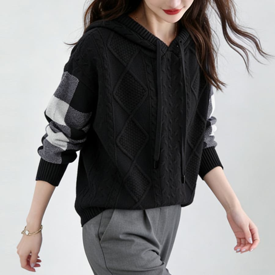 ケーブル編みの立体感とフード付きデザインが魅力の長袖ニット。