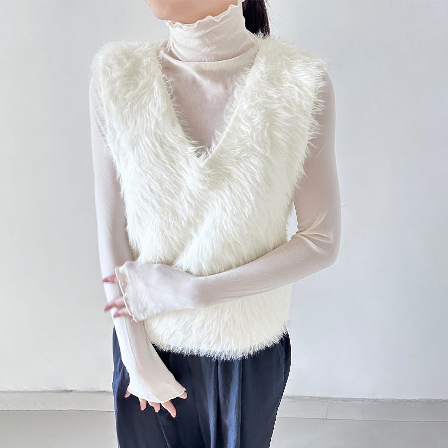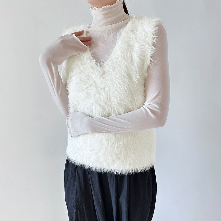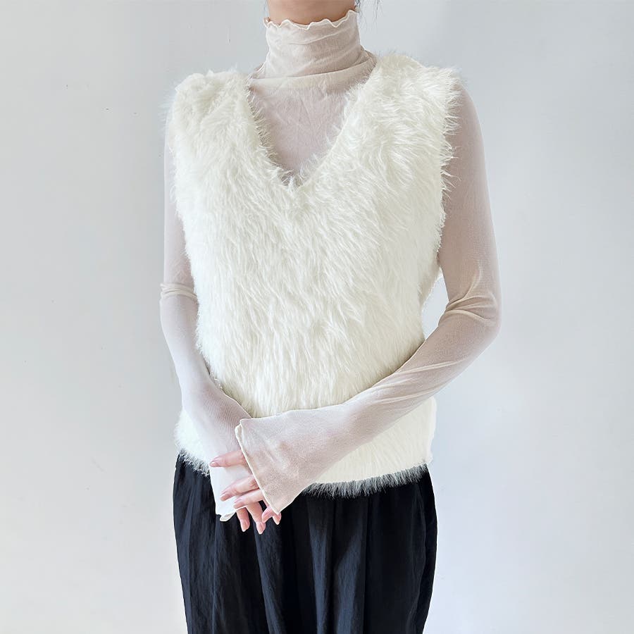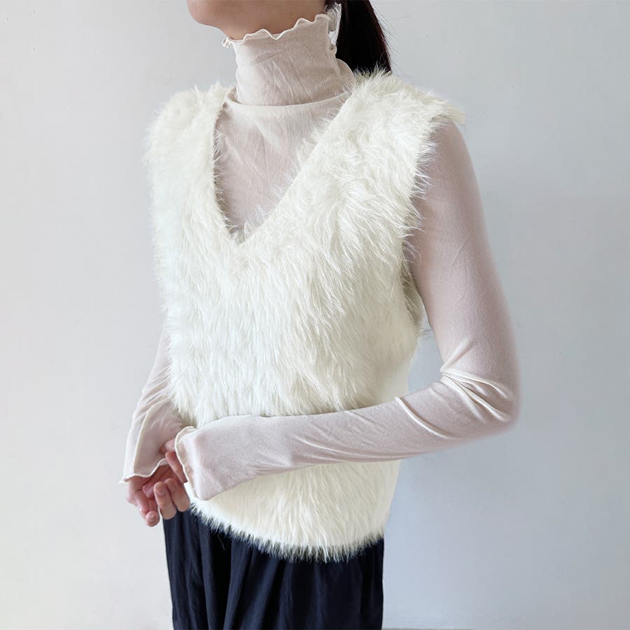 ふんわりとした毛並みが、シンプルなコーデに華やかさを添えます。