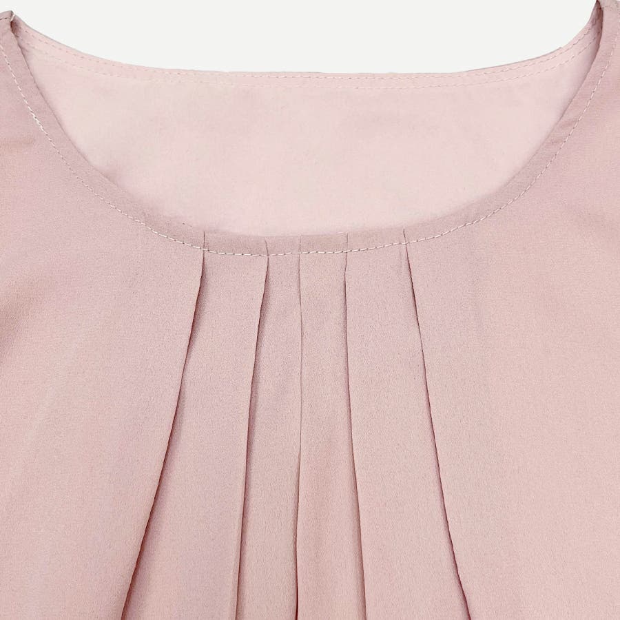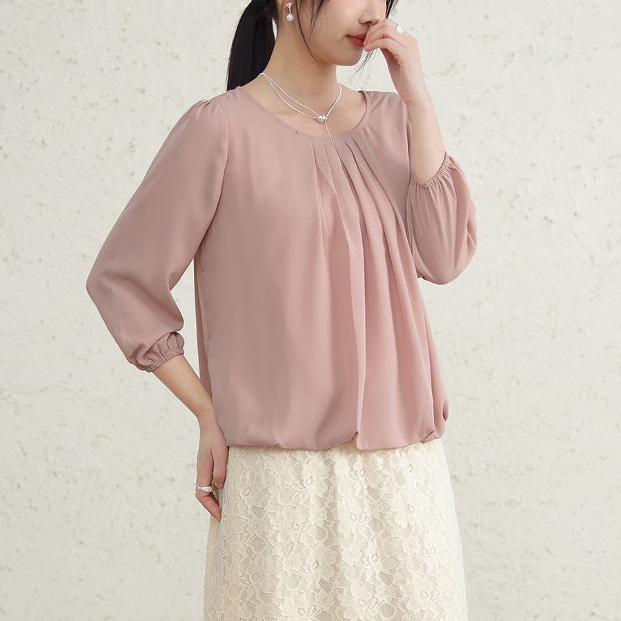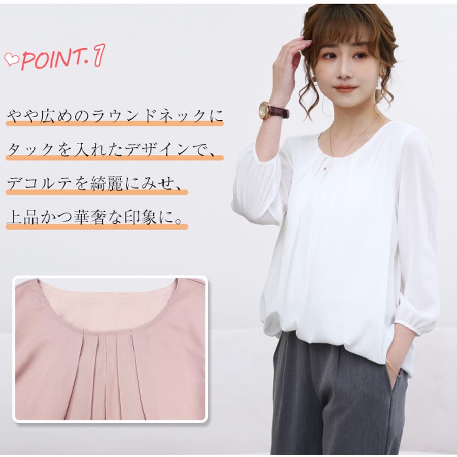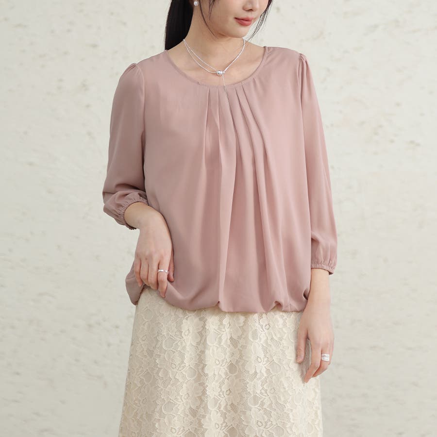 やや広めのラウンドネックにタックを入れたデザインで、デコルテを綺麗にみせ、上品かつ華奢な印象に。