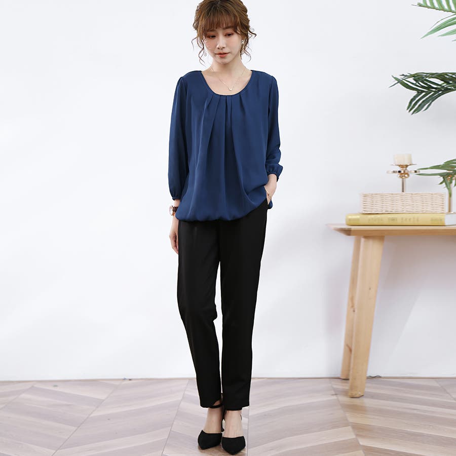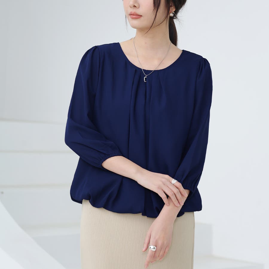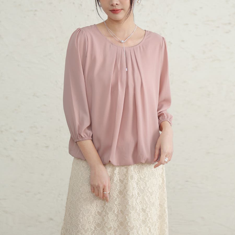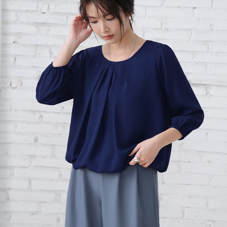 やや広めのラウンドネックにタックを入れたデザインで、デコルテを綺麗にみせ、上品かつ華奢な印象に。