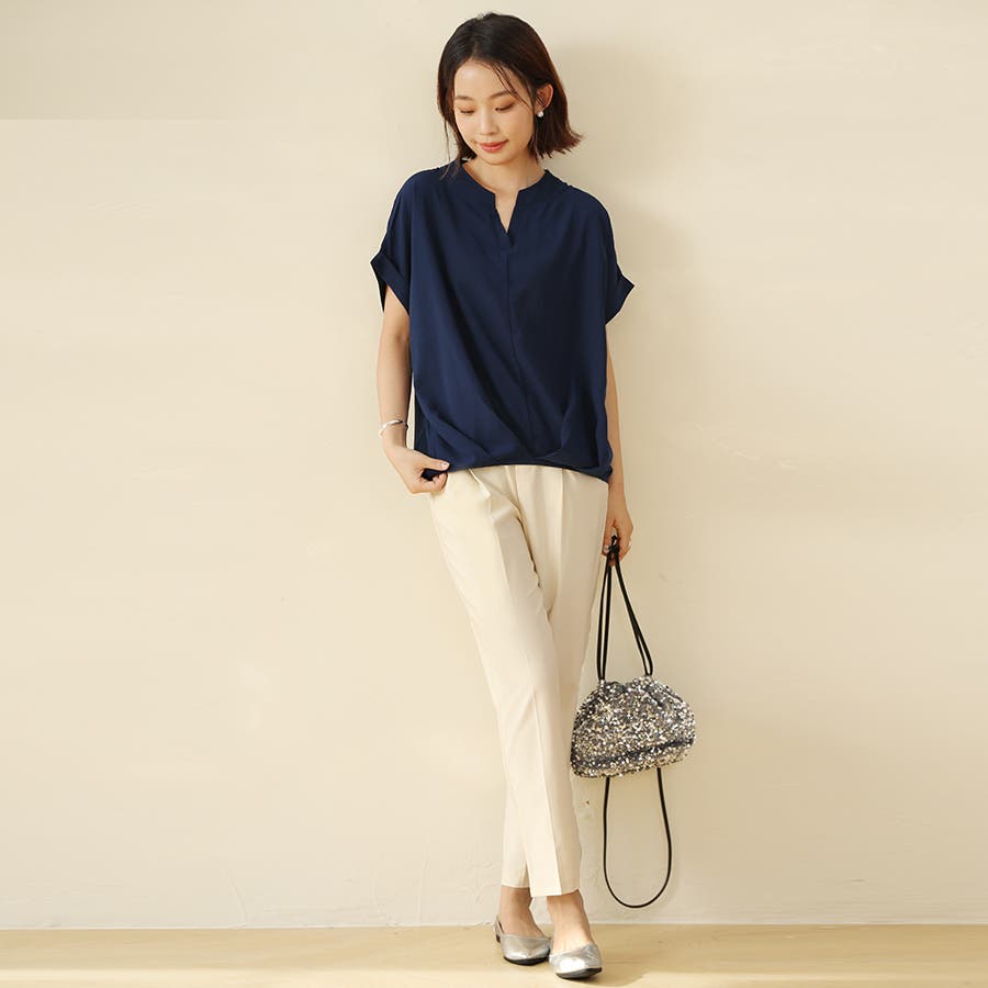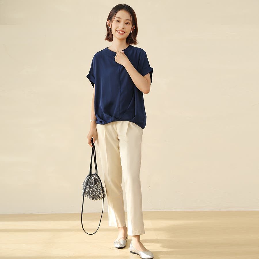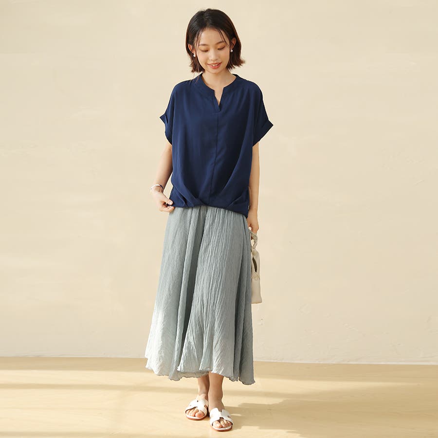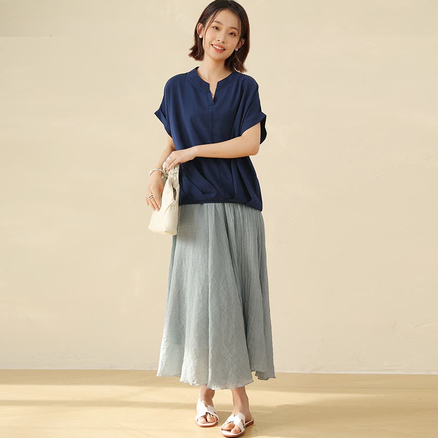 生地がサラサラしていて涼しいです。ネイビーを購入しましたが、色味は明るいネイビーでした。細身のパンツと合わせています。