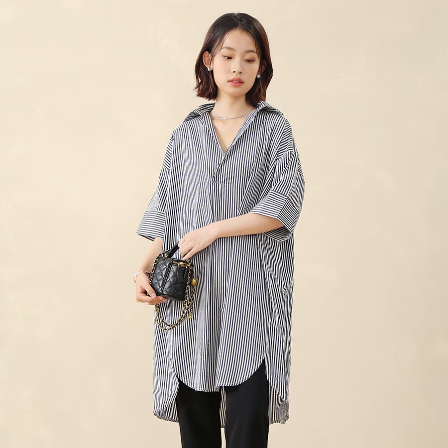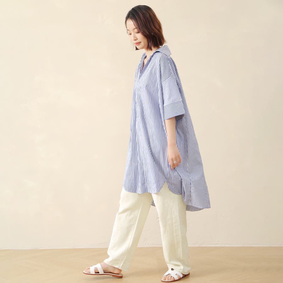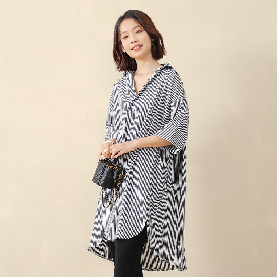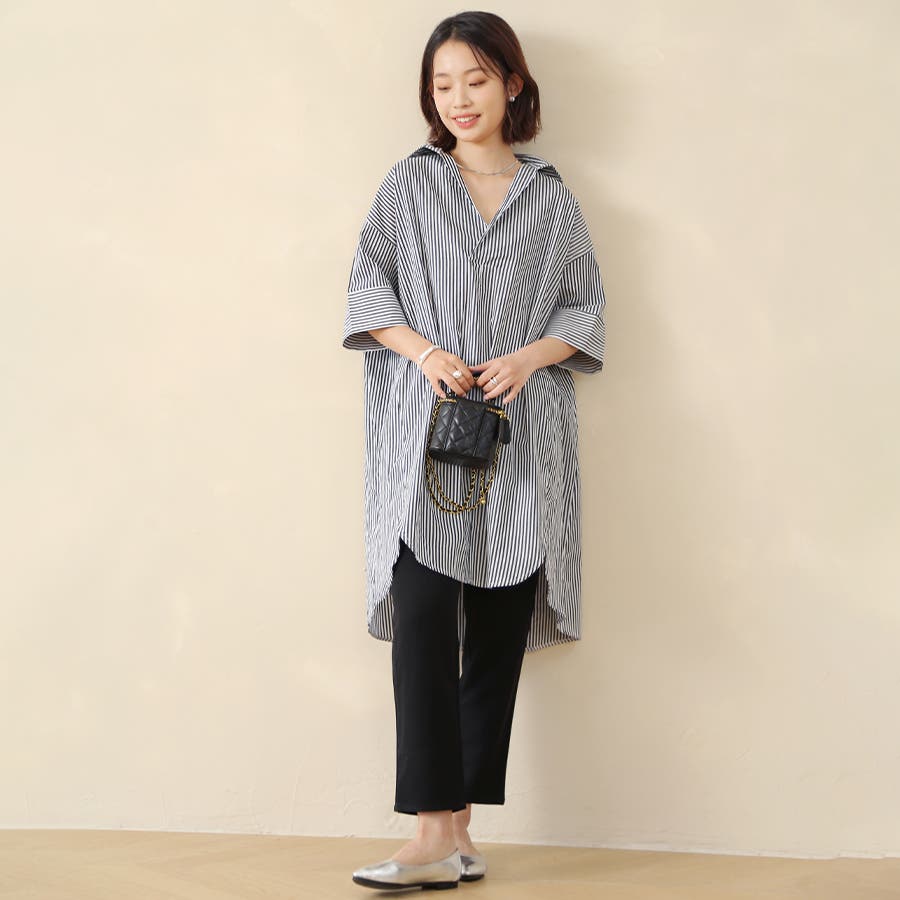 細ストライプが涼しげな夏らしさを演出し、軽やかで清楚な着こなしに。