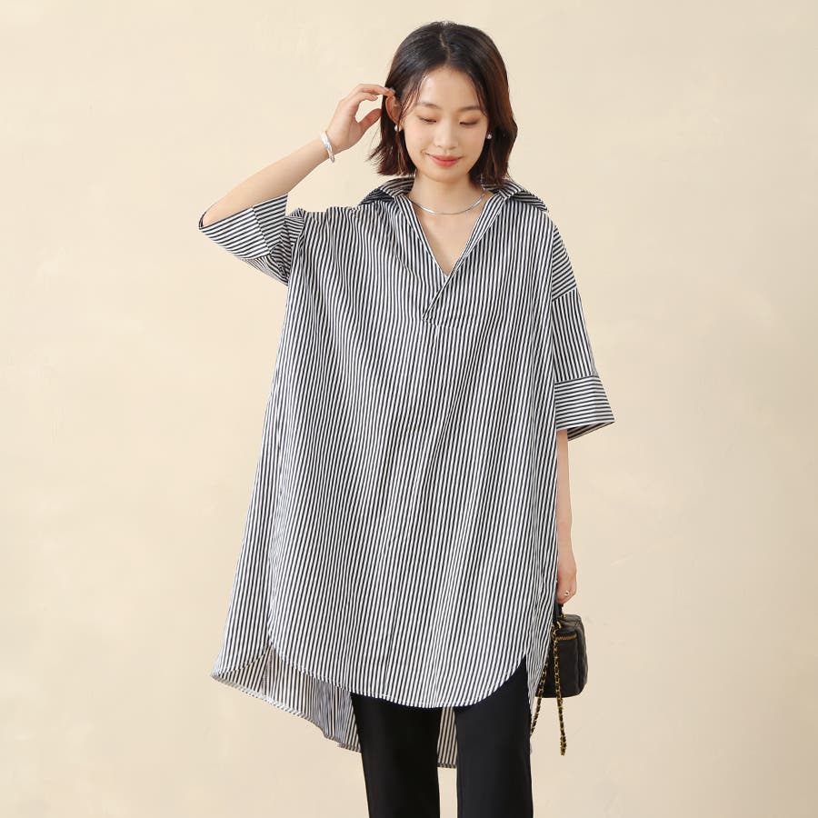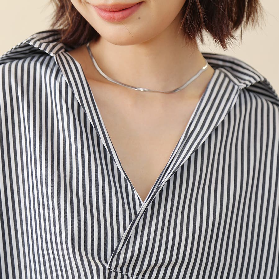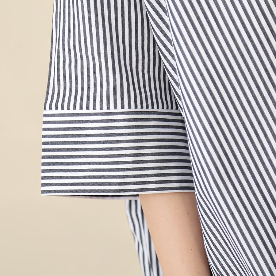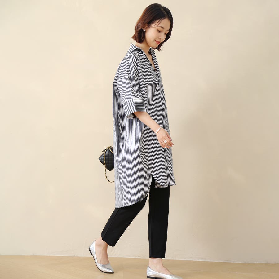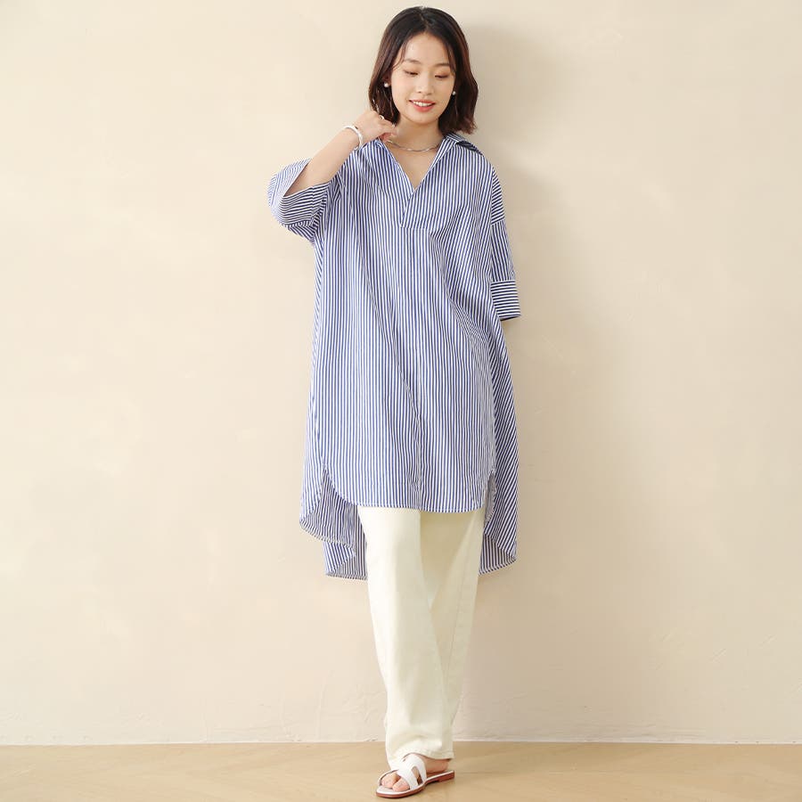 細ストライプが涼しげな夏らしさを演出し、軽やかで清楚な着こなしに。