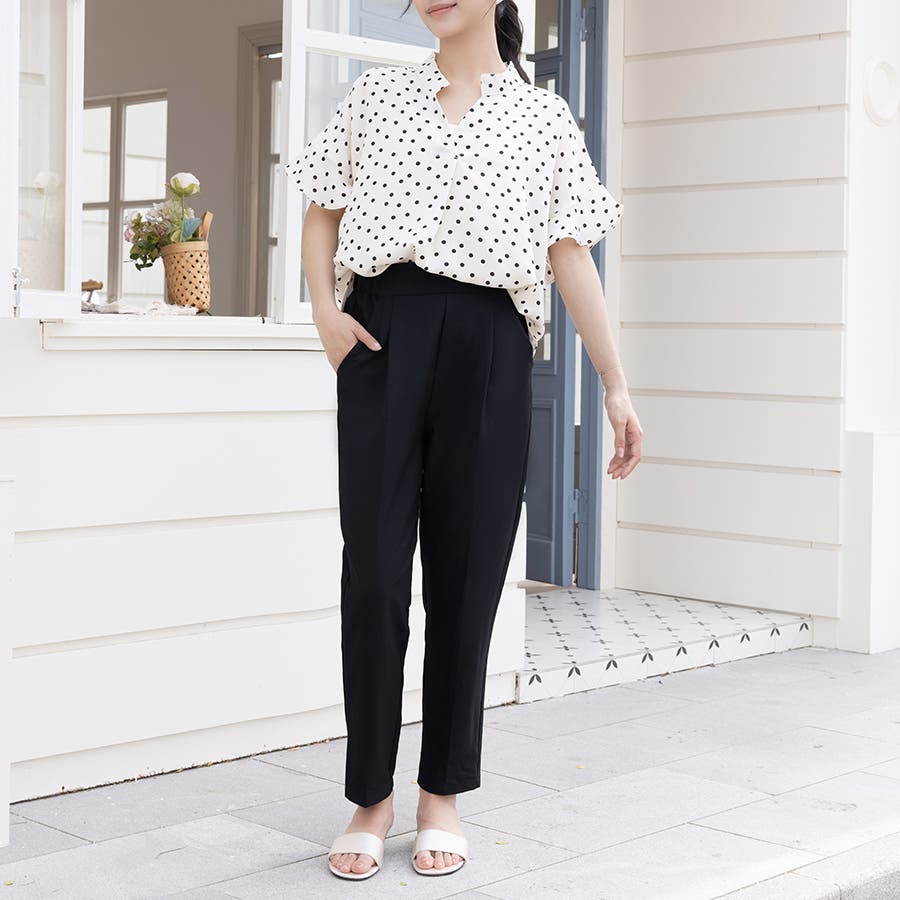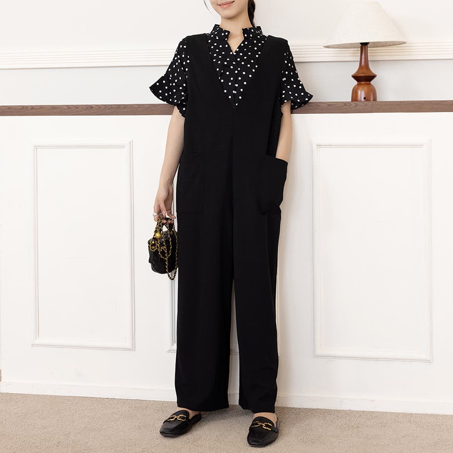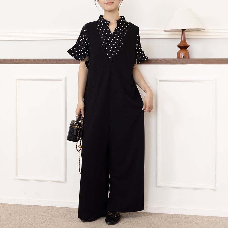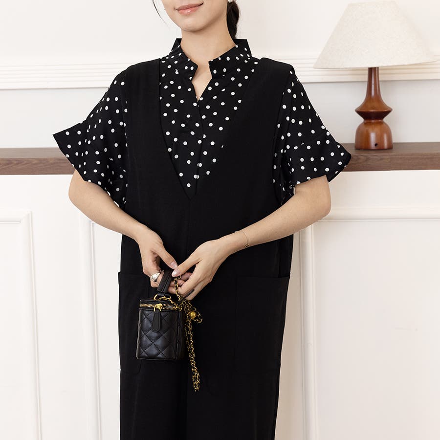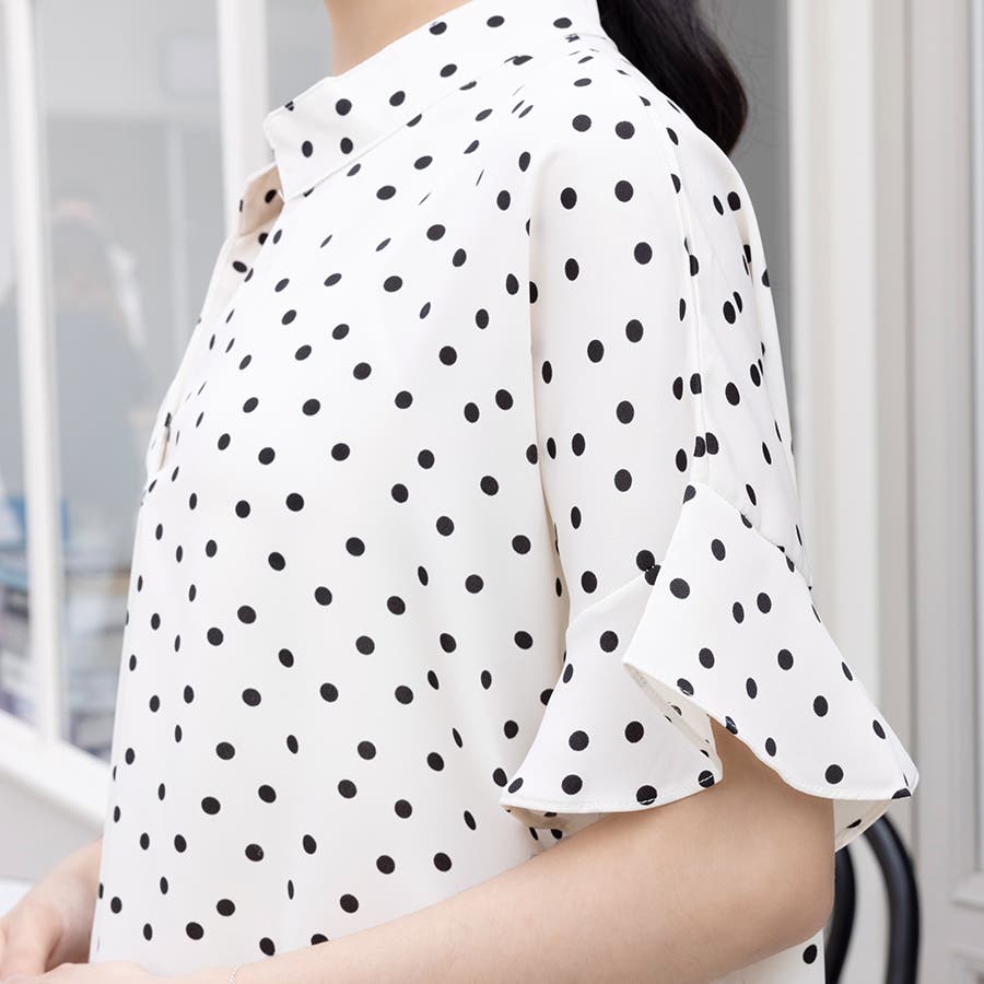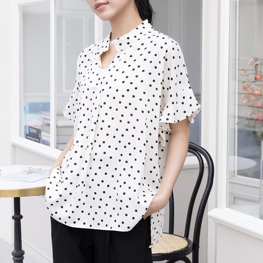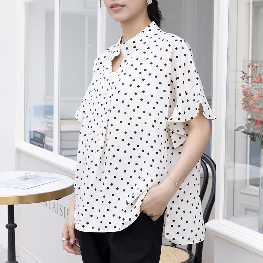 ドロップショルダーにフリル付きスリーブで、大人かわいい雰囲気に。