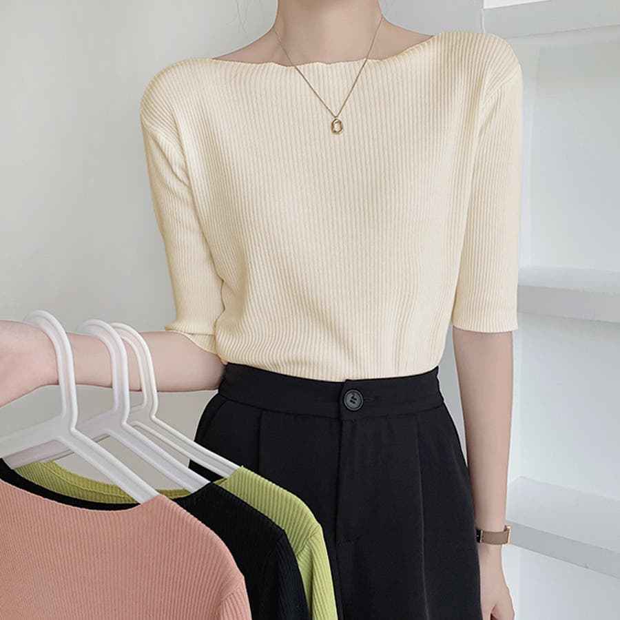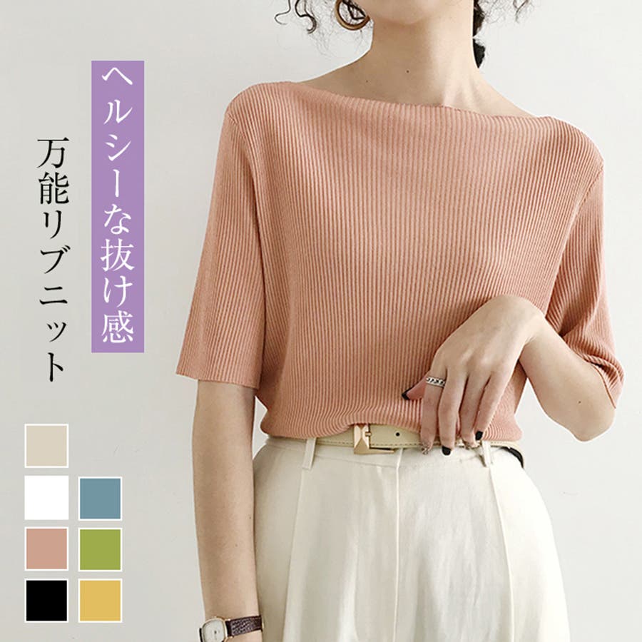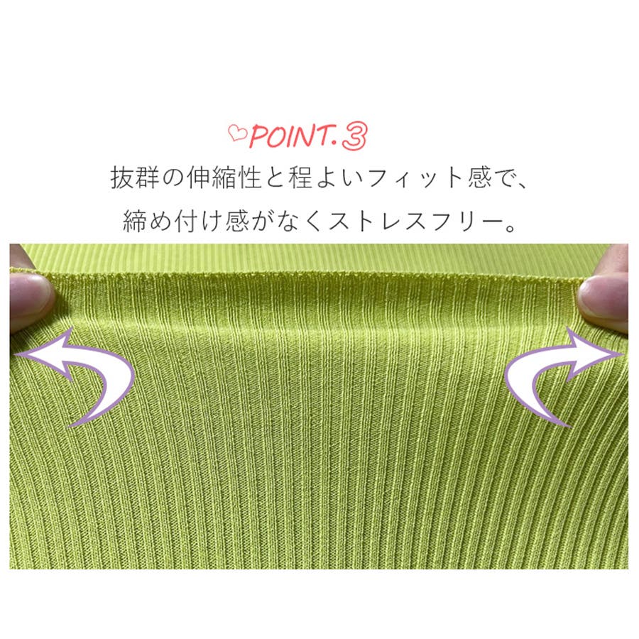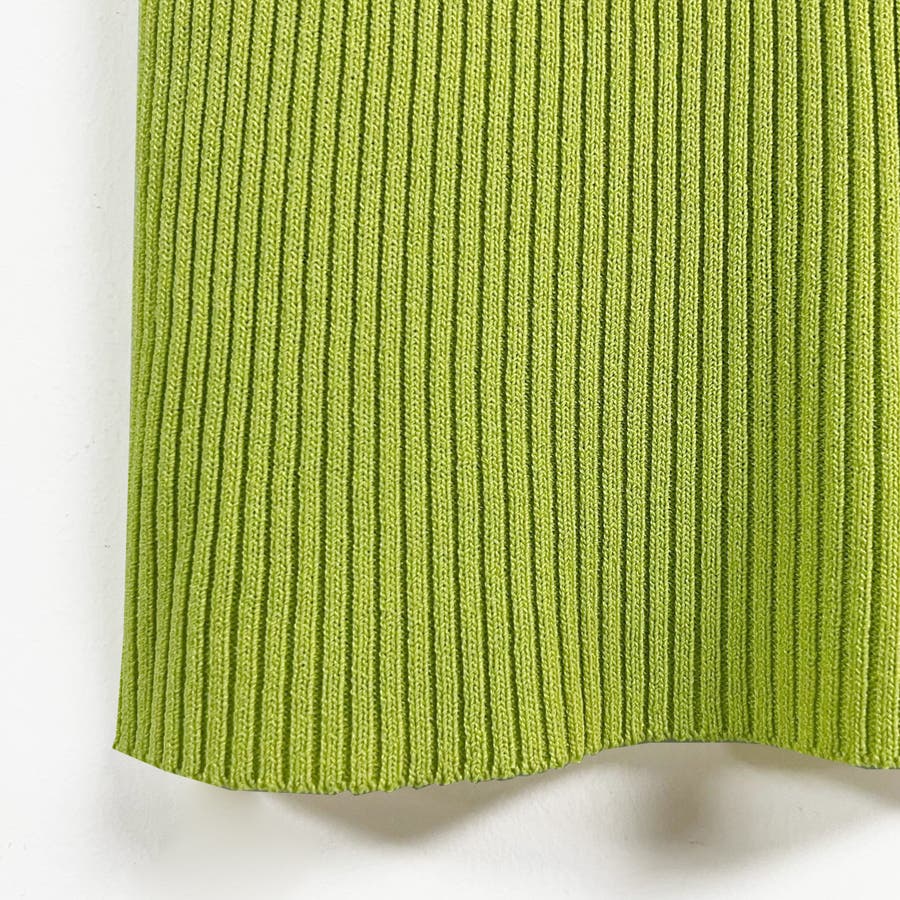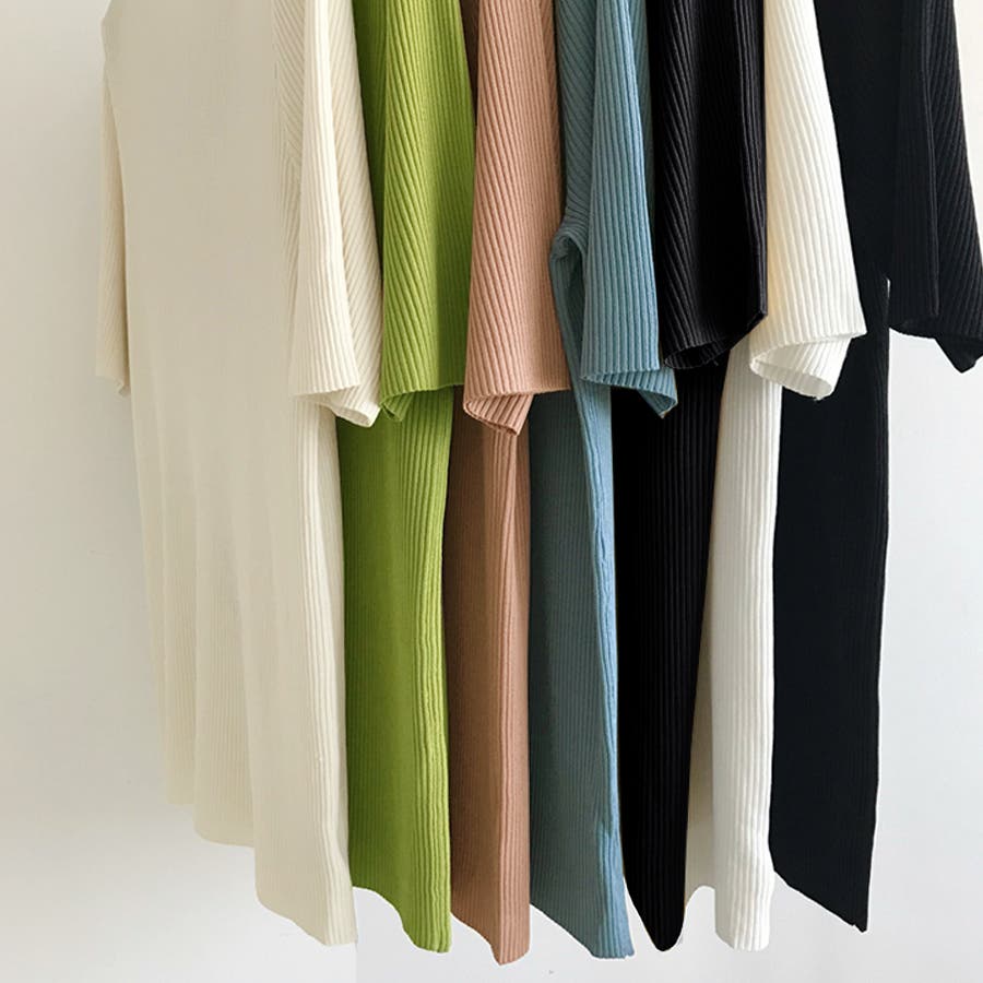 細めのリブニットは体のラインを細く見せ、すっきりとしたシルエットになります。