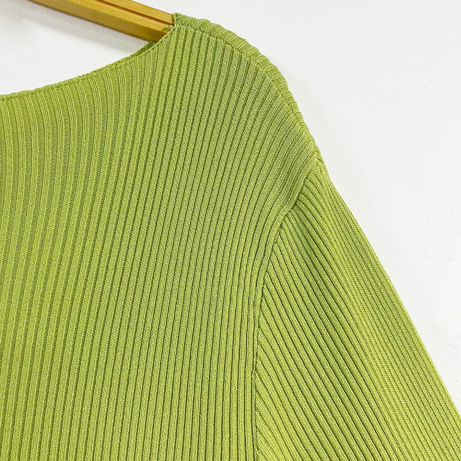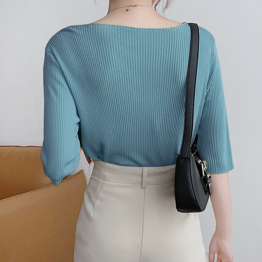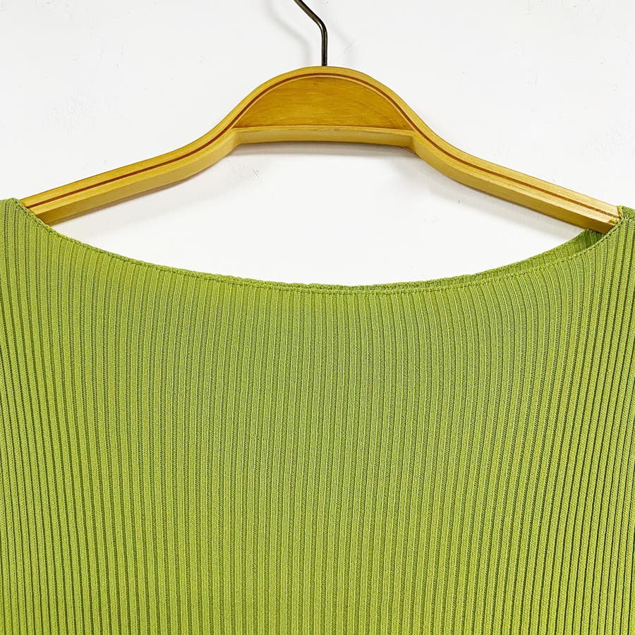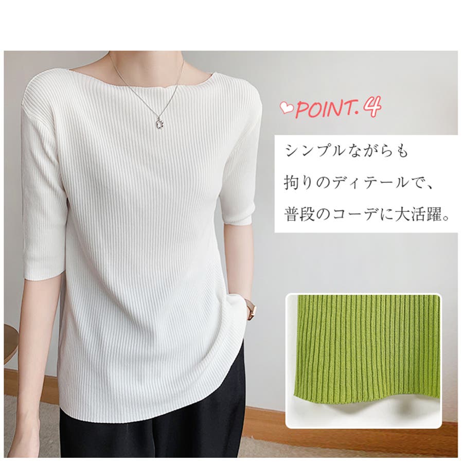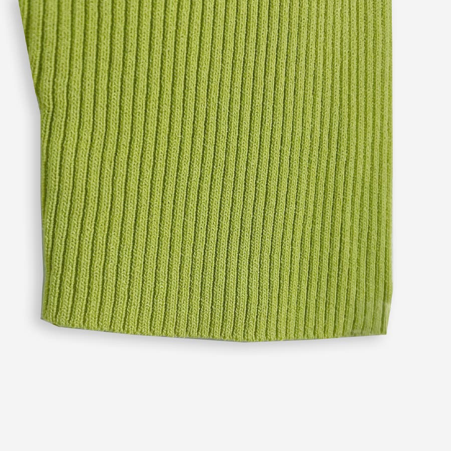 細めのリブニットは体のラインを細く見せ、すっきりとしたシルエットになります。