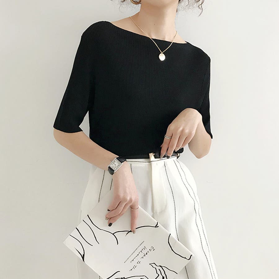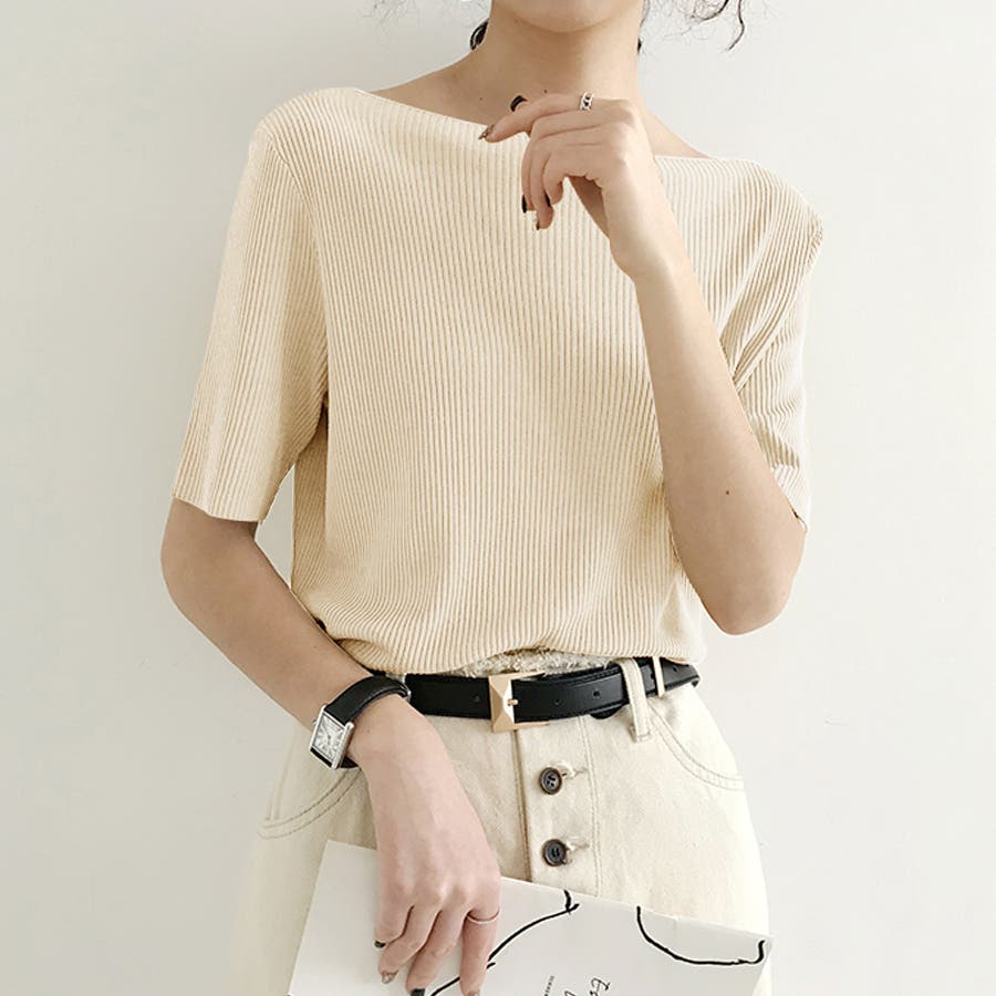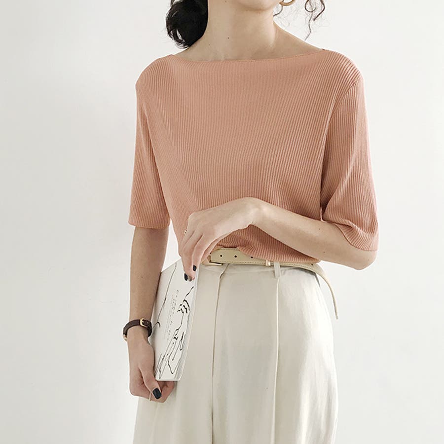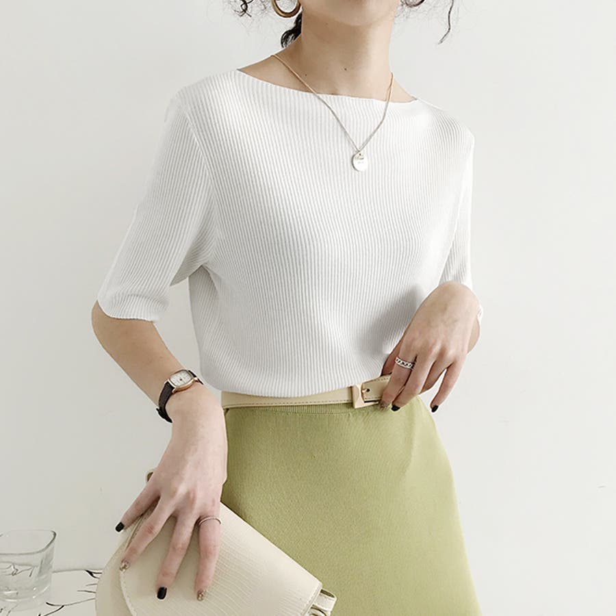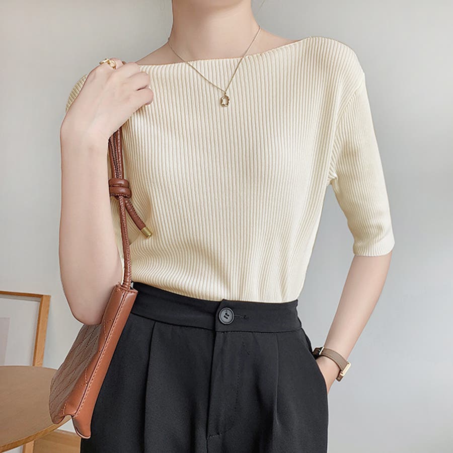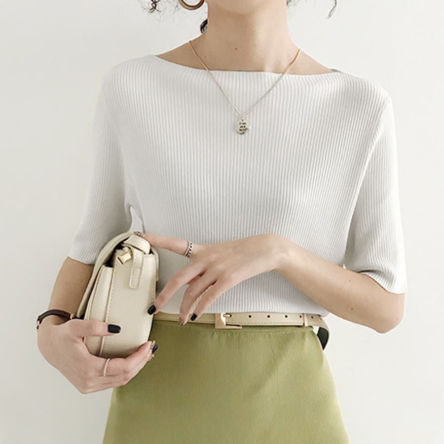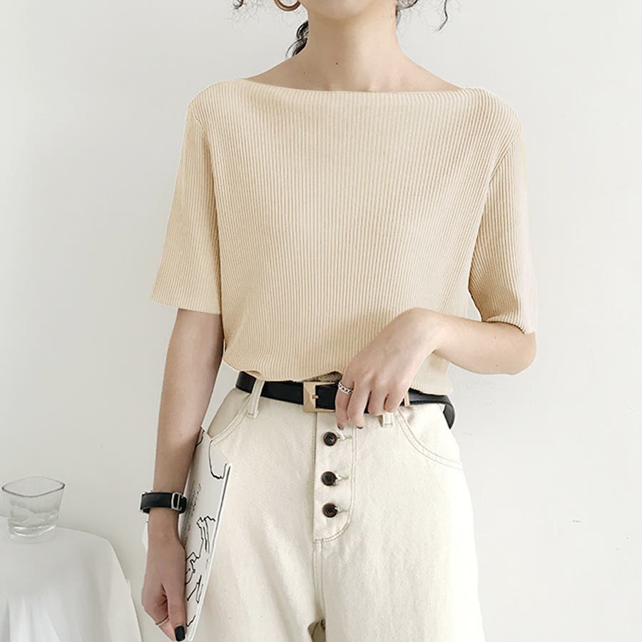 ヘルシーなボードネックでデコルテラインを綺麗に見せ、力まないこなれ感を演出します。