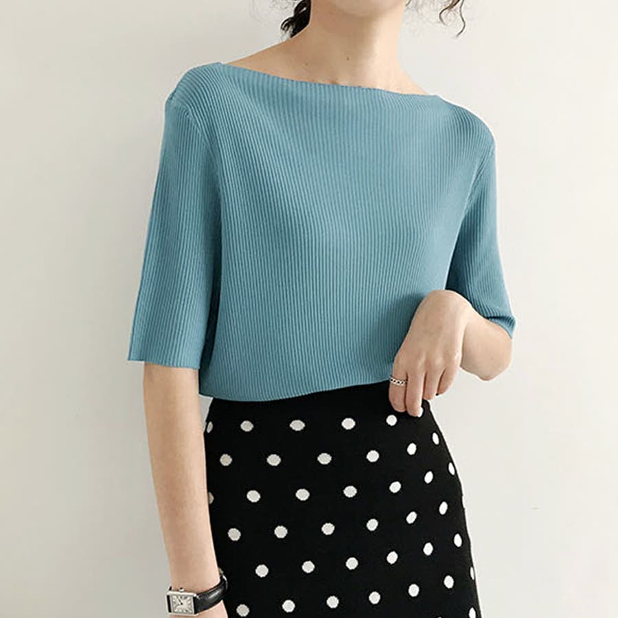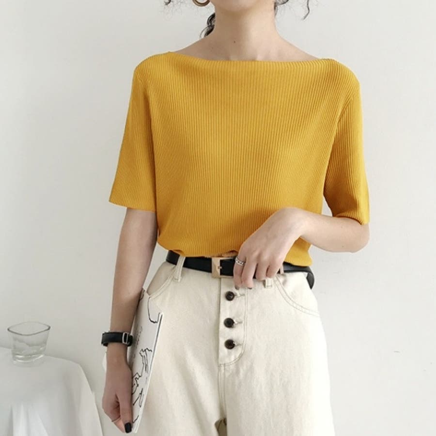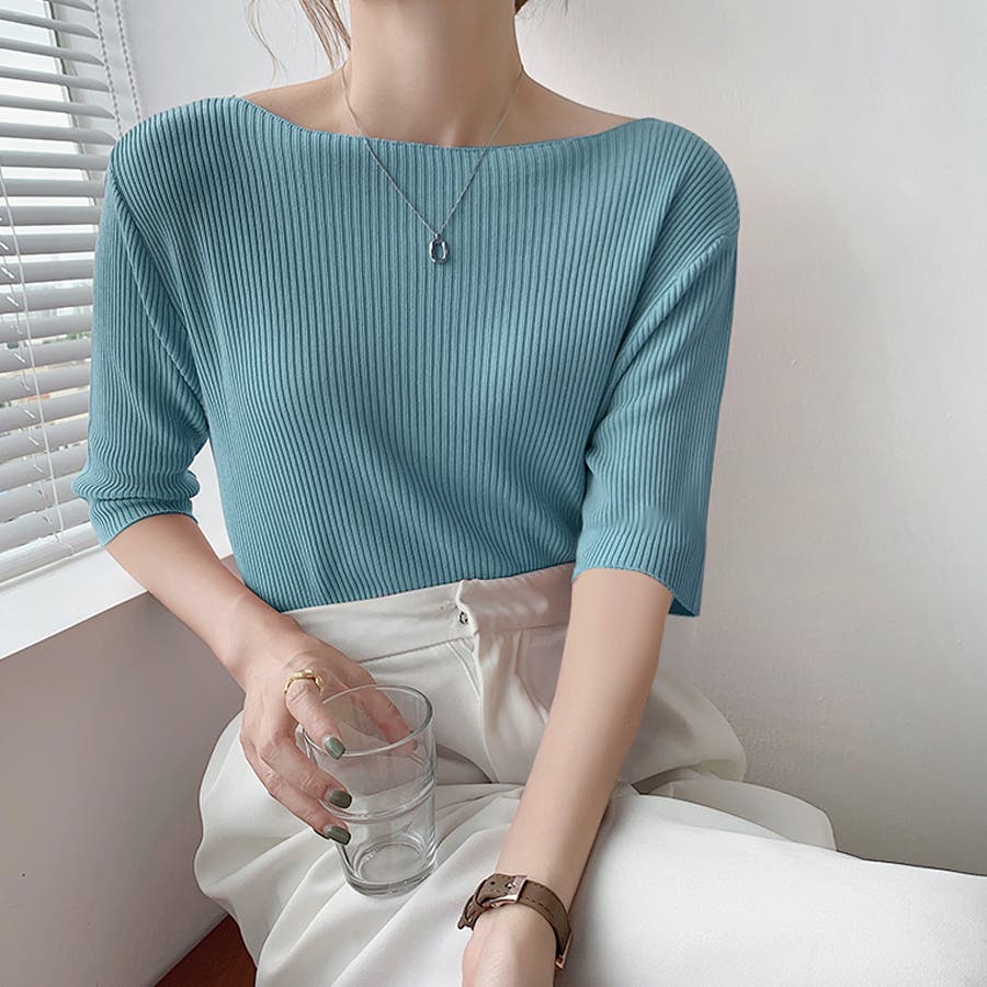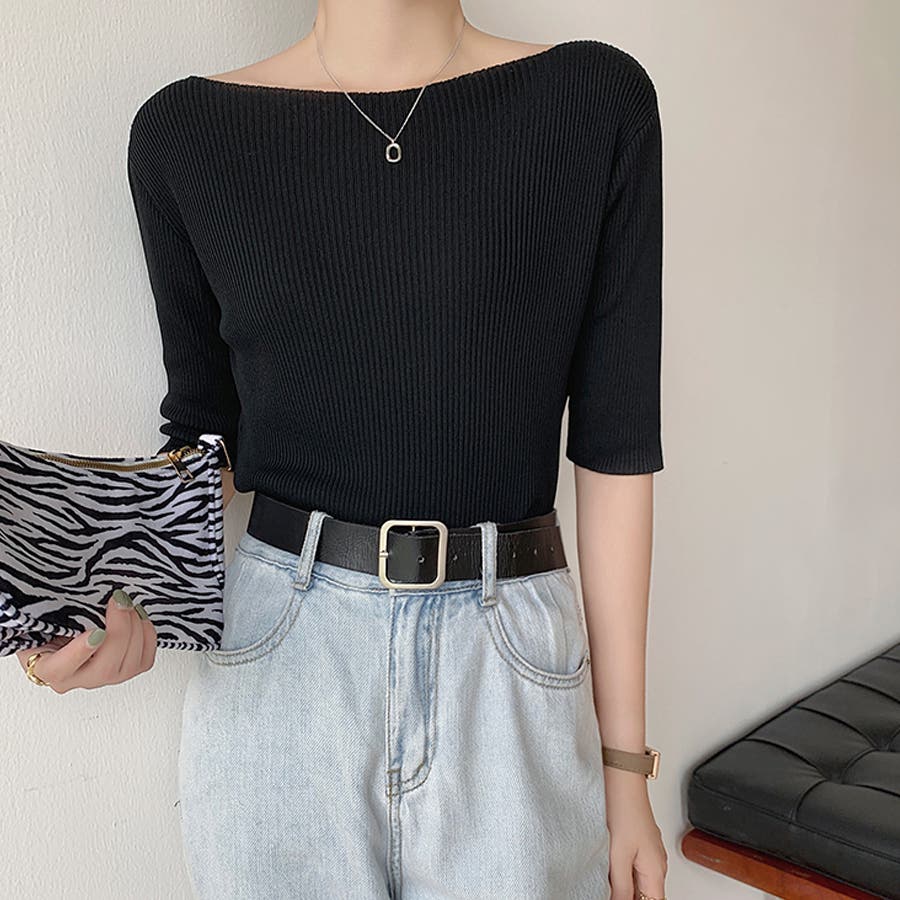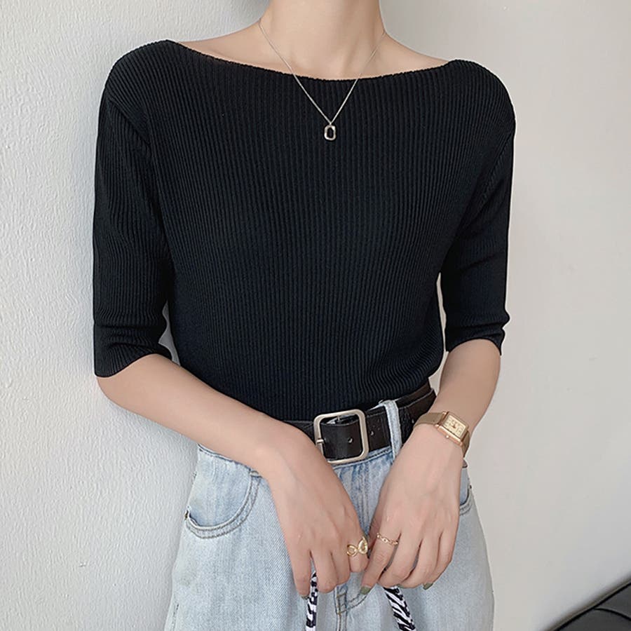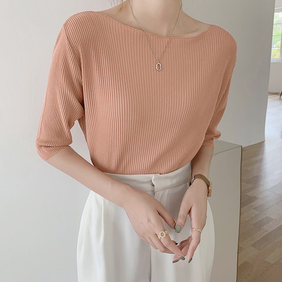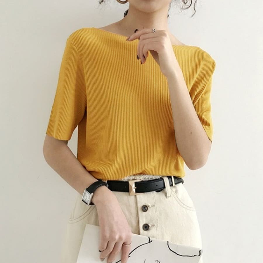 ヘルシーなボードネックでデコルテラインを綺麗に見せ、力まないこなれ感を演出します。
