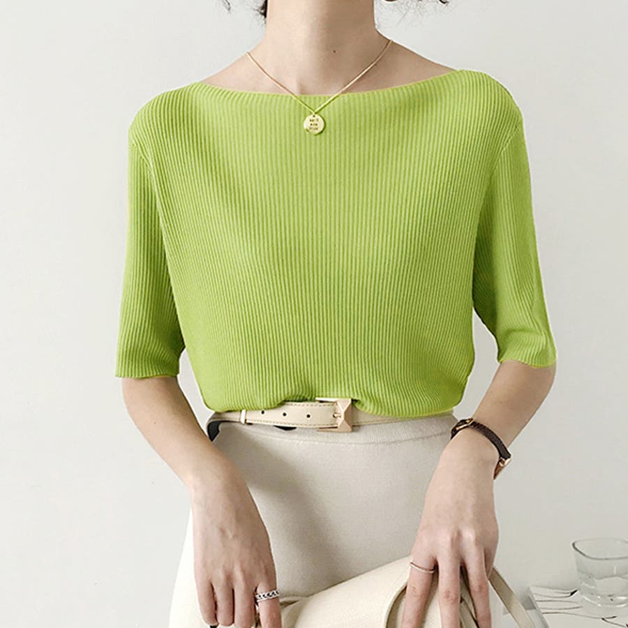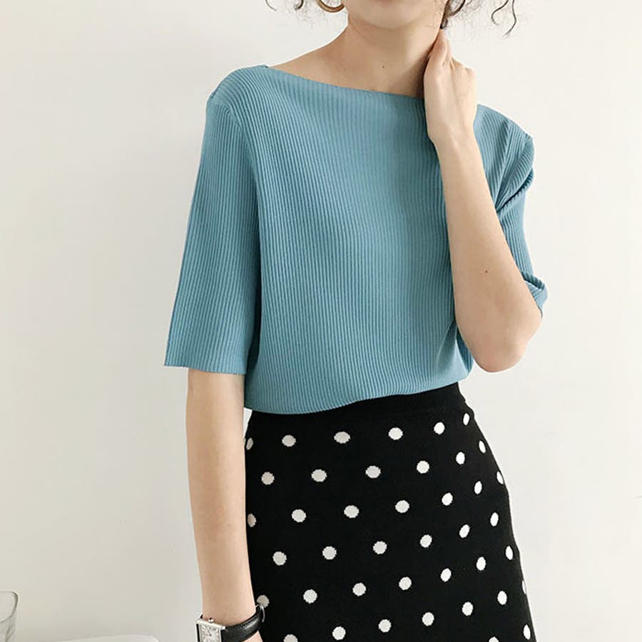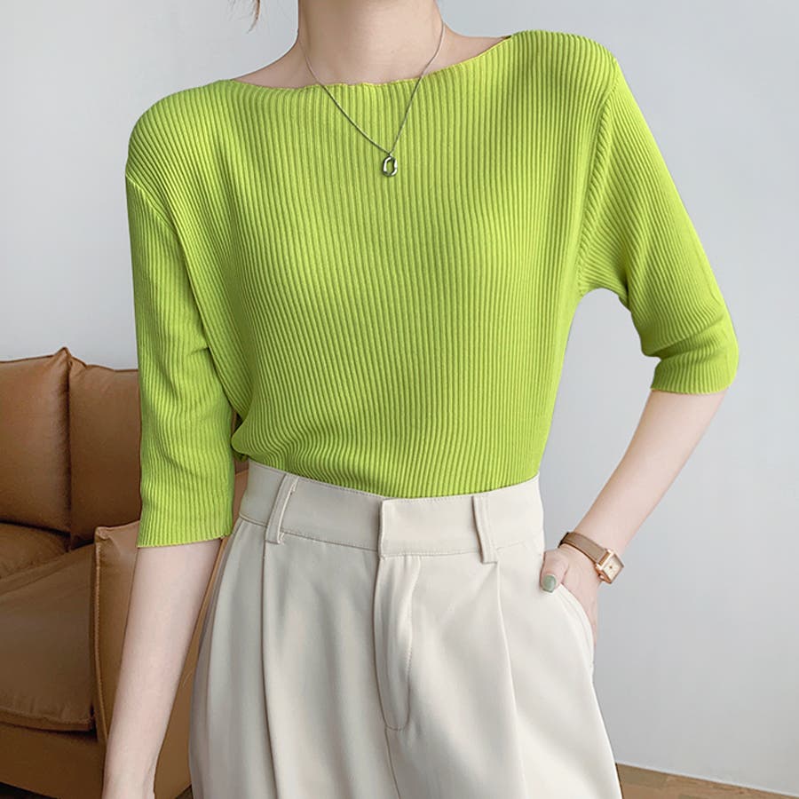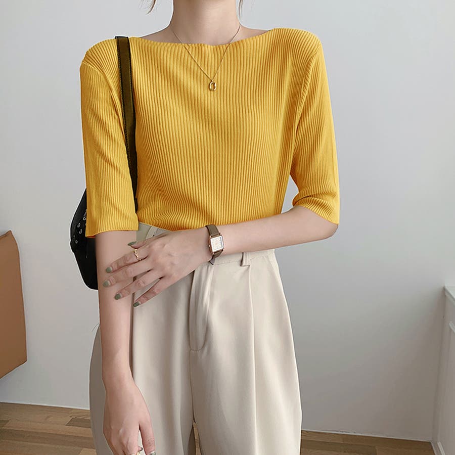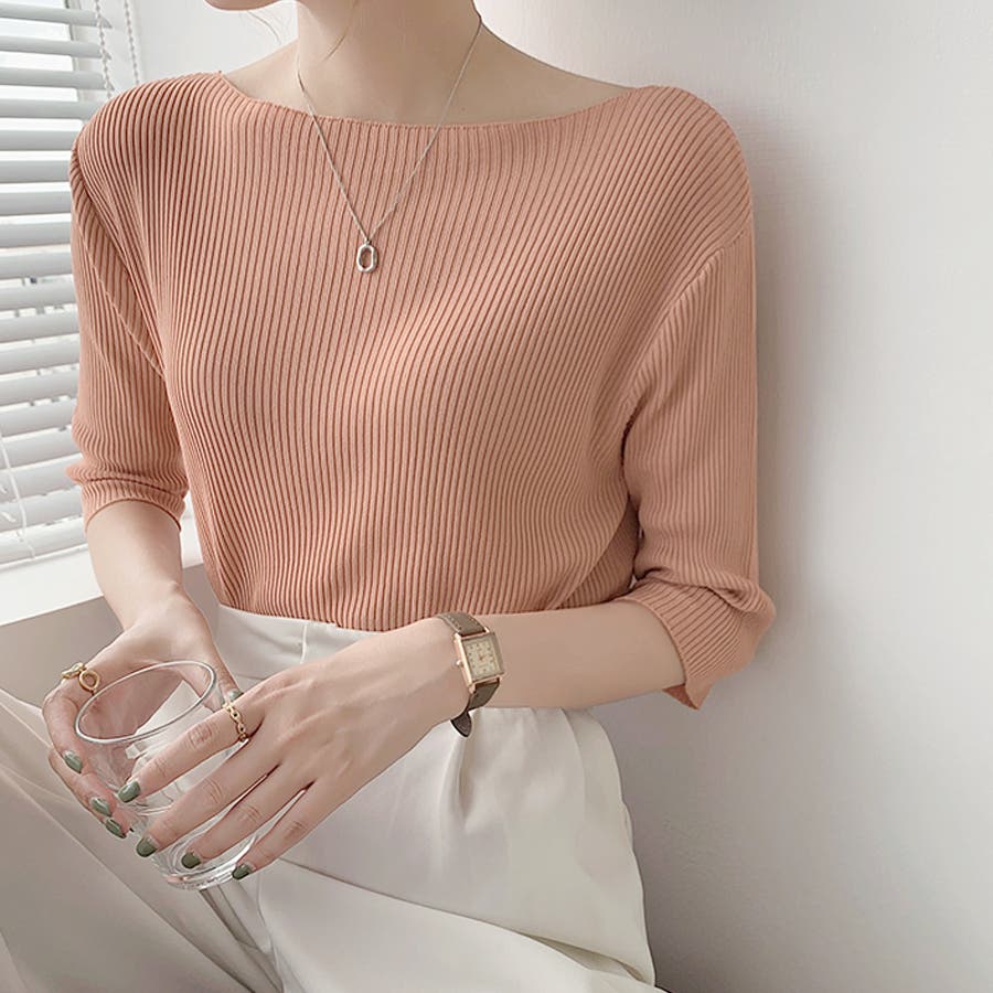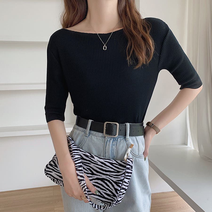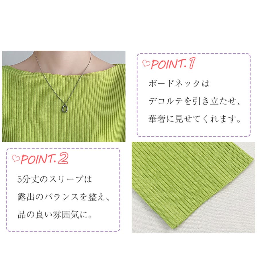 ヘルシーなボードネックでデコルテラインを綺麗に見せ、力まないこなれ感を演出します。