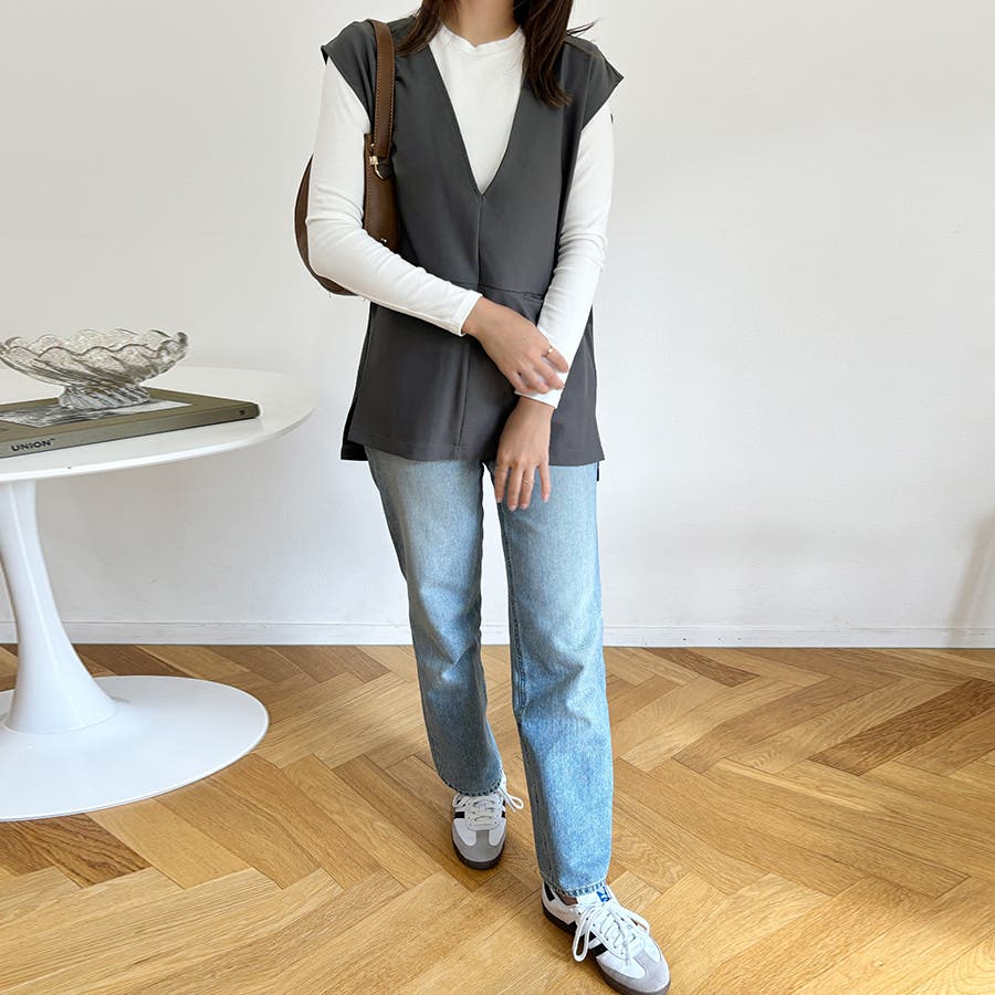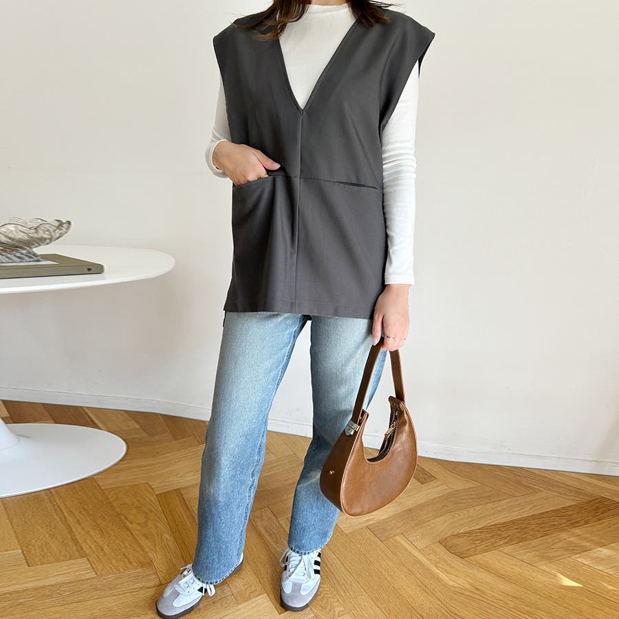 ディープVネックは顔回りをすっきり見せ、いろんなトップスとのレイヤードコーデにお勧め。