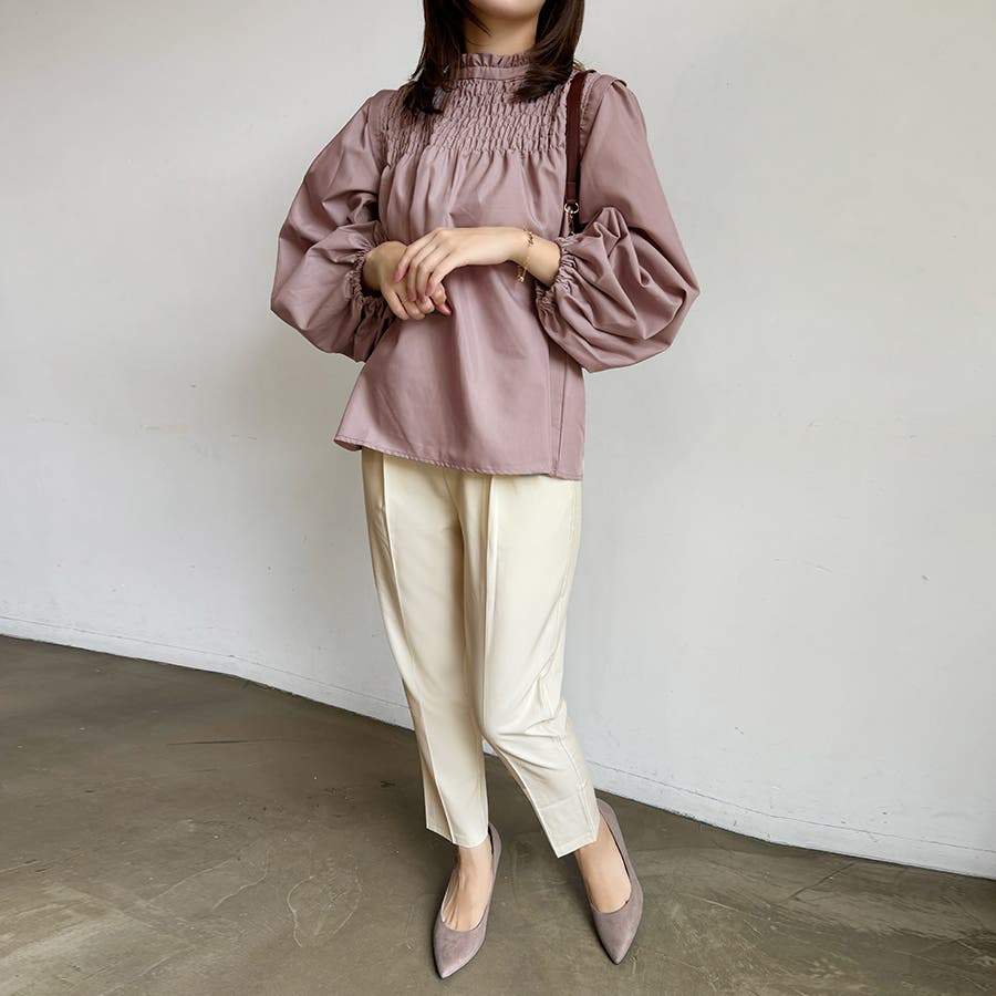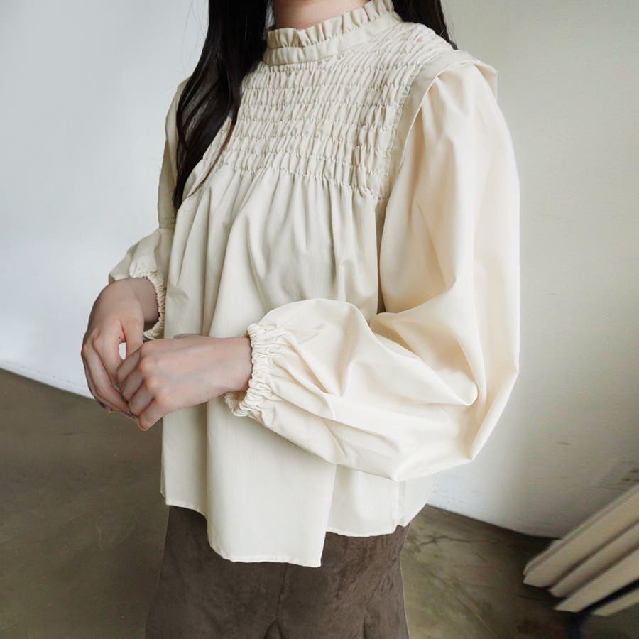 胸元にたっぷりとシャーリングを施したクラシカルなブラウス。