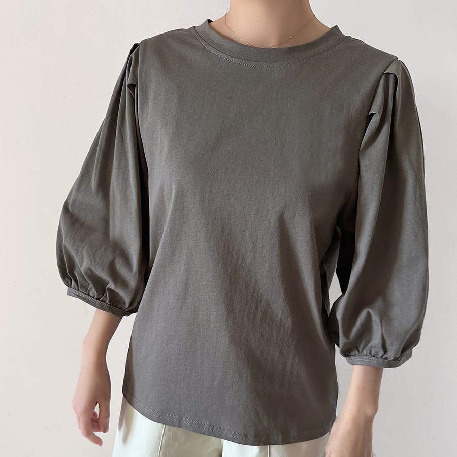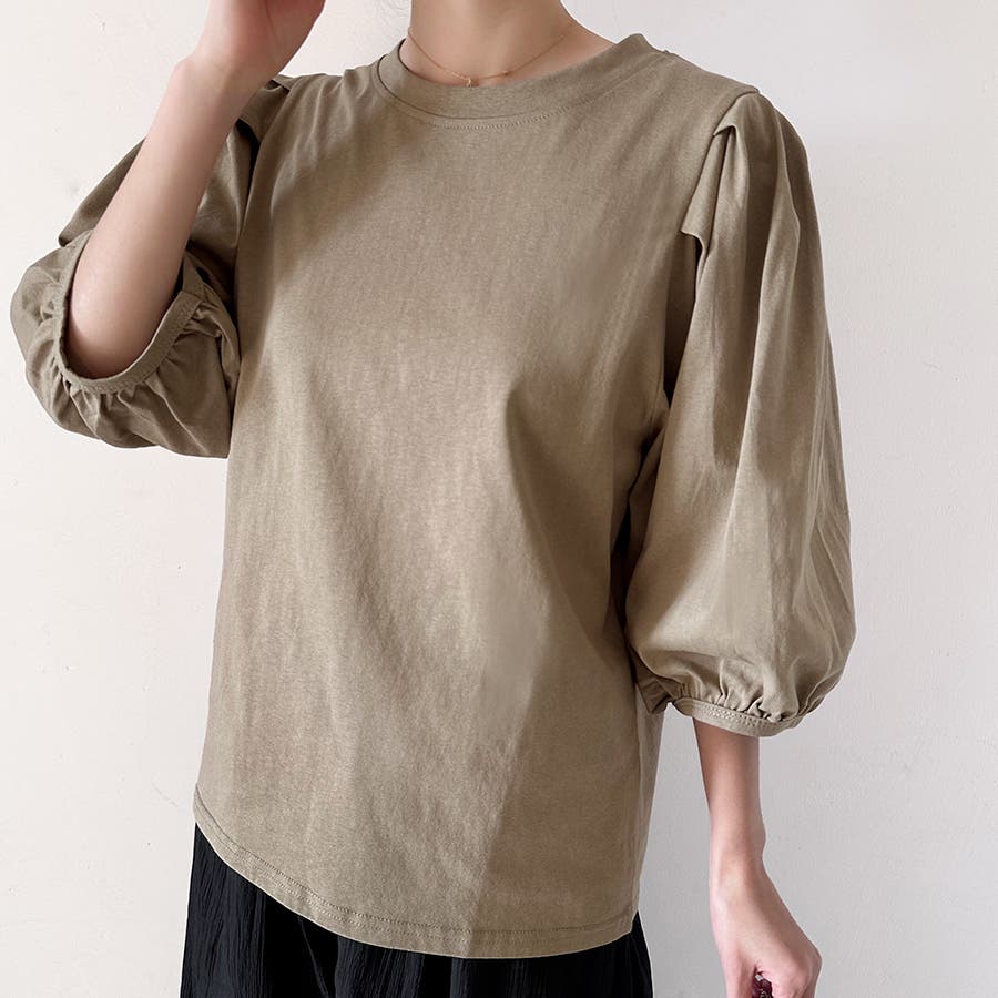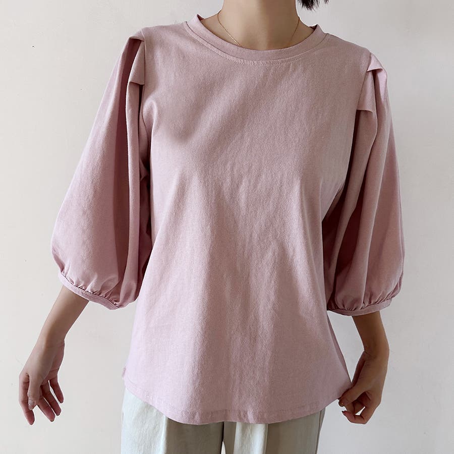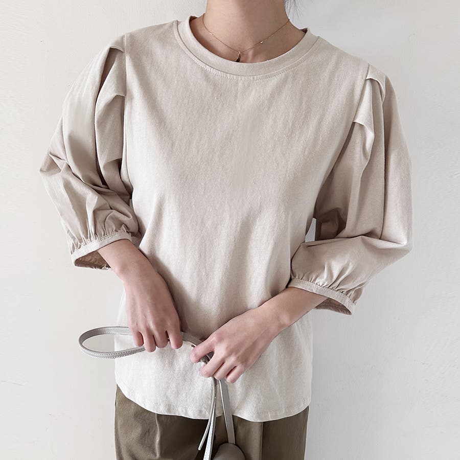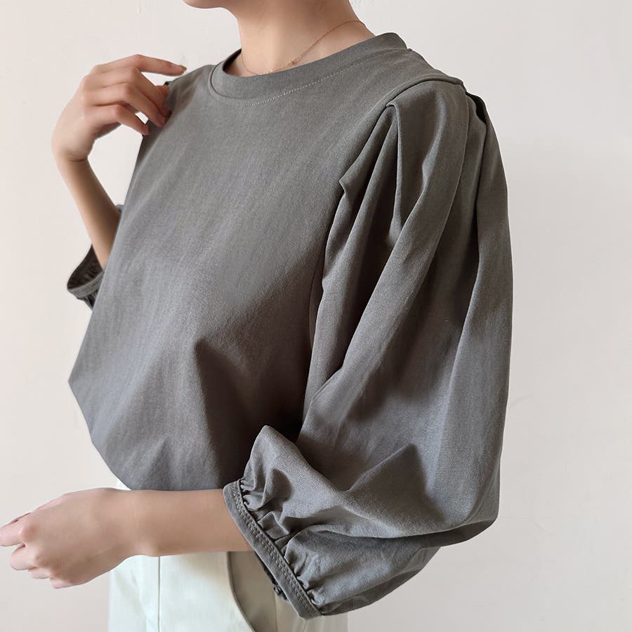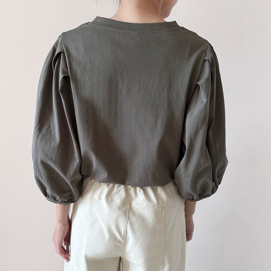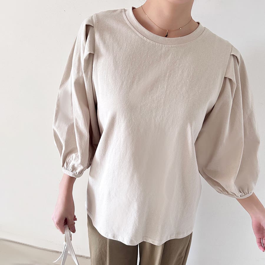 ボリュームスリーブでややボリューム感がありながら、ラウンドネックでスッキリ綺麗めに仕上げました。