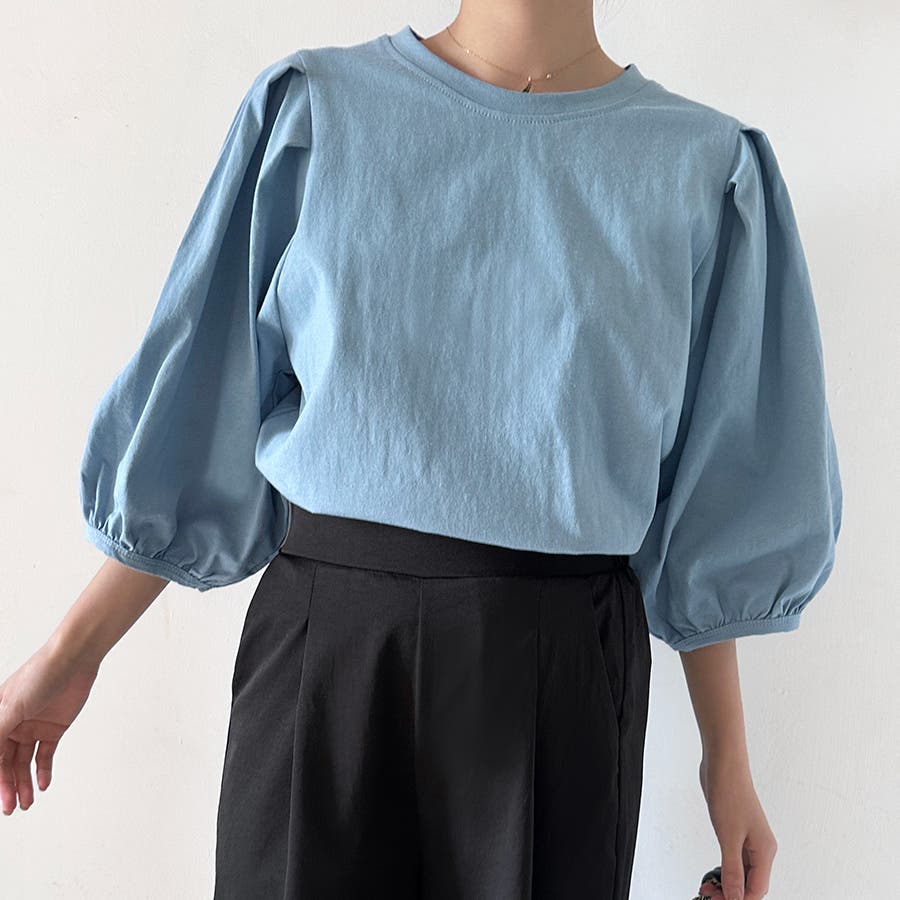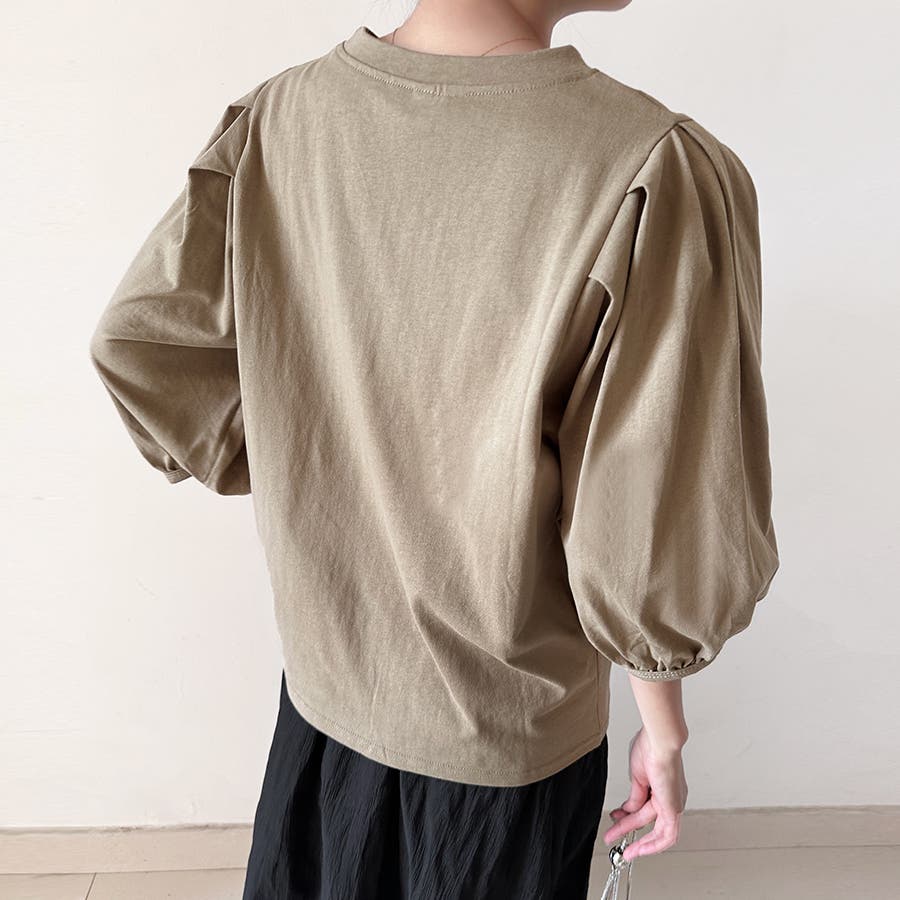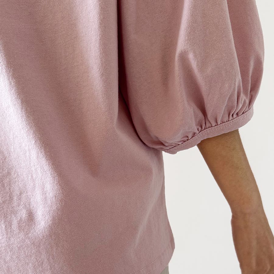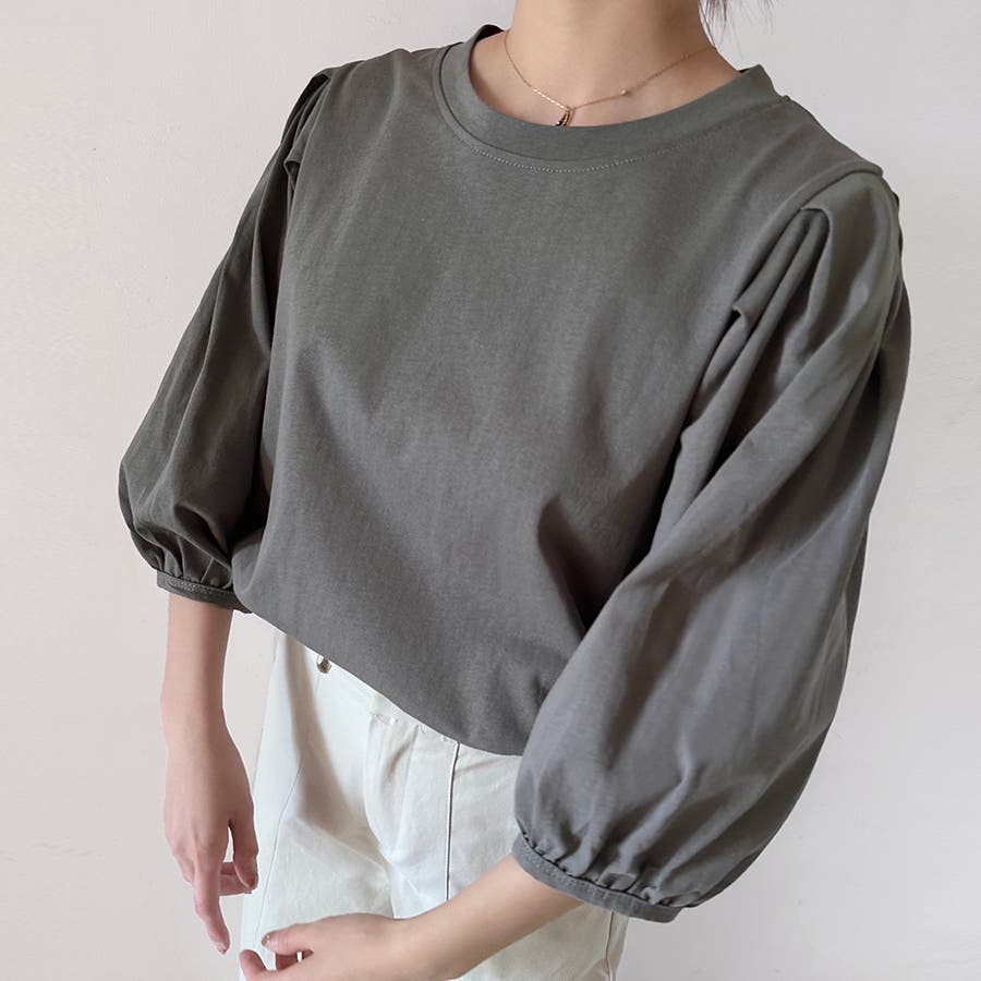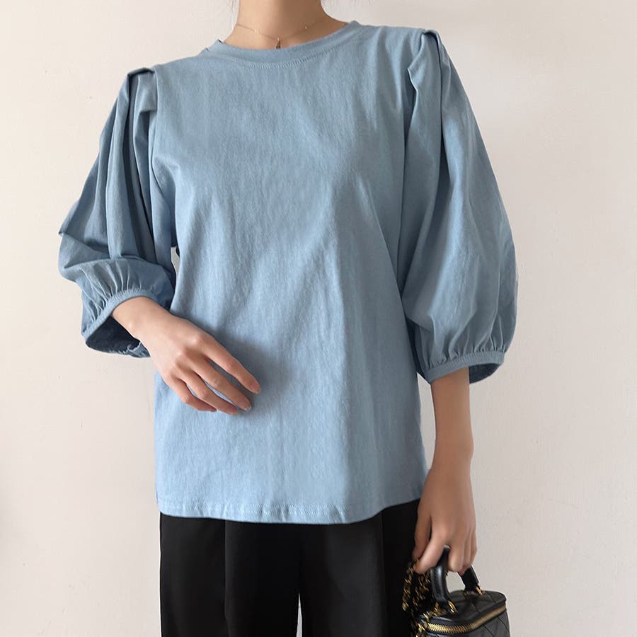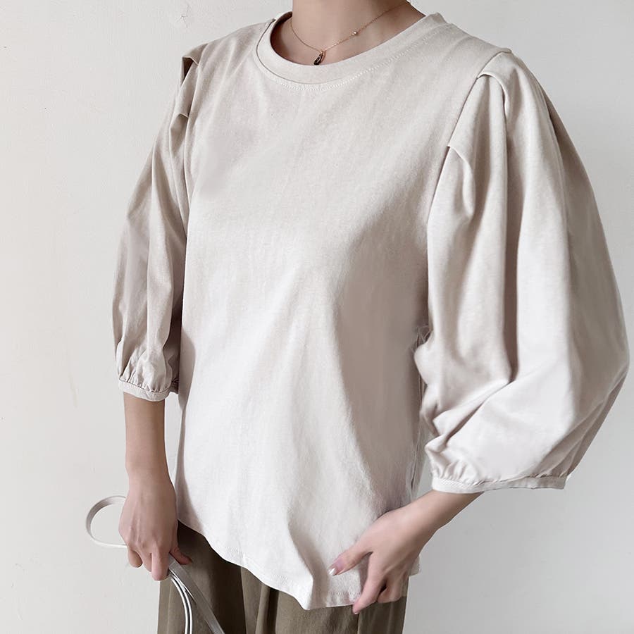ボリュームスリーブでややボリューム感がありながら、ラウンドネックでスッキリ綺麗めに仕上げました。